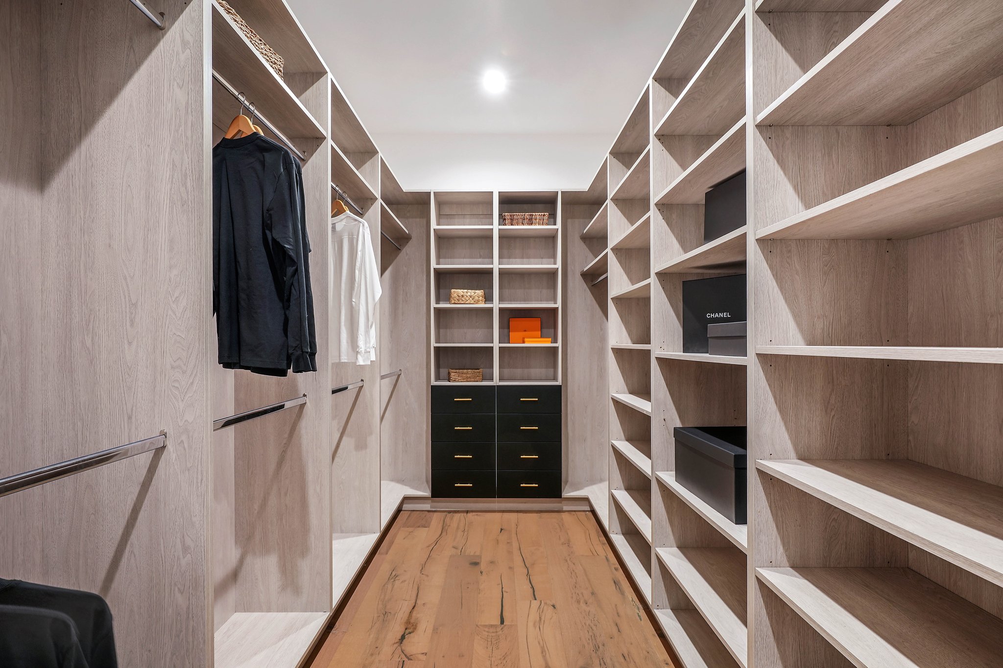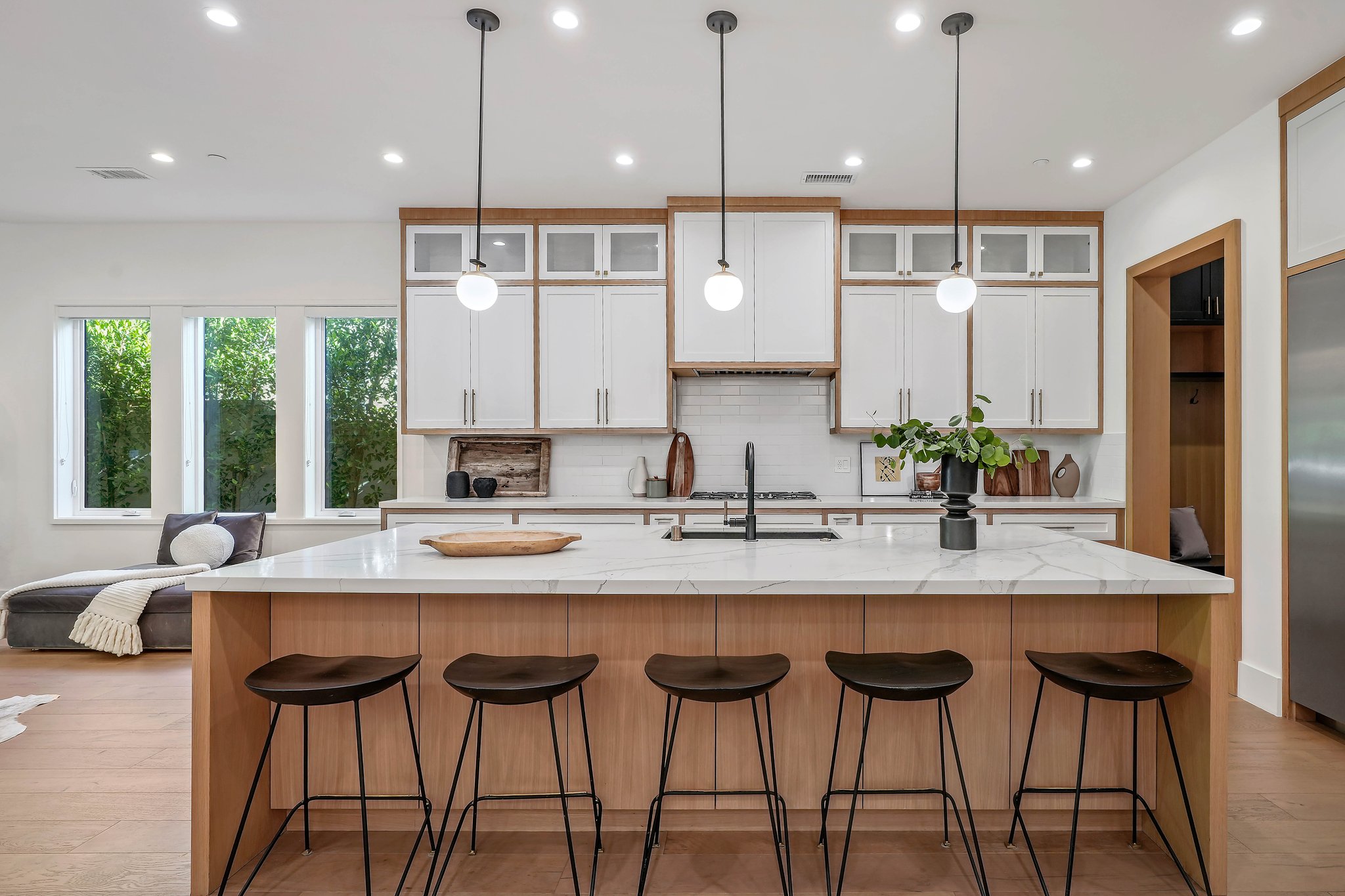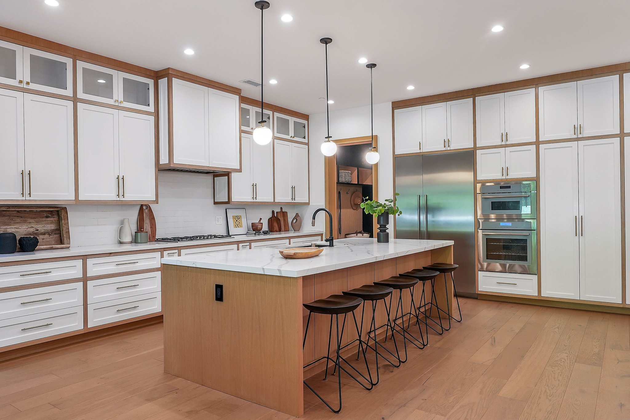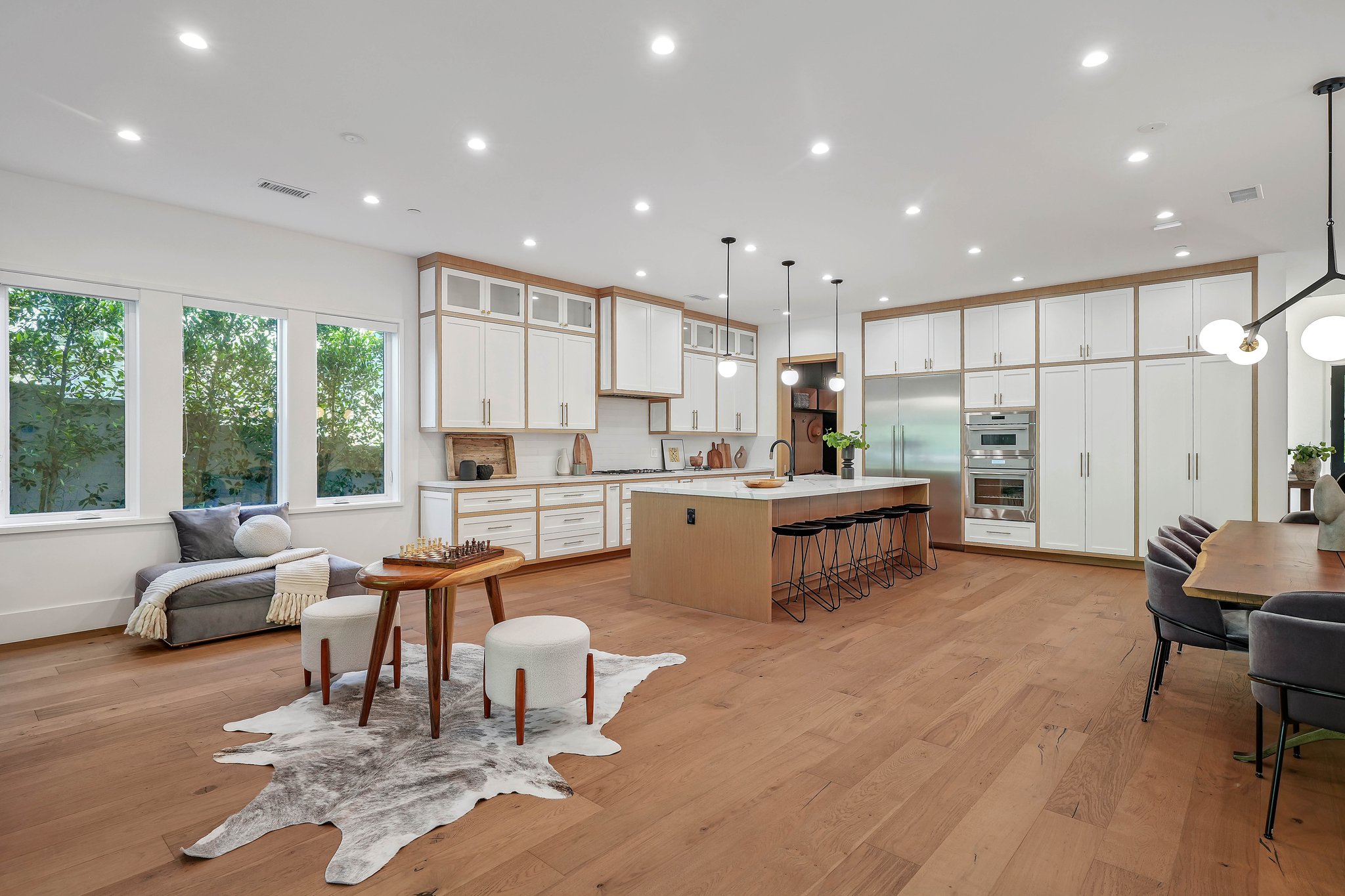 Located on a beautiful tree-lined street, this recently built single-story contemporary farmhouse with pool is privately gated and hedged with a grassy front yard. The home boasts 4 beds + an office / 5 baths including a luxurious primary suite with a large walk-in closet and spa-like bathroom with a free standing tub, huge separate shower, and double vanity sinks. Incredible curb appeal on the exterior, the property exudes warmth and sophistication throughout with impeccable finishes including light oak wood flooring, exposed wood beams, and wooden accent walls in the living area and all bedrooms. An open floor plan and vaulted ceilings highlight the voluminous scale of the house, with the living area opening to the grassy backyard via sliding glass doors replete with a pool/spa, BBQ, and built-in seating around an exterior fireplace. A gorgeous chef’s kitchen features an oversized center island with built-in breakfast seating, white quartz countertops, and custom cabinetry. Perfect for both family and guests, each bedroom is equipped with its own private ensuite bathroom. 2-car garage with additional gated driveway parking. Owner upgrades include smart-home systems including Sonos and lighting, Control 4 gate control, new landscaping, and driveway gate.