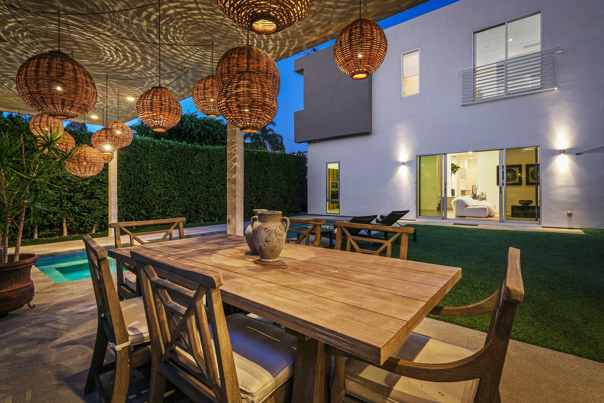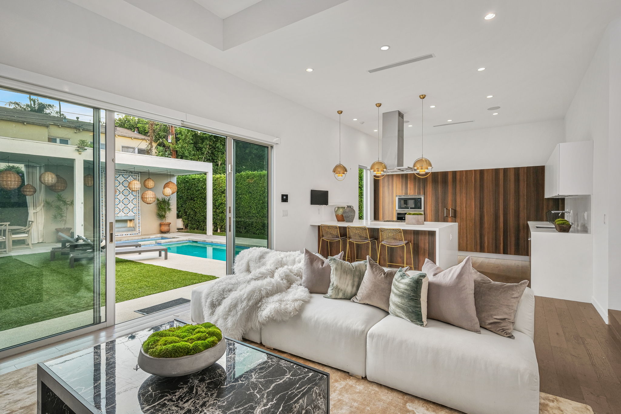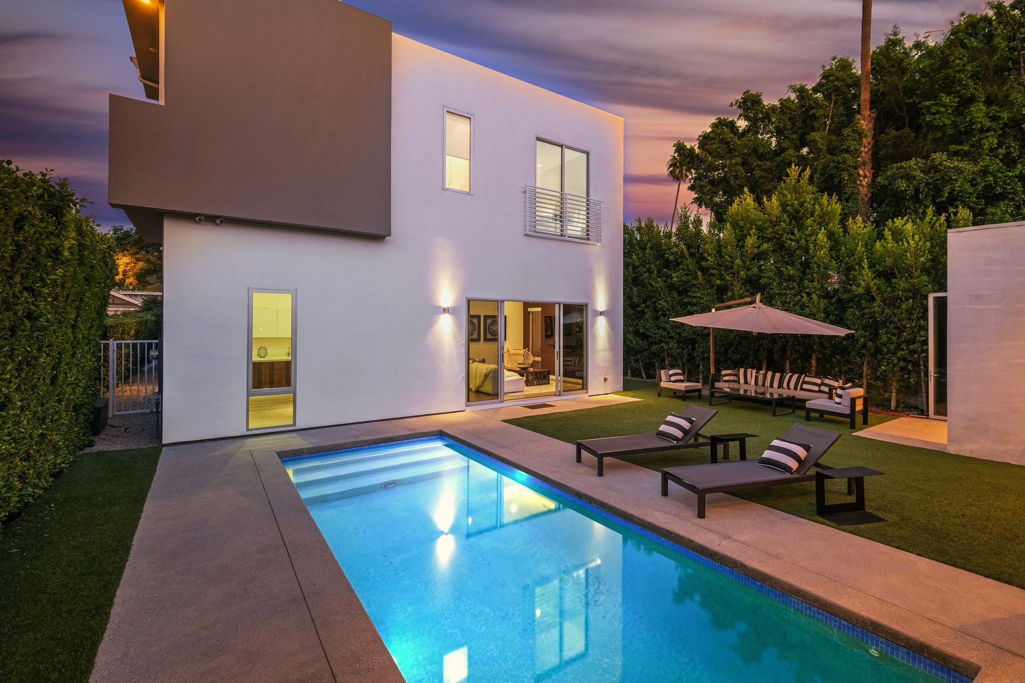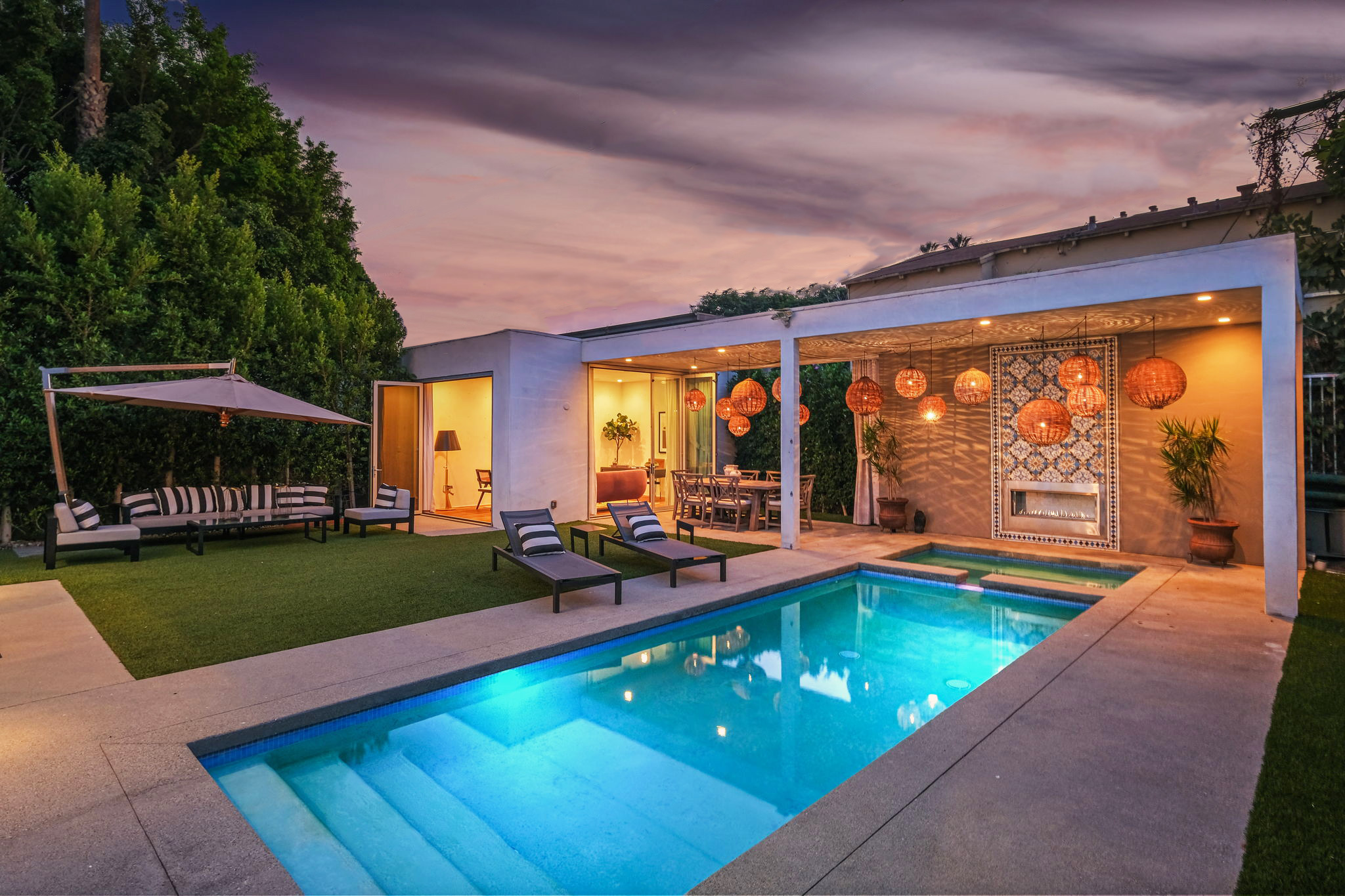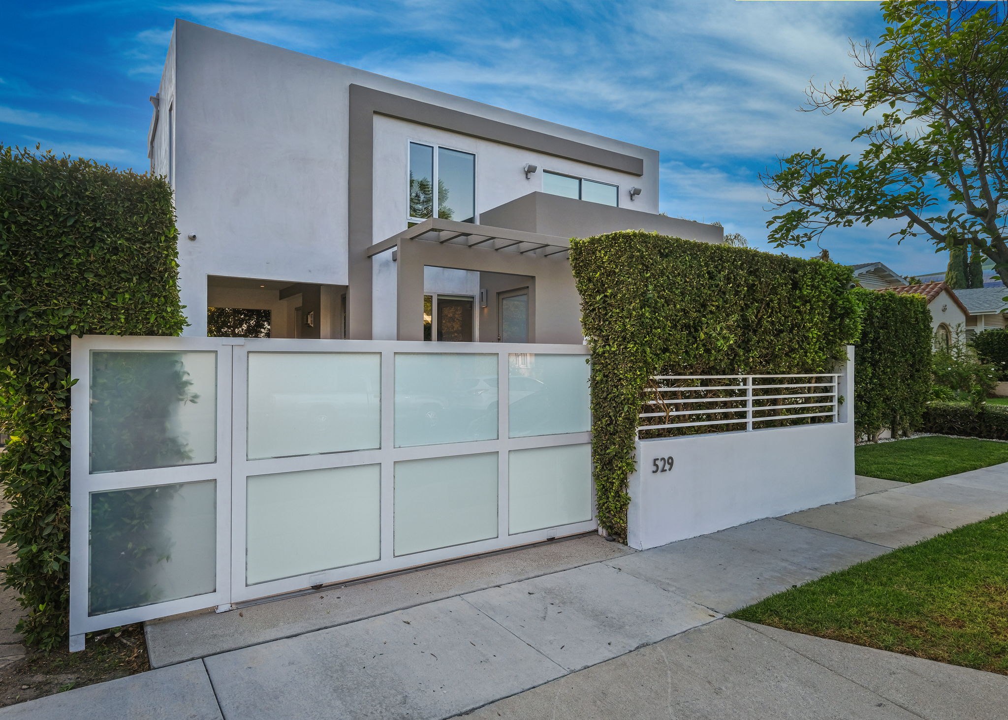 Set behind private gates, this stunning contemporary is located in the most exclusive area of West Hollywood. The welcoming living room opens up to a light-filled formal dining room with high ceilings and a beautiful modern kitchen boasting contrasting custom wood cabinetry and white Caesarstone countertops, overlooking the cozy family room. Up the stairs, the spacious owner's suite comes replete with a walk-in closet, a spa-like bath with a large soaking tub, and two balconies. The hedged and private backyard is the perfect retreat and features a pool, spa, fireplace, sitting and dining areas, as well as a separate media studio/cabana.