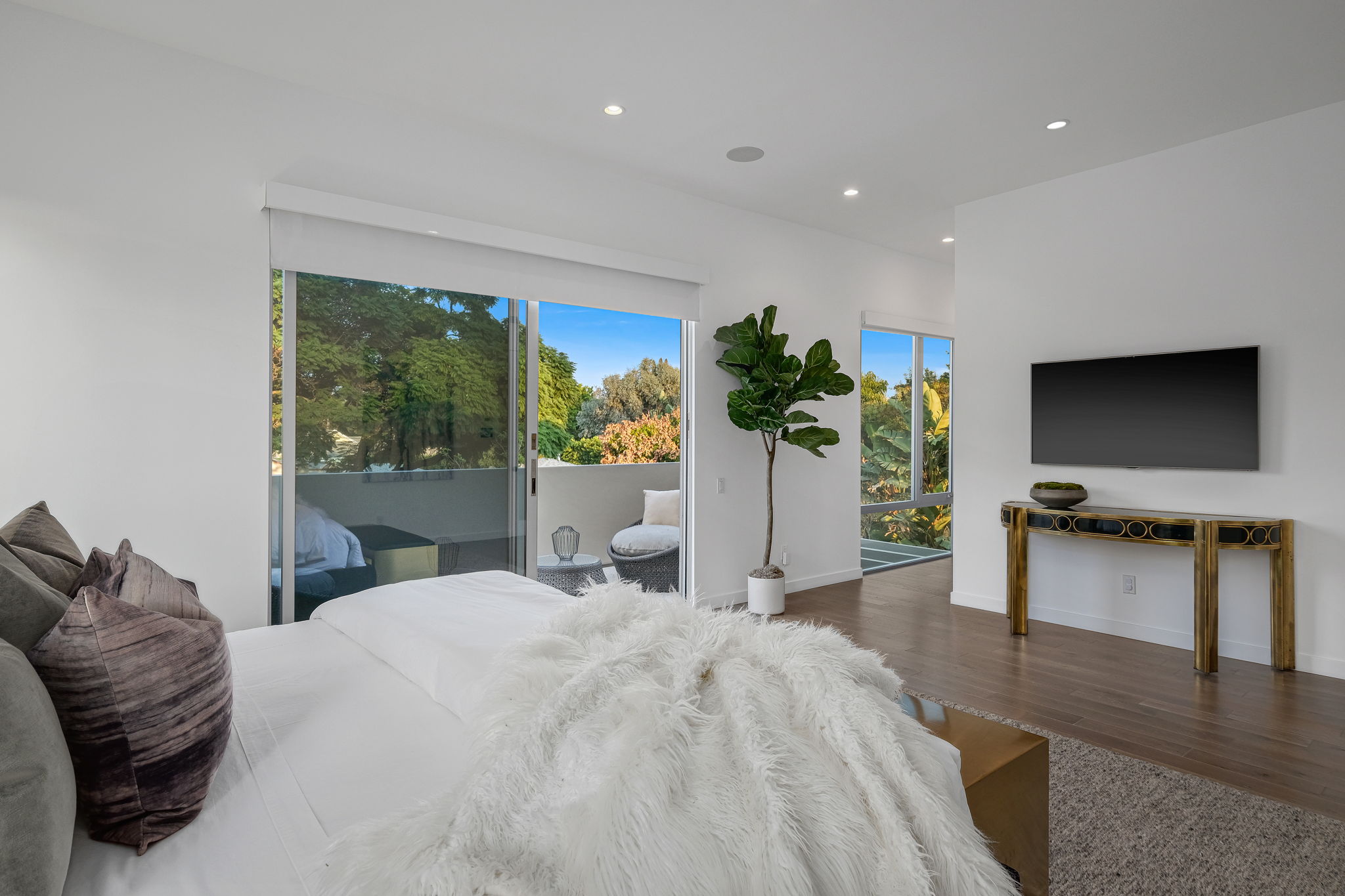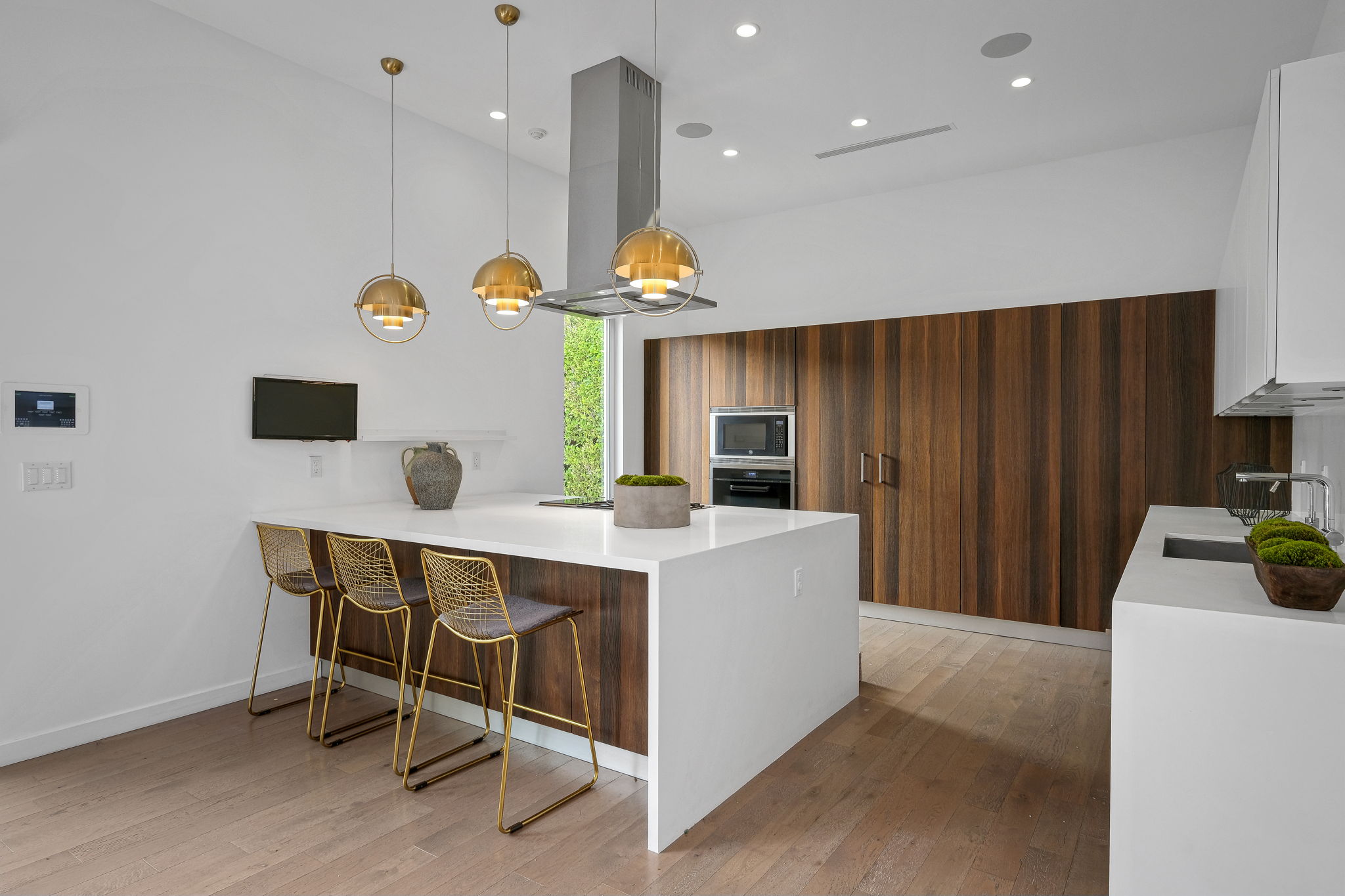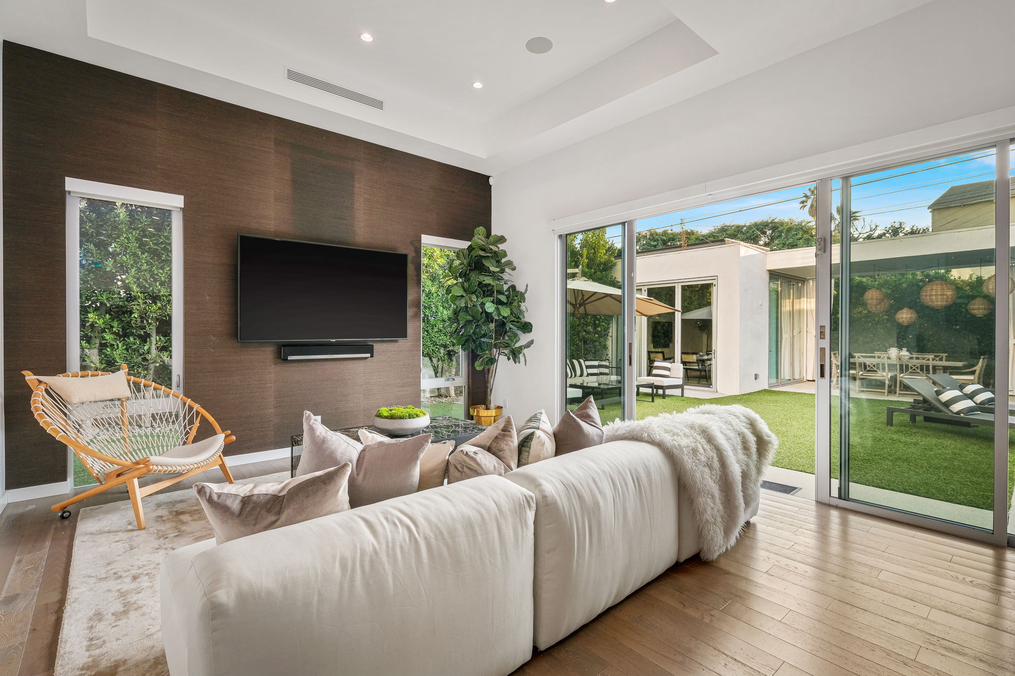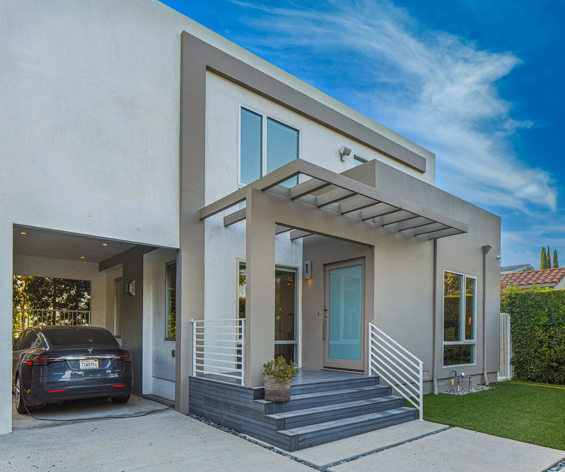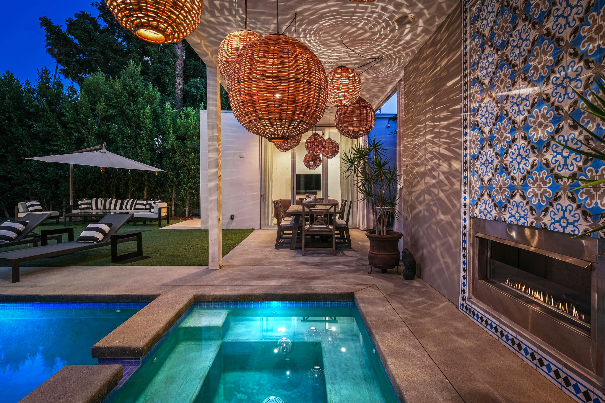 Set behind private gates, this stunning contemporary is located in the most exclusive area of West Hollywood. The welcoming living room opens up to a light-filled formal dining room with high ceilings and a beautiful modern kitchen boasting contrasting custom wood cabinetry and white Caesarstone countertops, overlooking the cozy family room. Up the stairs, the spacious owner's suite comes replete with a walk-in closet, a spa-like bath with a large soaking tub, and two balconies. The hedged and private backyard is the perfect retreat and features a pool, spa, fireplace, sitting and dining areas, as well as a separate media studio/cabana.