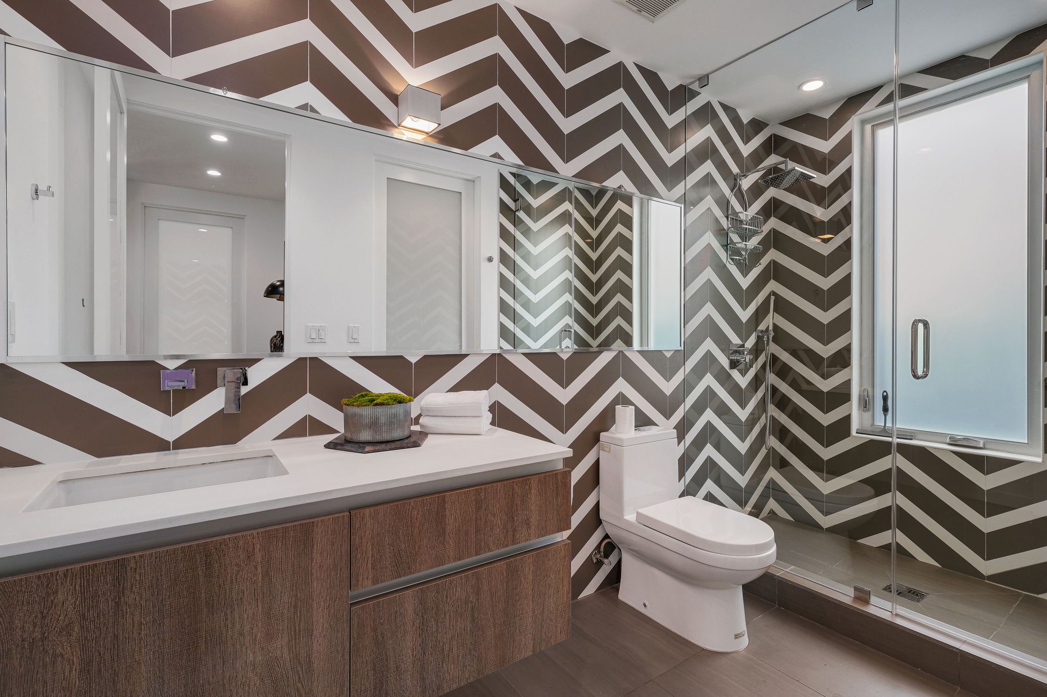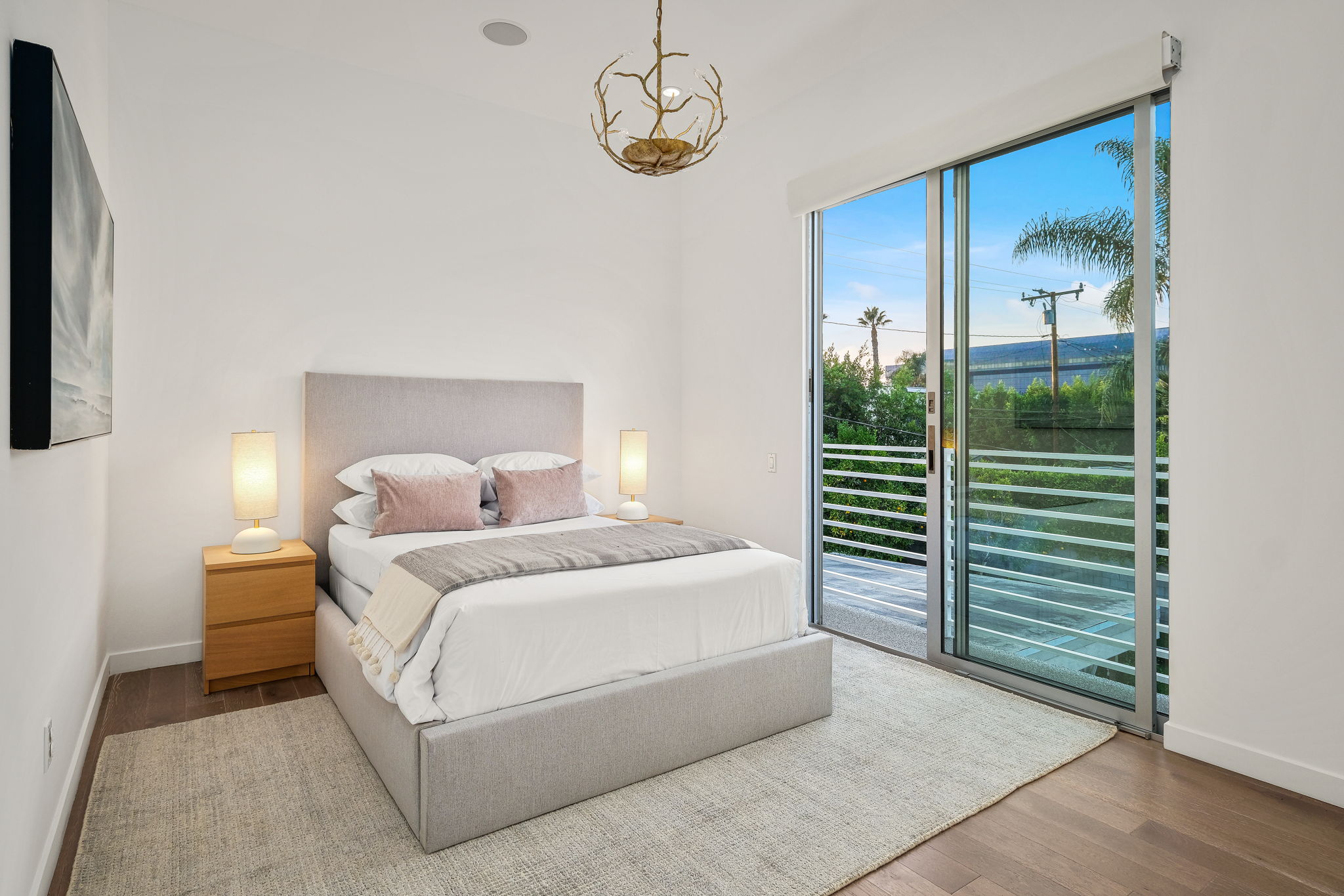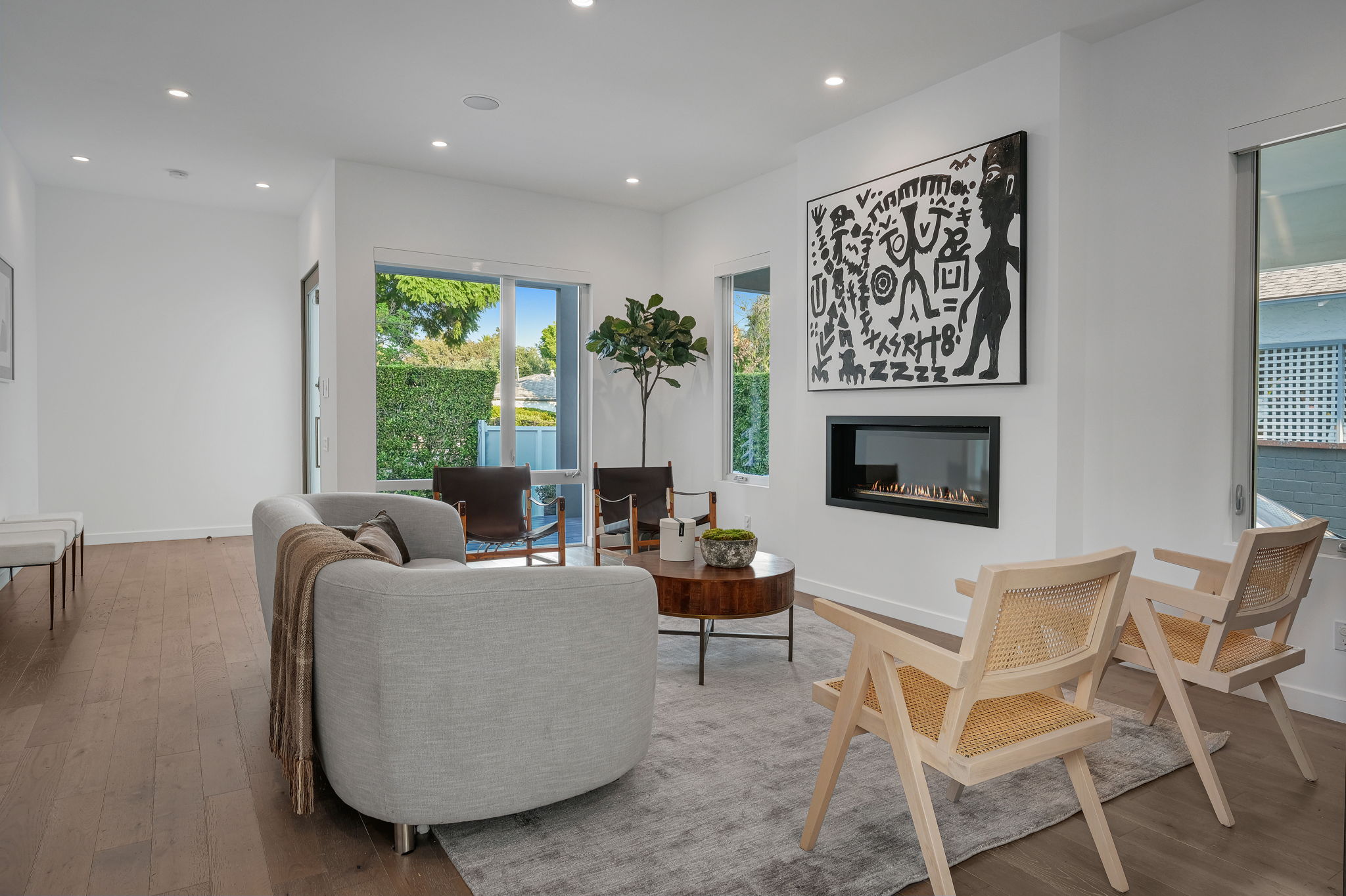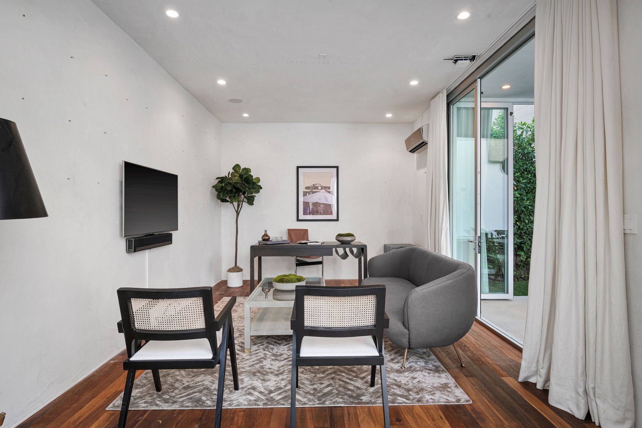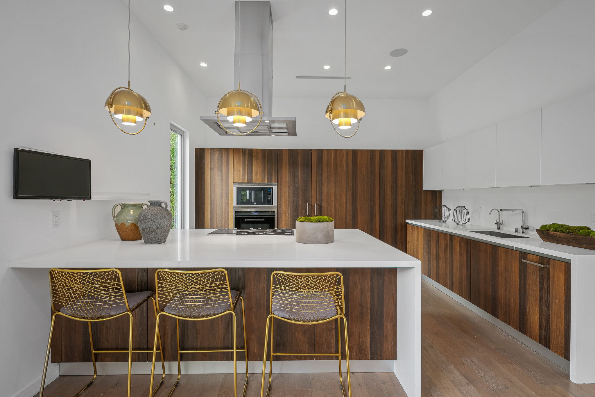 Set behind private gates, this stunning contemporary is located in the most exclusive area of West Hollywood. The welcoming living room opens up to a light-filled formal dining room with high ceilings and a beautiful modern kitchen boasting contrasting custom wood cabinetry and white Caesarstone countertops, overlooking the cozy family room. Up the stairs, the spacious owner's suite comes replete with a walk-in closet, a spa-like bath with a large soaking tub, and two balconies. The hedged and private backyard is the perfect retreat and features a pool, spa, fireplace, sitting and dining areas, as well as a separate media studio/cabana.