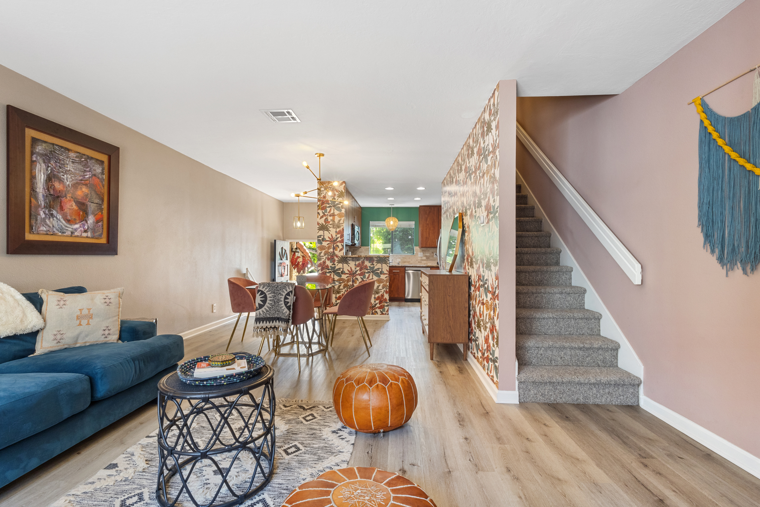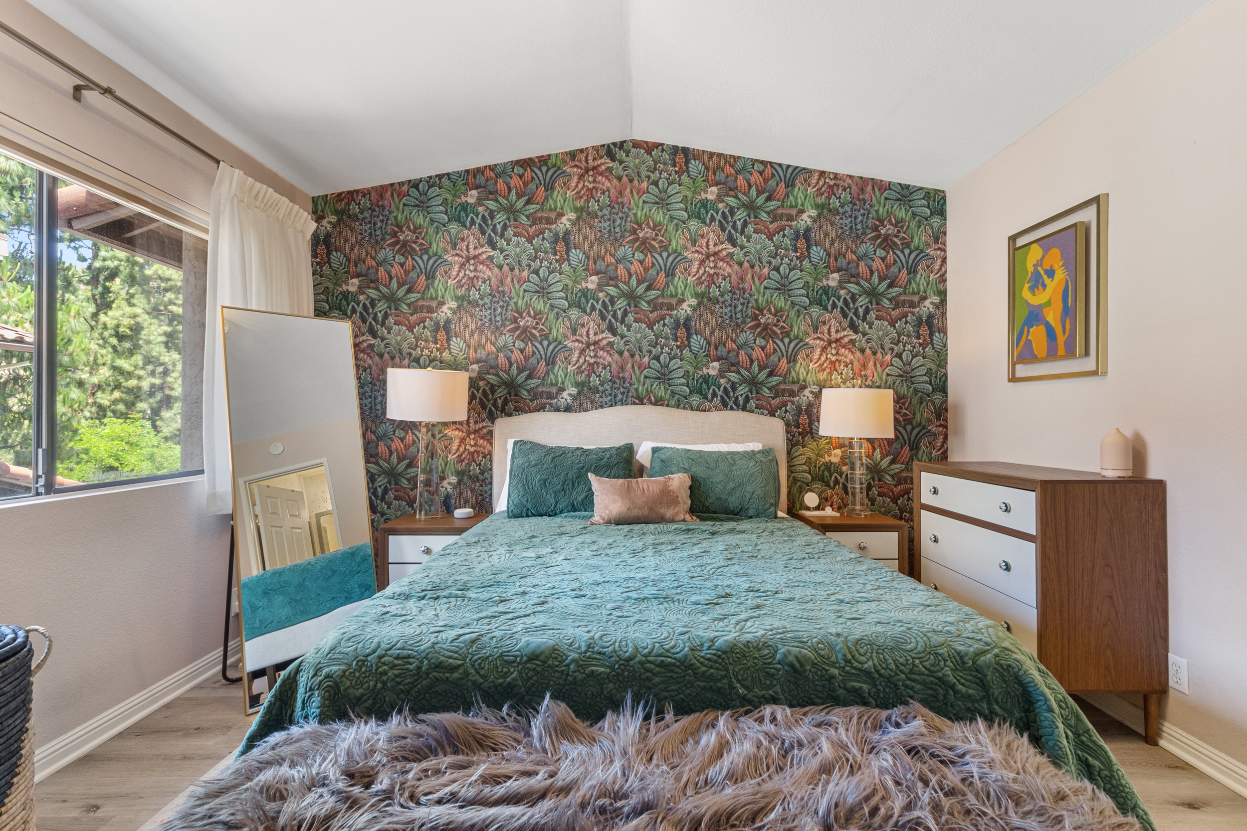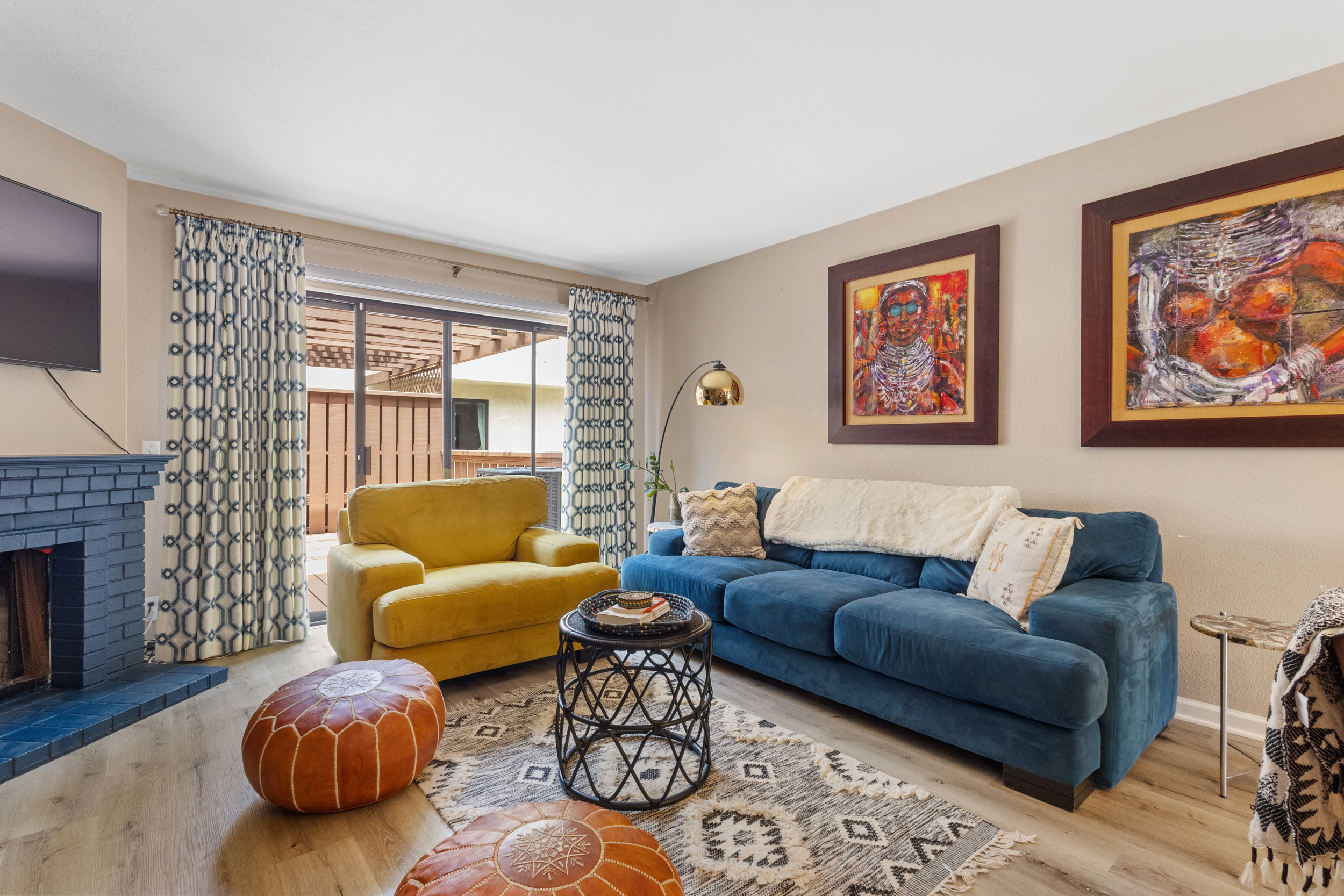 Welcome to 5806 Mission Center Road, Unit Ban elegantly upgraded home in the heart of Mission Valley. This stunning property boasts a modern kitchen with sleek cabinetry, granite countertops, and high-end stainless steel appliances. The open-concept living room is a designers dream, featuring Manuel Canovas Paris wallpaper, a cozy fireplace, and custom electric shutters, perfect for entertaining or relaxing in style. Both bedrooms exude sophistication, with the guest room adorned in Thibaut Italy wallpaper and the upgraded guest bath featuring hand-printed Cole & Sons wallpaper. The primary suite is a sanctuary with custom Dwell Studio designs and upgraded closet organizers. Recent updates include PEX piping throughout, a keyless front entry, Ring camera, and Nest thermostat for modern convenience. Step outside to a private deck with serene canyon views, offering a peaceful retreat from city life. The attached one-car garage includes a Tesla charging system, epoxy flooring, and a versatile storage room currently used as a home gym. Located on the edge of the complex for added privacy, this home is just steps from Civita Park, trendy cafes, and shopping. With quick freeway access and proximity to USD, SDSU, local beaches, and more, this prime location truly has it all. Do not miss the chance to own this luxurious, move-in-ready gem!