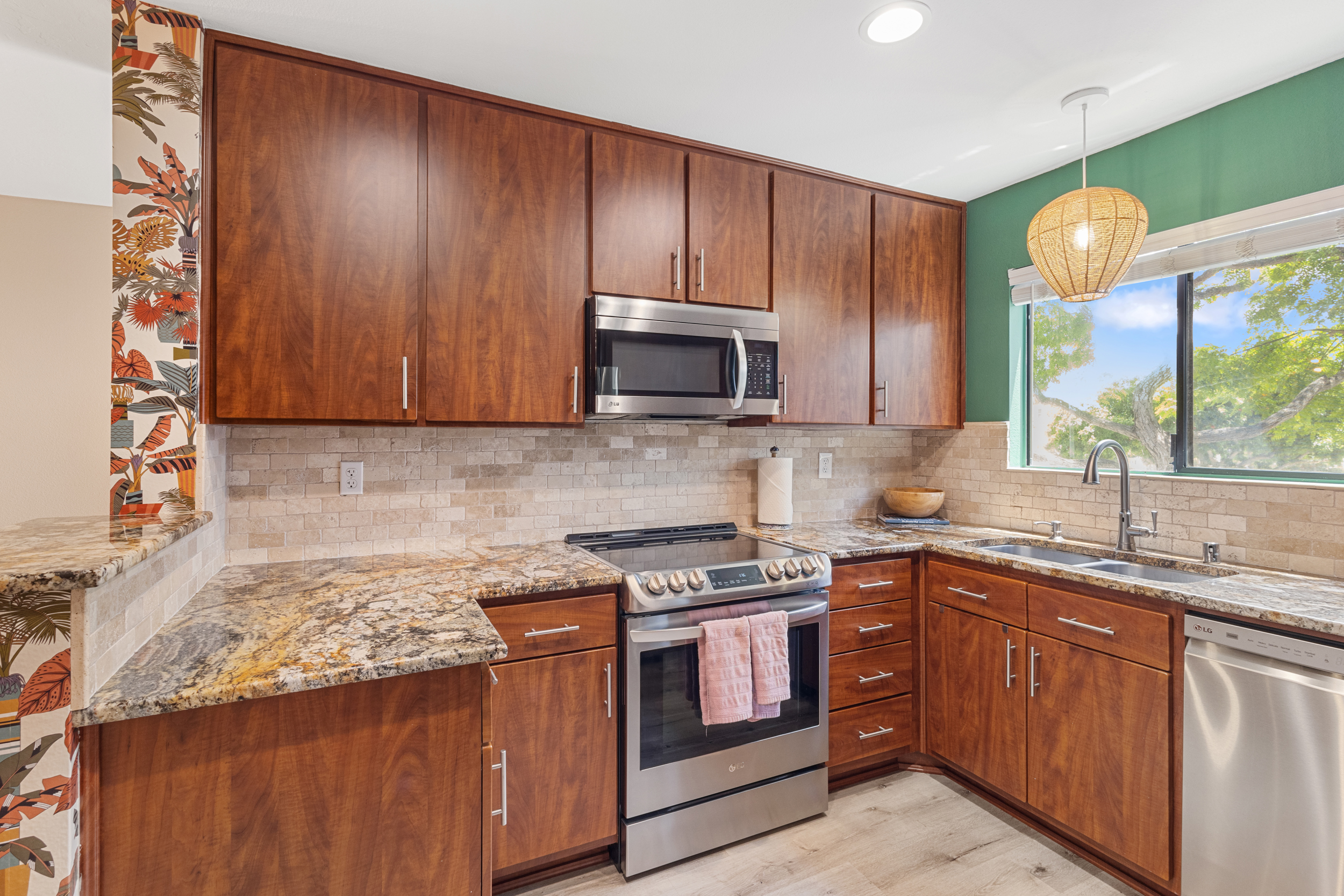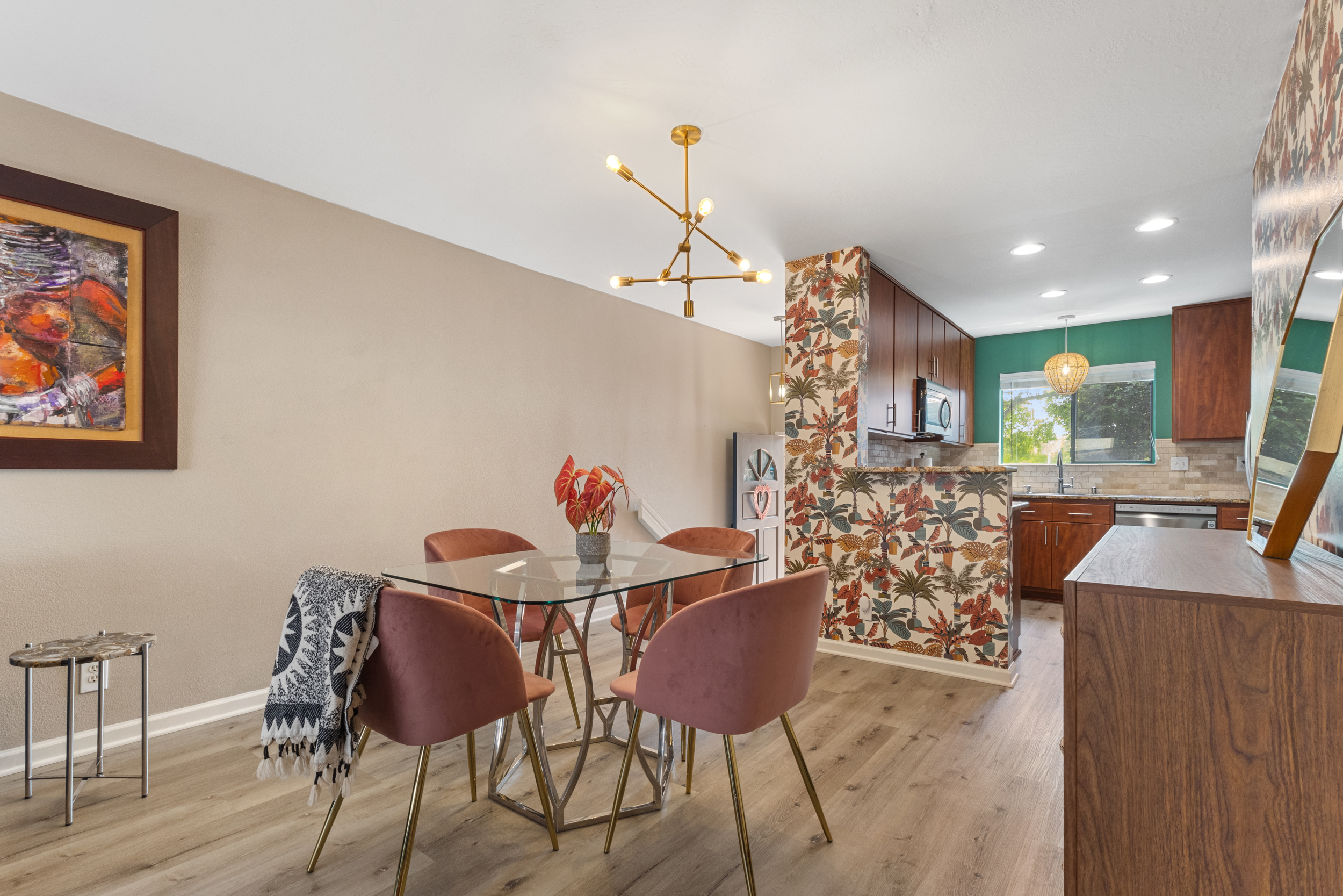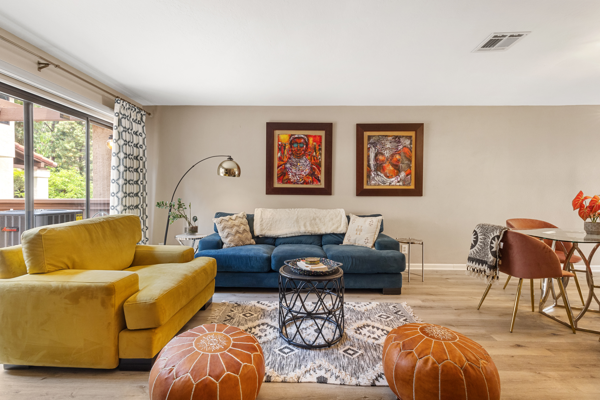 Welcome to 5806 Mission Center Road, Unit Ban elegantly upgraded home in the heart of Mission Valley. This stunning property boasts a modern kitchen with sleek cabinetry, granite countertops, and high-end stainless steel appliances. The open-concept living room is a designers dream, featuring Manuel Canovas Paris wallpaper, a cozy fireplace, and custom electric shutters, perfect for entertaining or relaxing in style. Both bedrooms exude sophistication, with the guest room adorned in Thibaut Italy wallpaper and the upgraded guest bath featuring hand-printed Cole & Sons wallpaper. The primary suite is a sanctuary with custom Dwell Studio designs and upgraded closet organizers. Recent updates include PEX piping throughout, a keyless front entry, Ring camera, and Nest thermostat for modern convenience. Step outside to a private deck with serene canyon views, offering a peaceful retreat from city life. The attached one-car garage includes a Tesla charging system, epoxy flooring, and a versatile storage room currently used as a home gym. Located on the edge of the complex for added privacy, this home is just steps from Civita Park, trendy cafes, and shopping. With quick freeway access and proximity to USD, SDSU, local beaches, and more, this prime location truly has it all. Do not miss the chance to own this luxurious, move-in-ready gem!