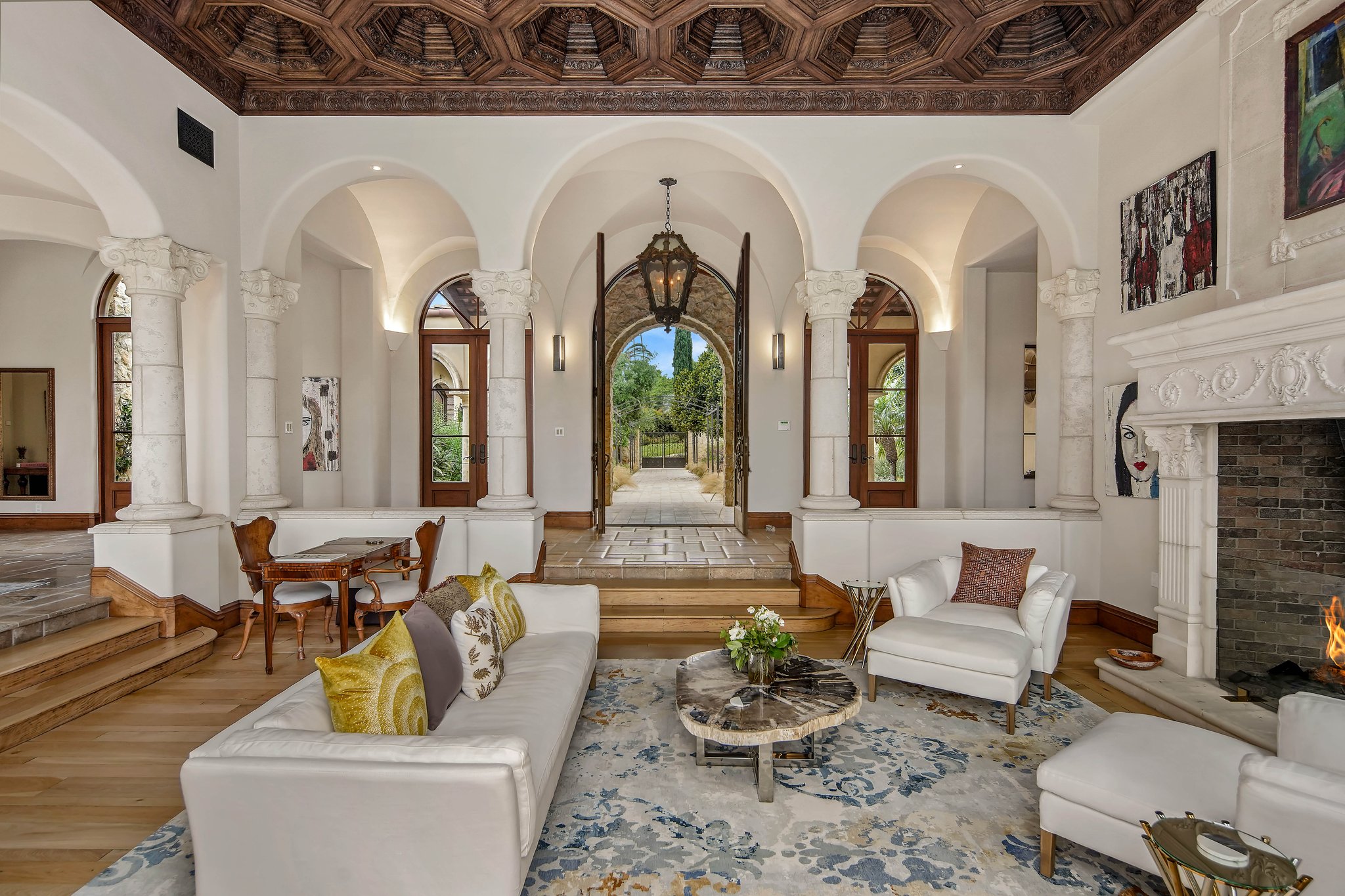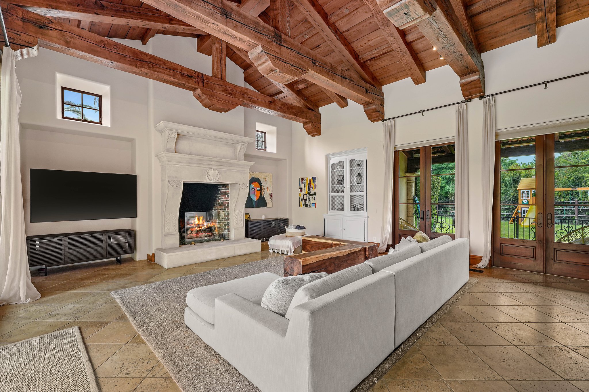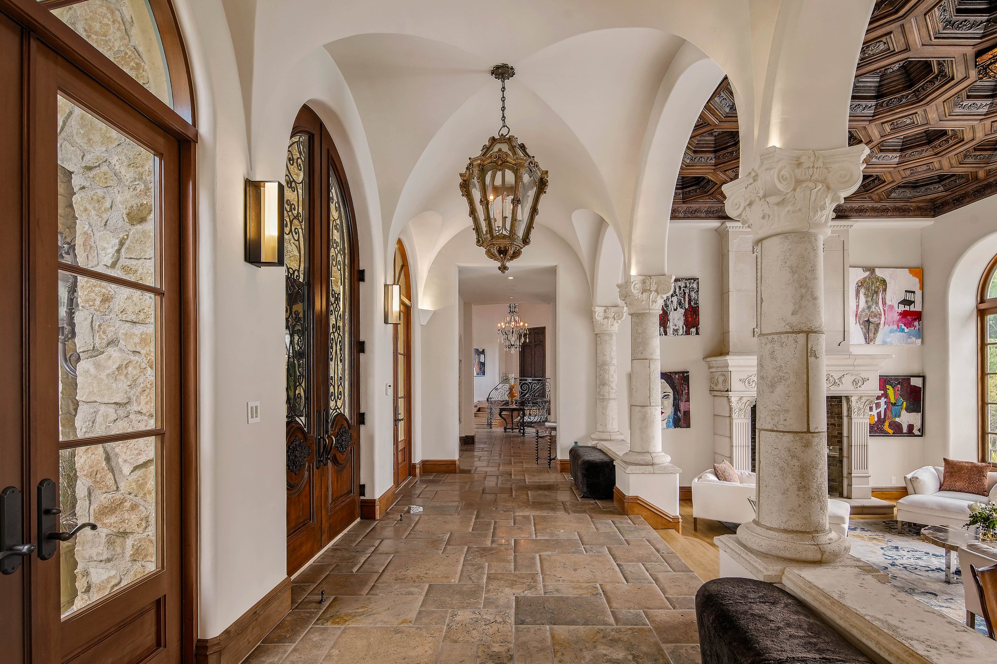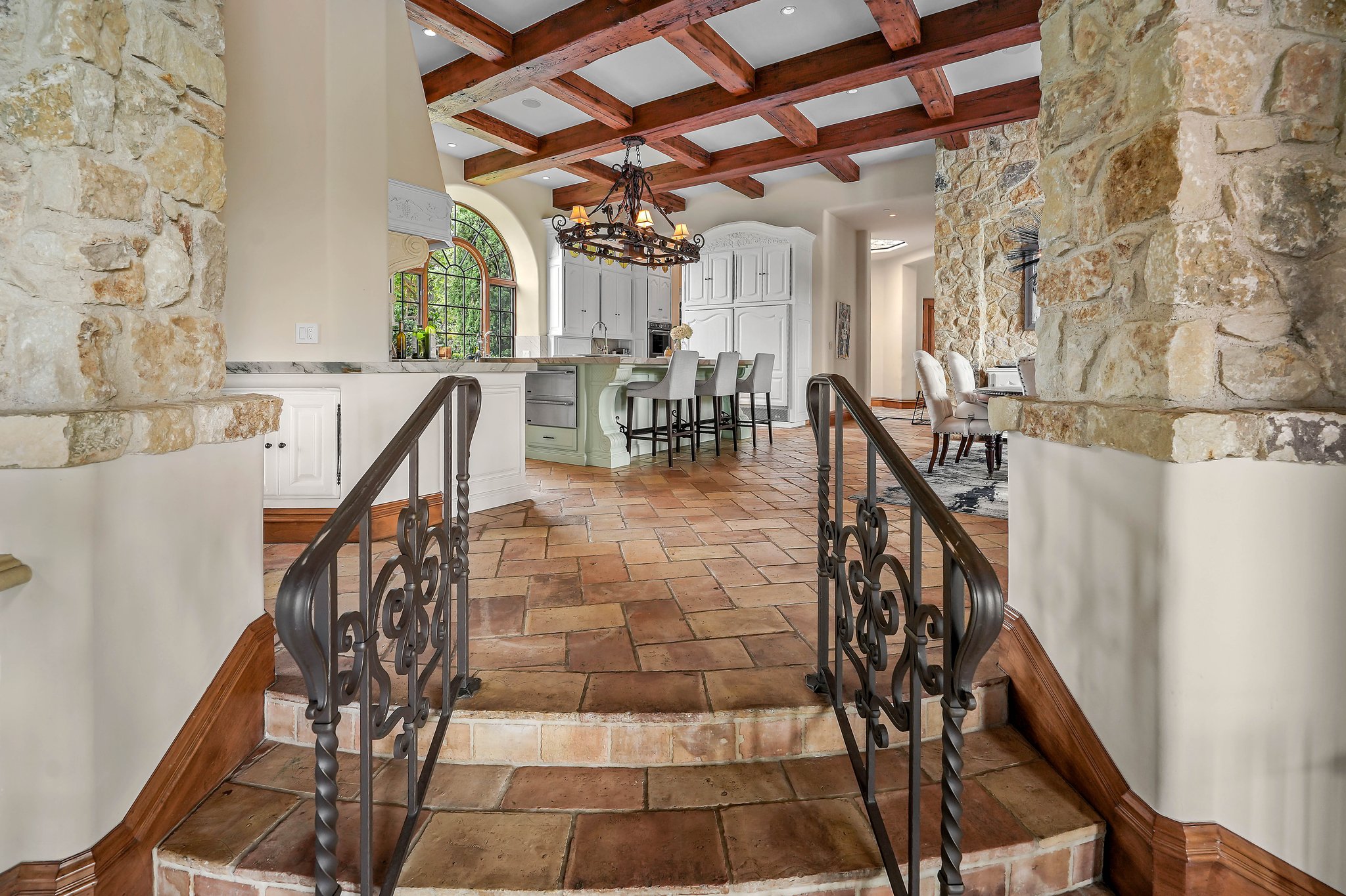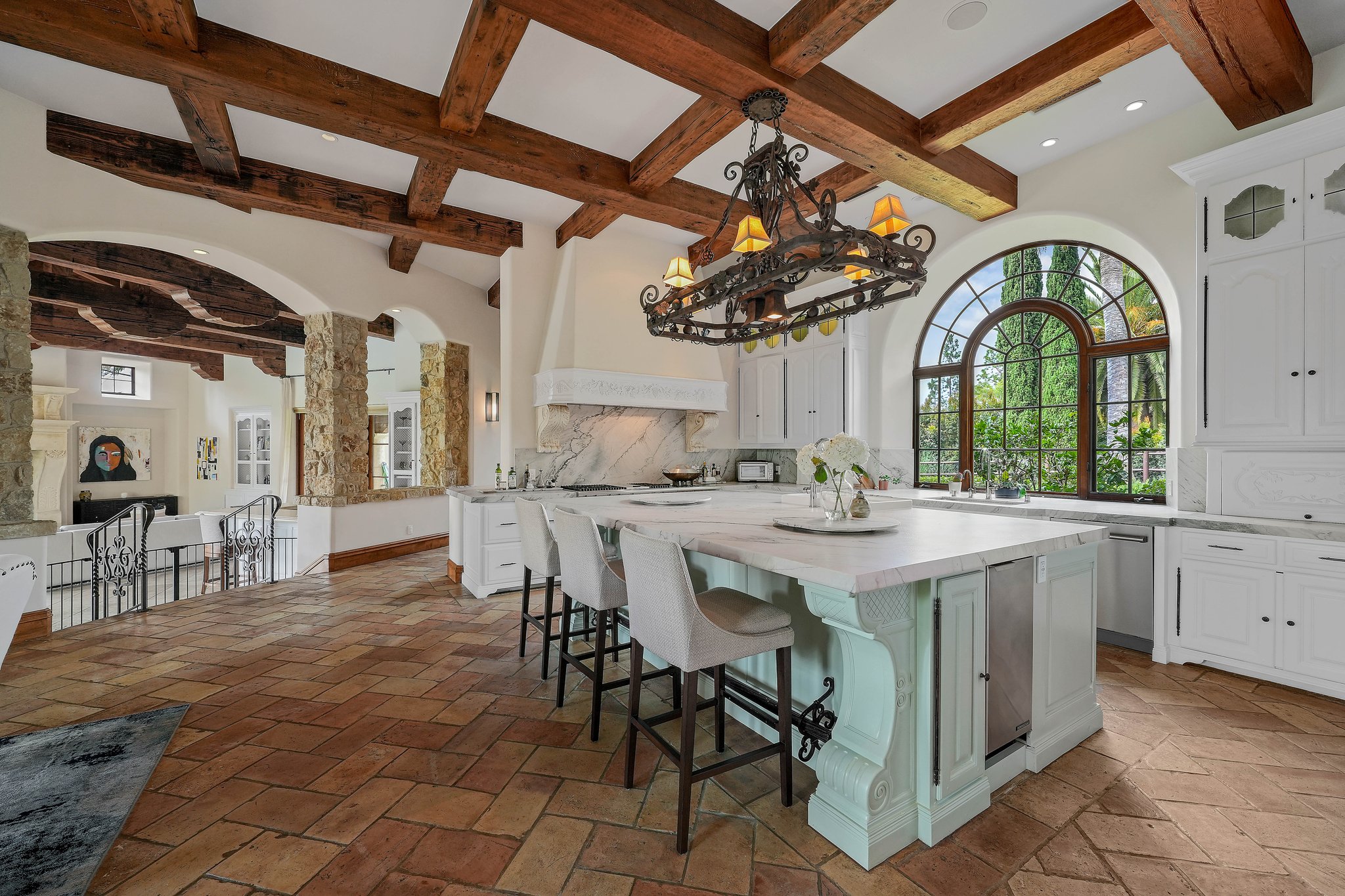 Elegance abounds in the formal spaces of living and dining rooms, each featuring majestic stone fireplaces. This meticulously detailed haven offers 5 generous bedrooms, 7 full and 4 half baths. The detached library just a few steps from the main house boasts 360-degree wood shelves, wood floors and is easily convertible to a 2-bed in-law suite. Thoughtful details include reclaimed wood beams, vintage flooring, antique heated tiles, travertine and granite slabs, and artisan stone work. Custom furniture-grade cabinetry, hand-wrought iron fixtures, and stone fireplaces further enhance the opulent tapestry.