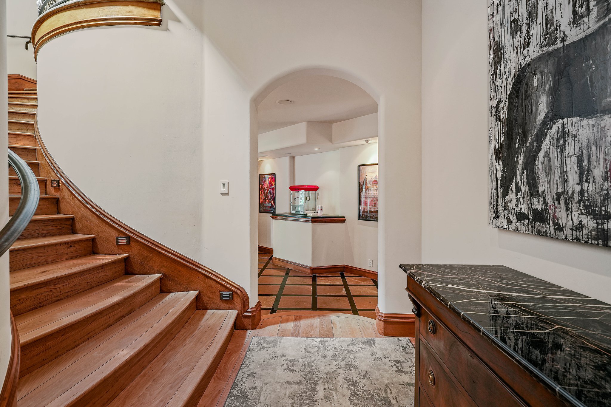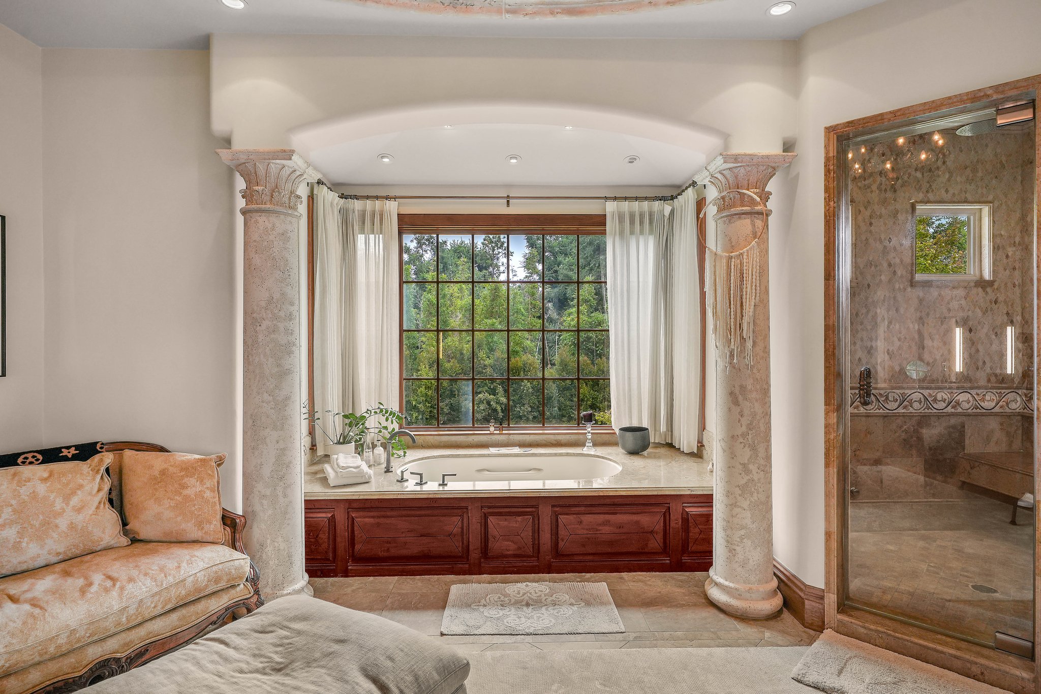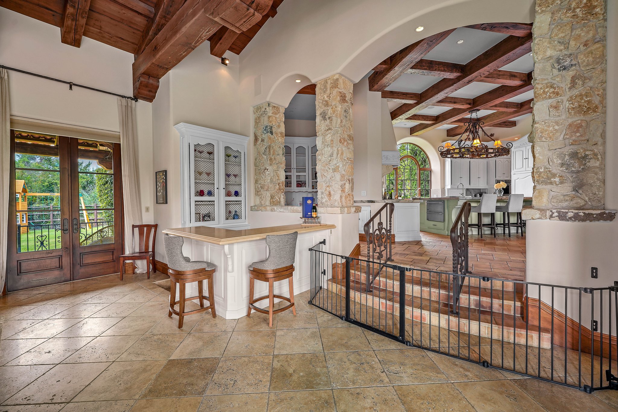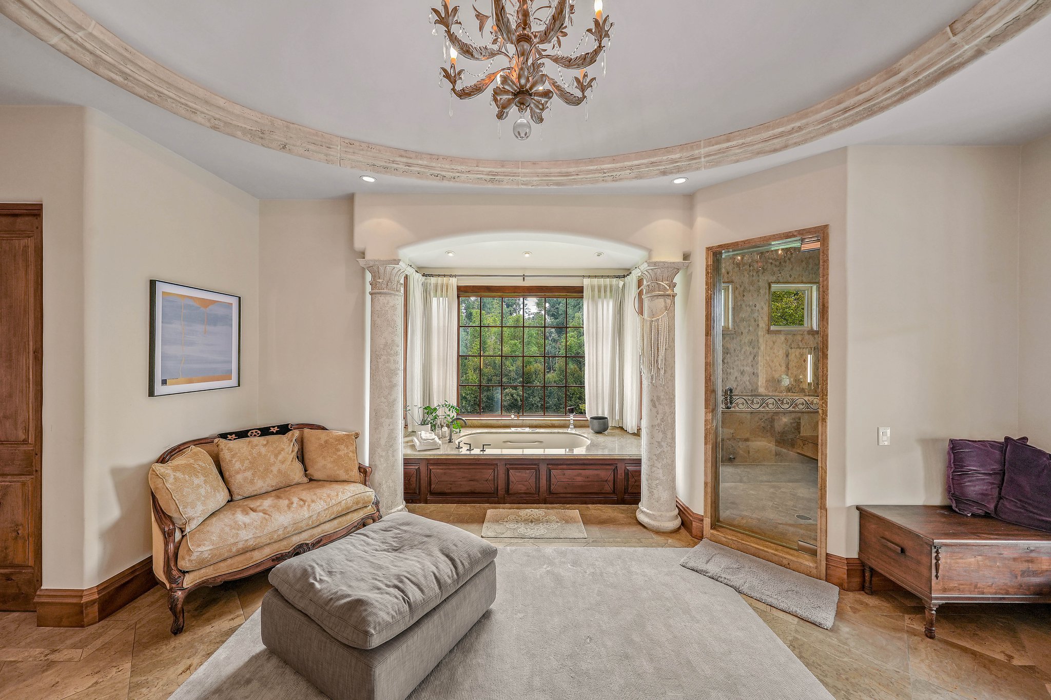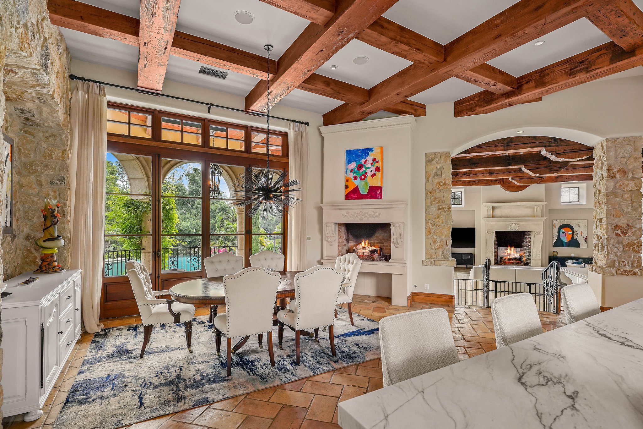 Elegance abounds in the formal spaces of living and dining rooms, each featuring majestic stone fireplaces. This meticulously detailed haven offers 5 generous bedrooms, 7 full and 4 half baths. The detached library just a few steps from the main house boasts 360-degree wood shelves, wood floors and is easily convertible to a 2-bed in-law suite. Thoughtful details include reclaimed wood beams, vintage flooring, antique heated tiles, travertine and granite slabs, and artisan stone work. Custom furniture-grade cabinetry, hand-wrought iron fixtures, and stone fireplaces further enhance the opulent tapestry.