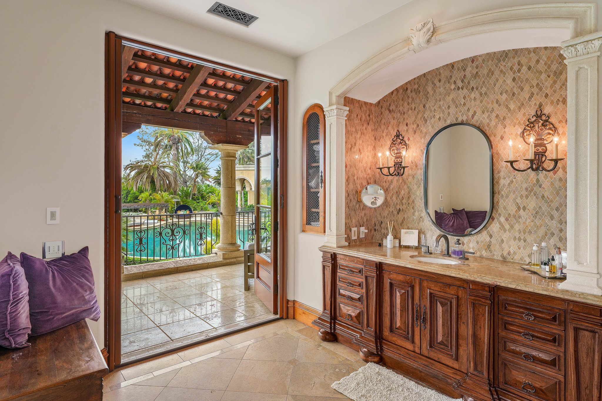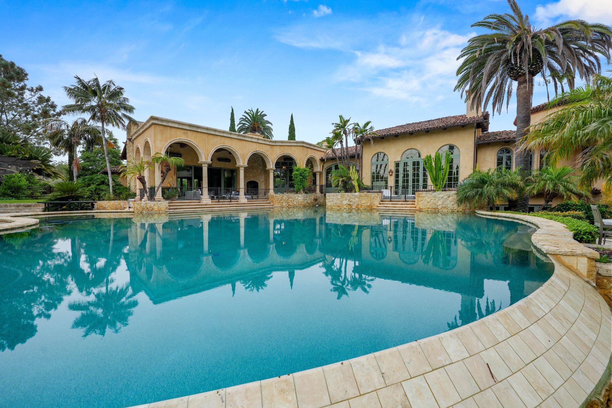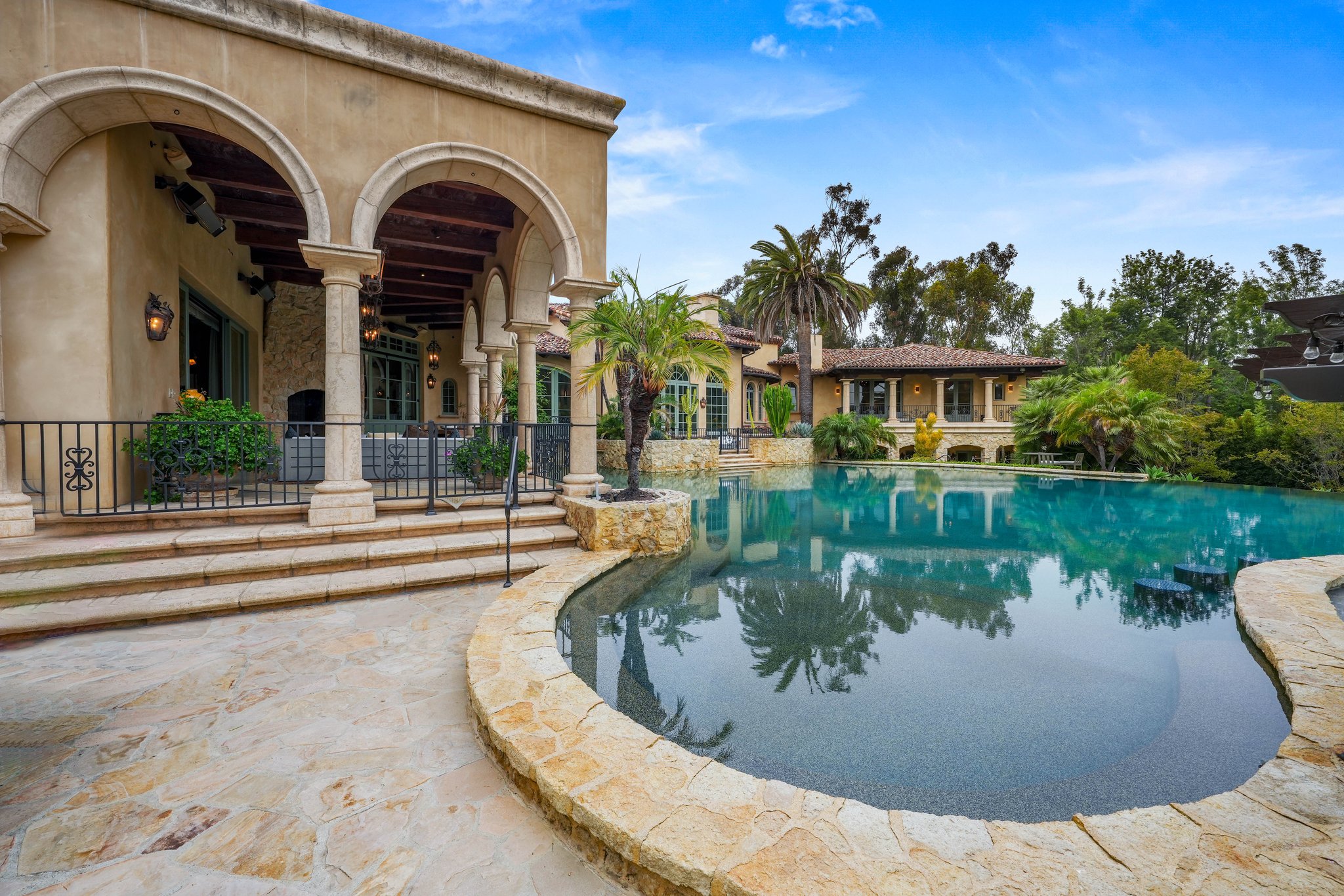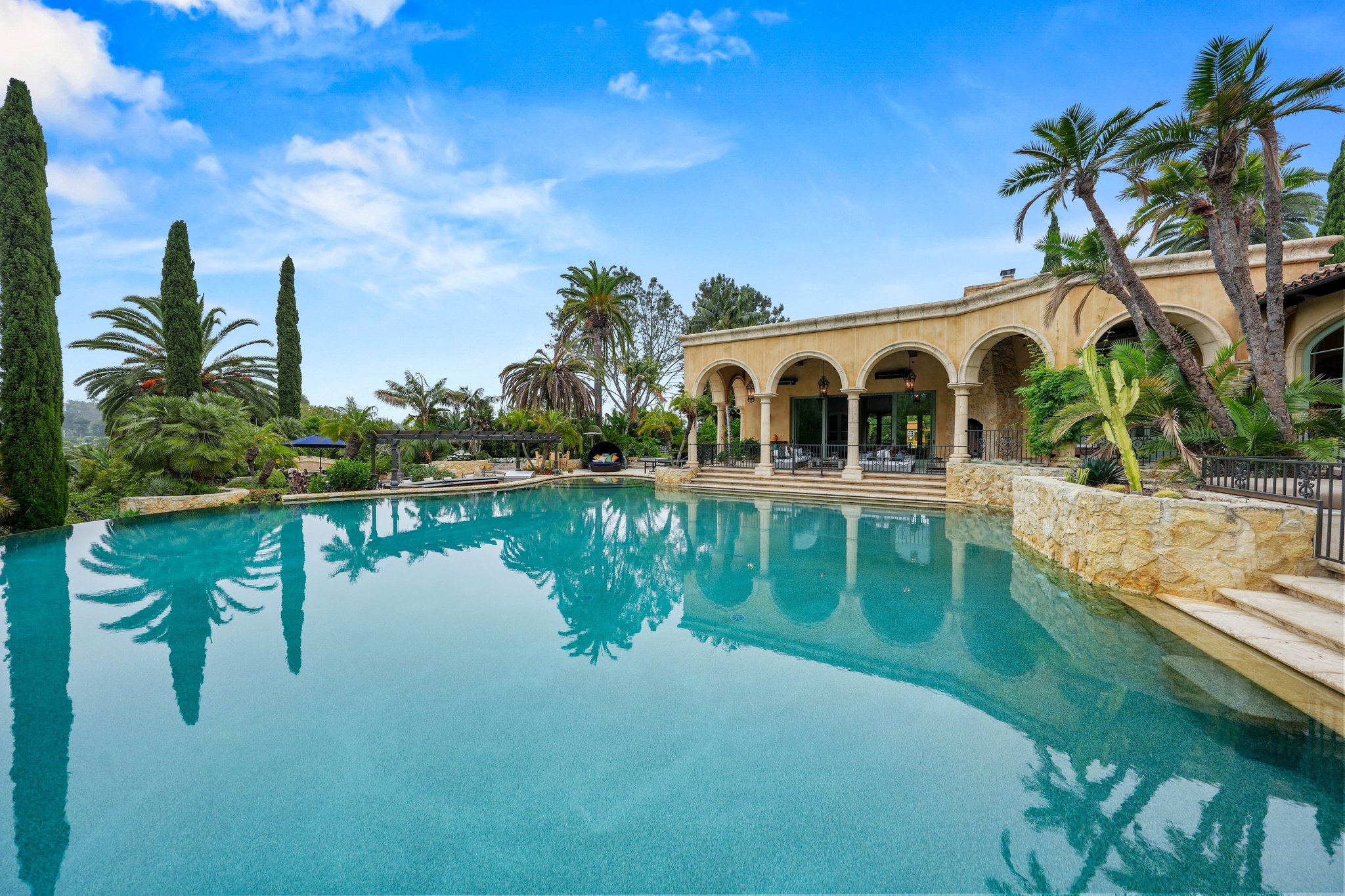 Upon entering the lavishly landscaped courtyard, an expanse of colorful rose gardens, cascading greenery and the sweet scent of citrus blossoms welcome you. The grandeur of the residence, with its spacious design, seamlessly intertwines a timeless, traditional floor plan with modern influences. Rooms effortlessly flow, converging indoor and outdoor living, inviting you to the sheltered loggias and the captivating zero-edge pool adorned with stone detailing, waterfalls, and a swim-up bar.