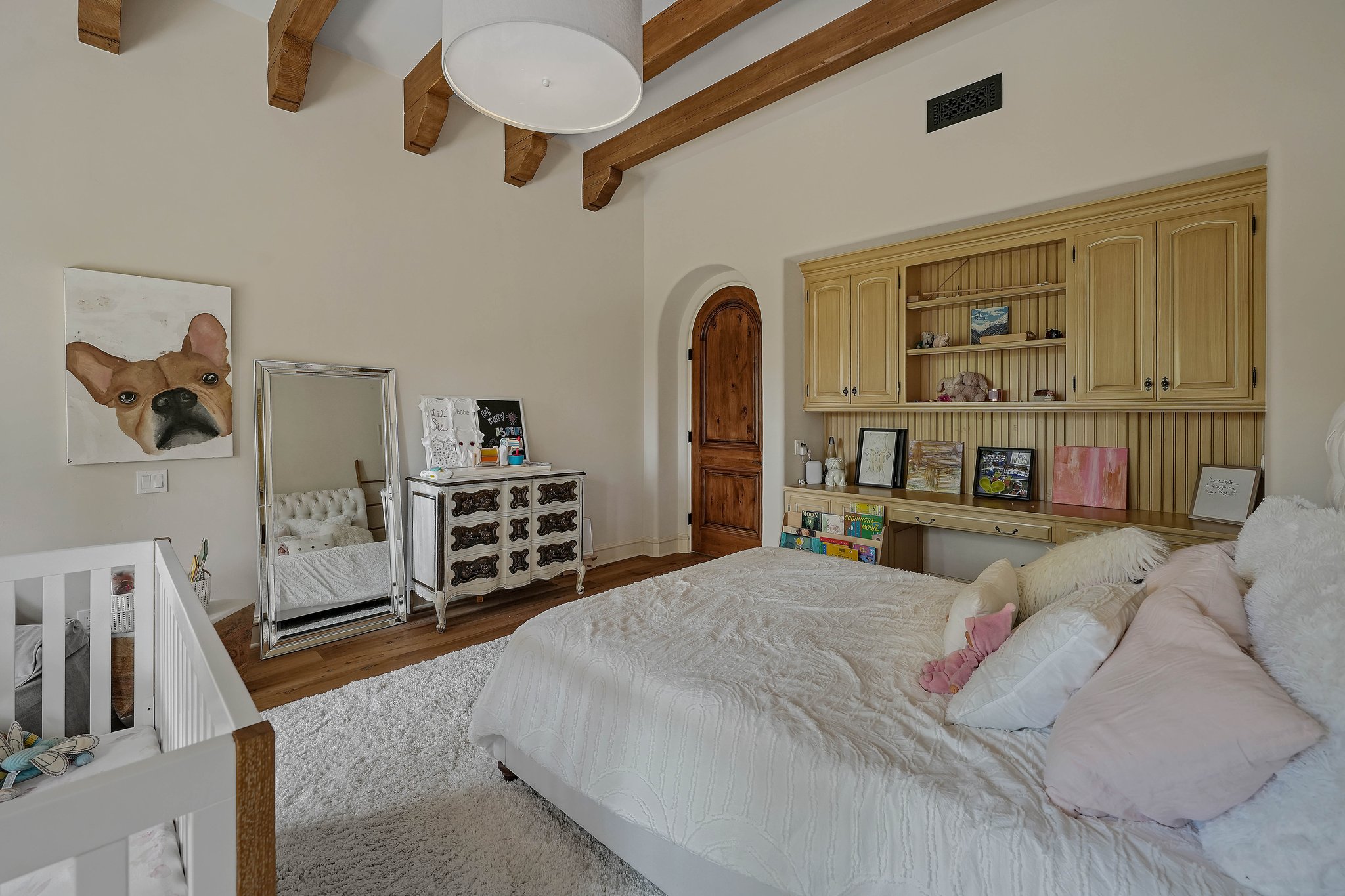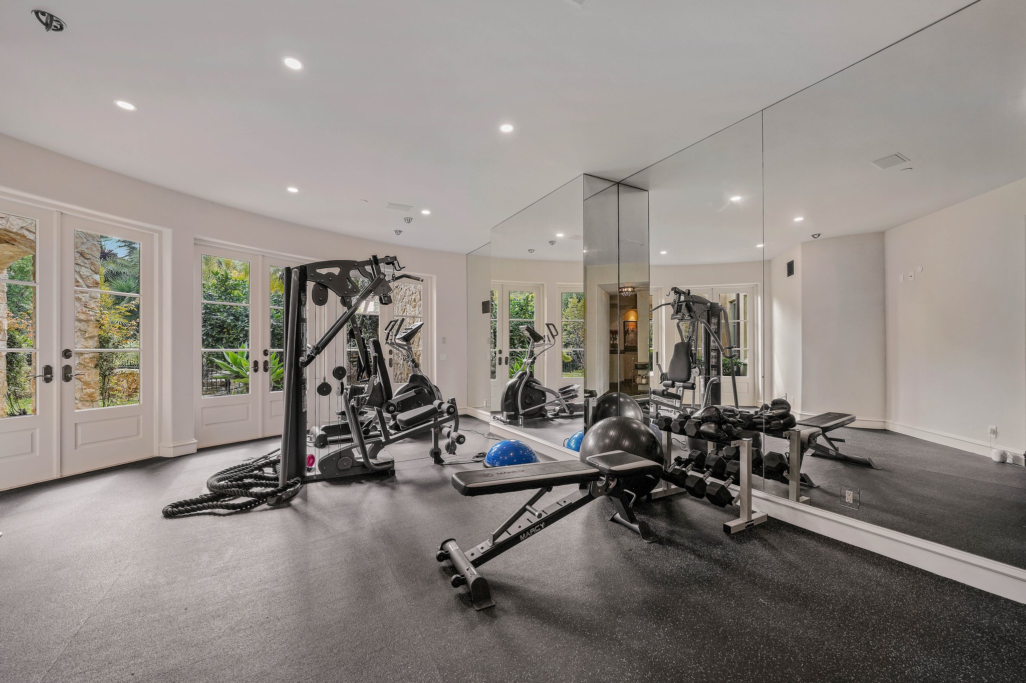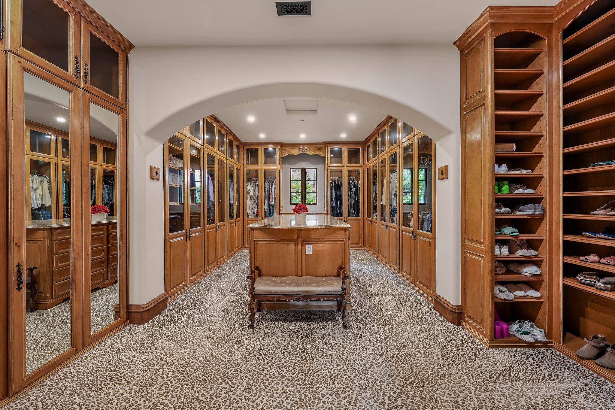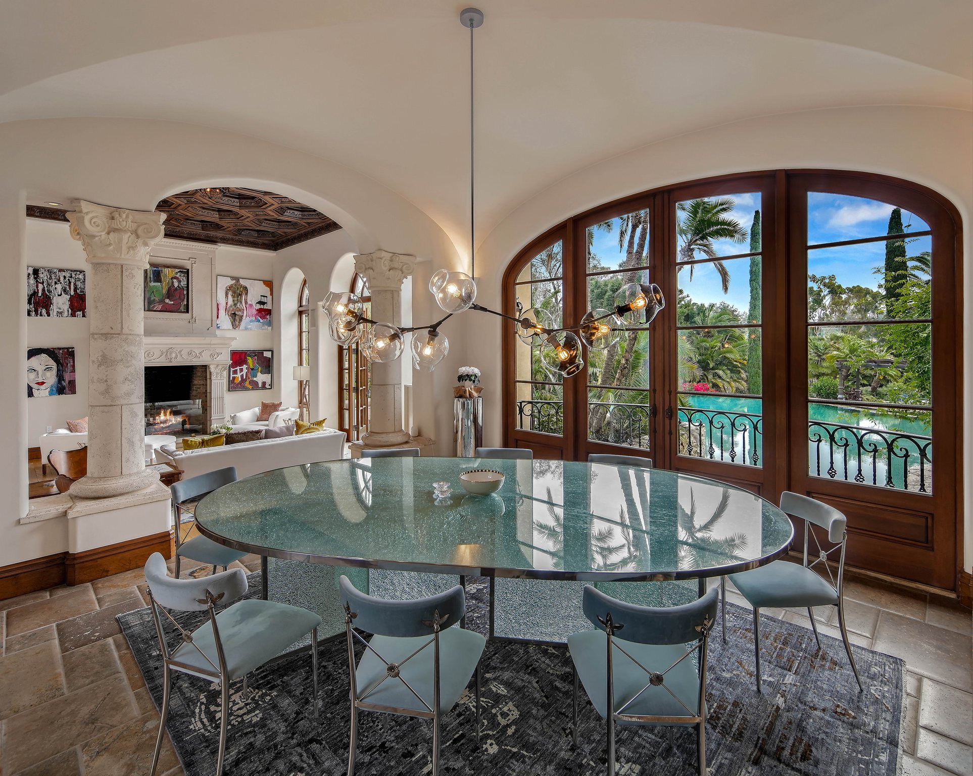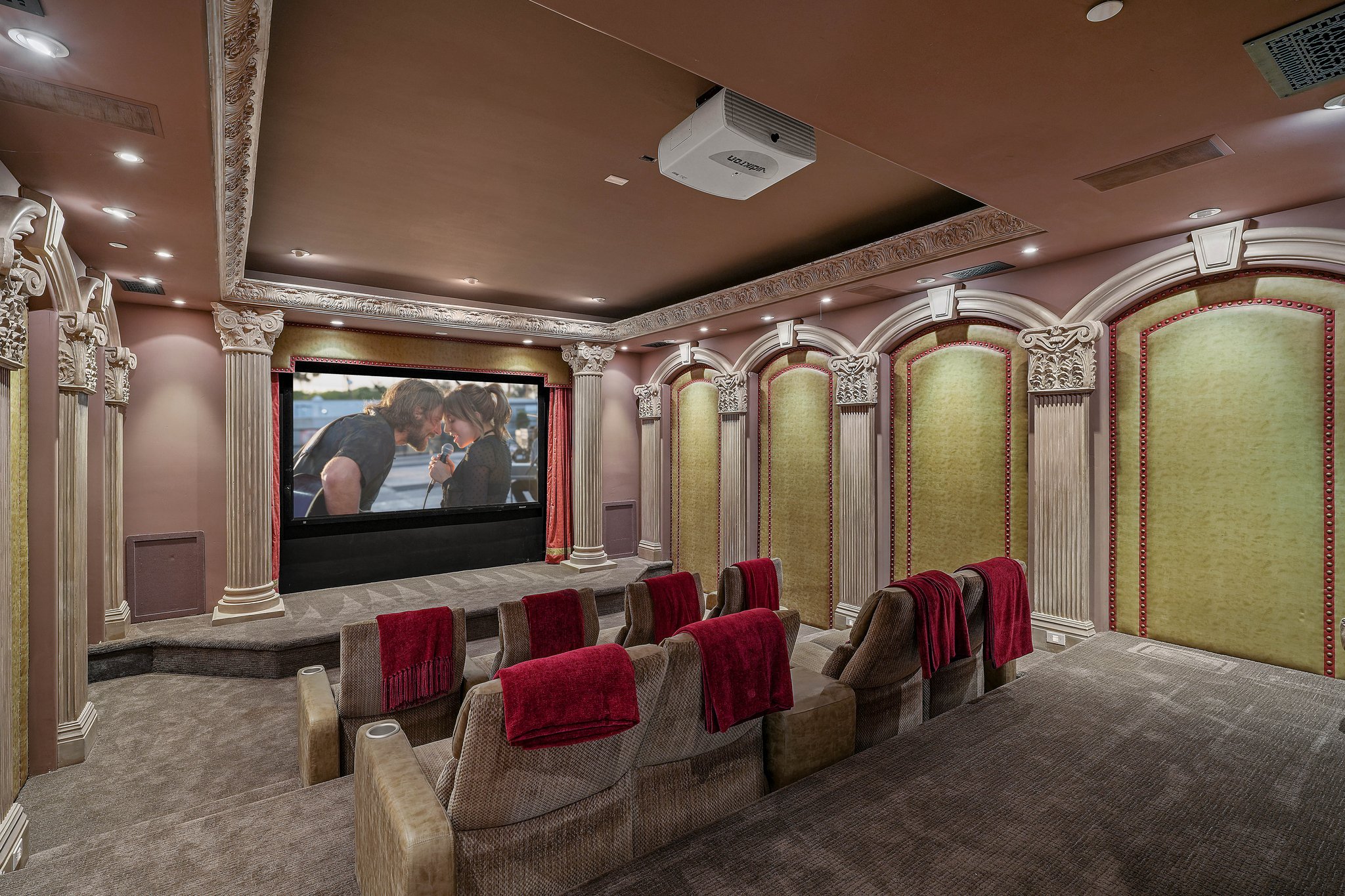The chef's kitchen features Thermador Pro appliances, dual warmers and ovens, Sub Zero fridge, fridge drawers, and a cozy breakfast room. A family room with a full bar connects seamlessly to an alfresco lounge via vanishing wood and glass doors, complemented by a fireplace and Lutron lighting. The master suite offers separate luxurious baths, custom dressing rooms with built-in mini fridges, and a private covered veranda. Additional features include a second family room with wet bar, an office, second laundry room, wine storage, gym, and a state-of-the-art movie theater. Outdoors, enjoy verandas, a wood-fired pizza oven, full kitchen, fire pit, and Sonos speakers throughout for a resort-style experience.