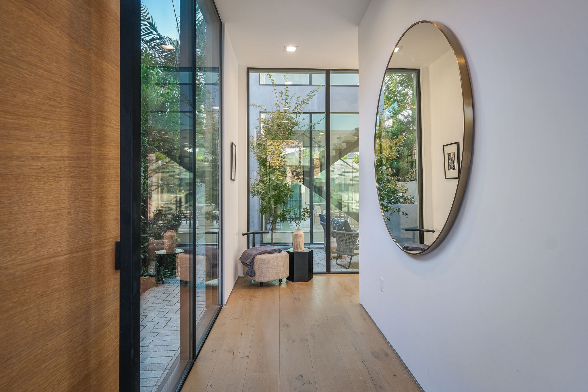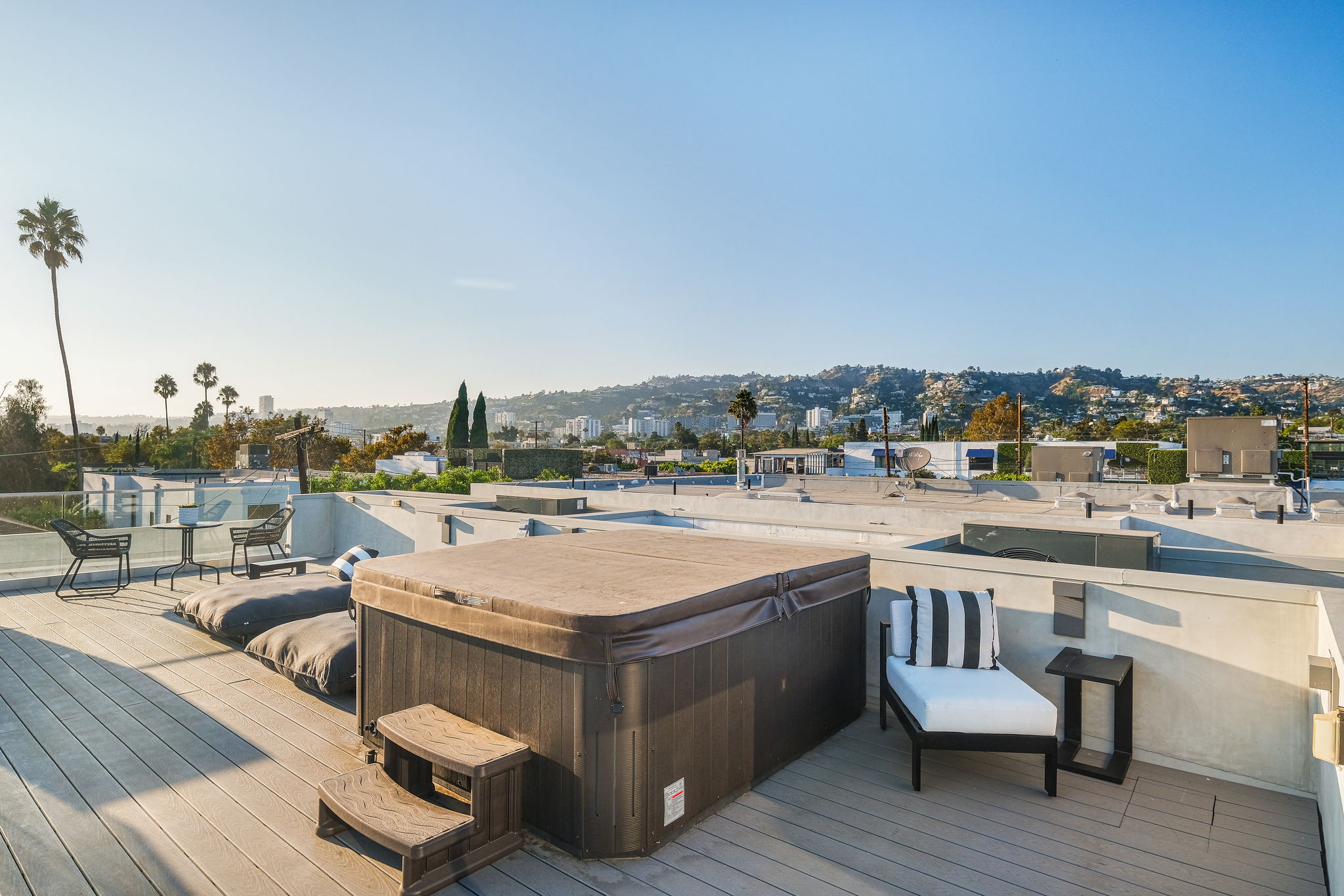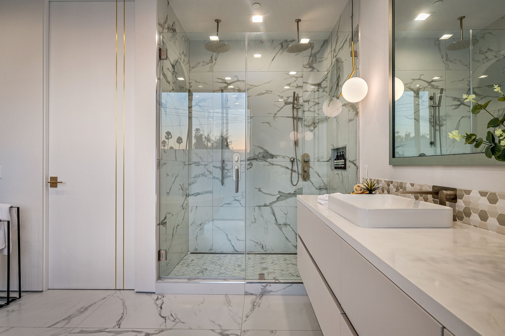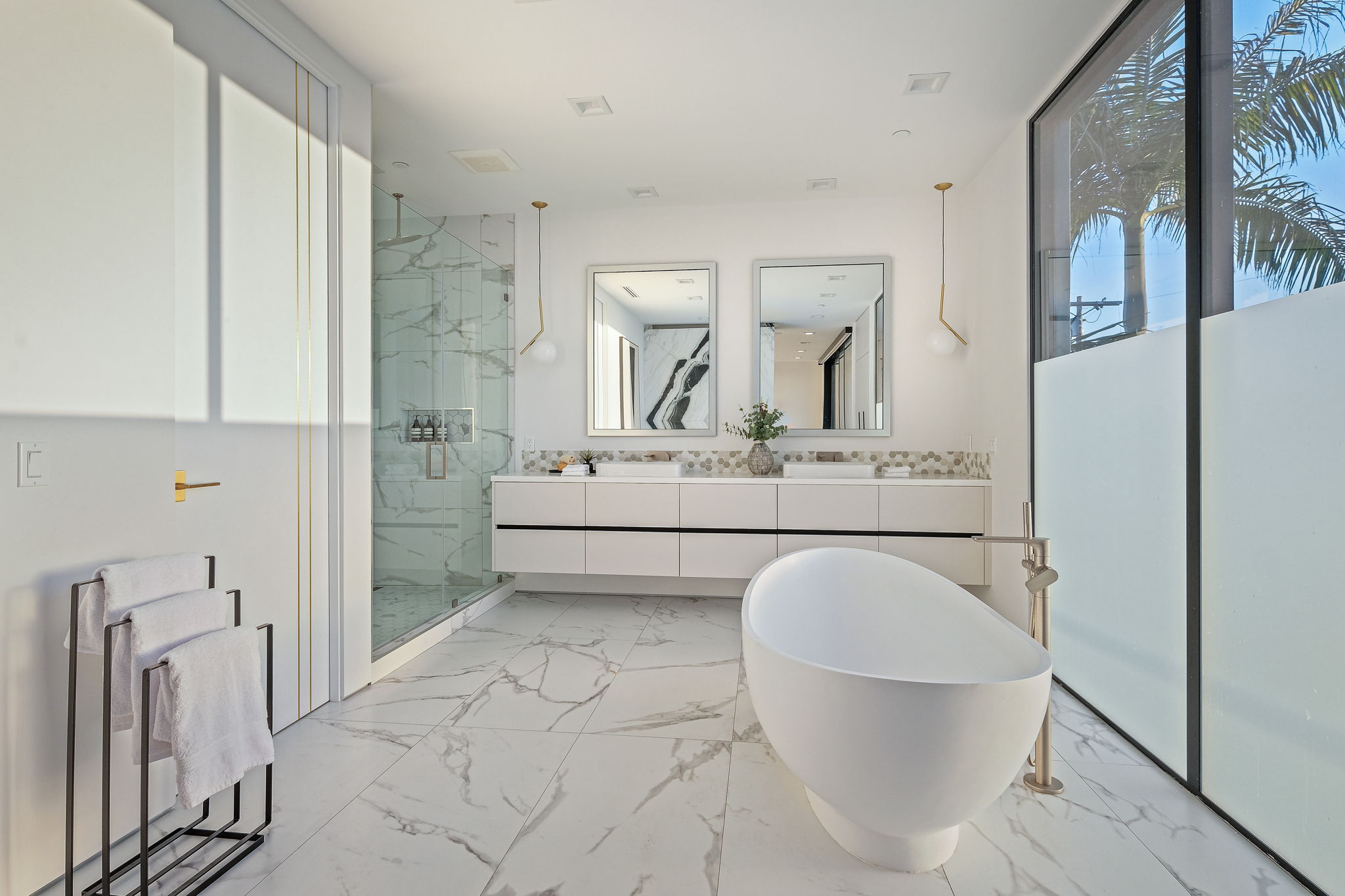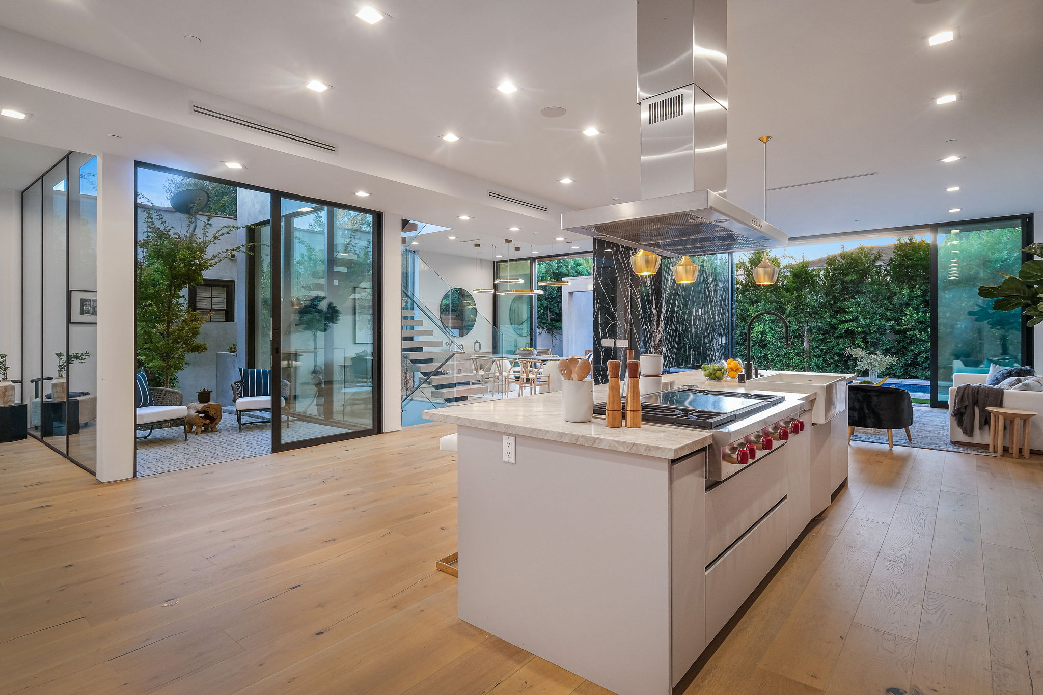 A newly-built and exquisitely designed contemporary, effortlessly combining elements of stone, wood, and marble within 5,681 sq. ft. of beautiful interior living space. Featuring a flexible open floor plan, the living and dining spaces are separated by a floor-to-ceiling marble fireplace, with massive glass Fleetwood sliding doors allowing an abundance of natural light. Quintessential indoor/outdoor living from the privately-hedged backyard with gorgeous saltwater pool/spa and cabana area. A massive entertainers rooftop deck boasting panoramic views of the city and mountains. Designer finishes, clean lines, and stylish accents at every turn. The oversized owner's suite is an absolute dream with a two-way stone fireplace separating the sultry spa-like bath, and custom walk-in closet with LED lighting. Entertainment level with walk-in wine cellar and movie theater. 2-car garage with gated driveway. A truly impressive property when considering its size, scale, sophistication, and quality.