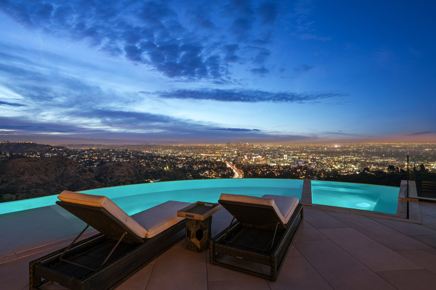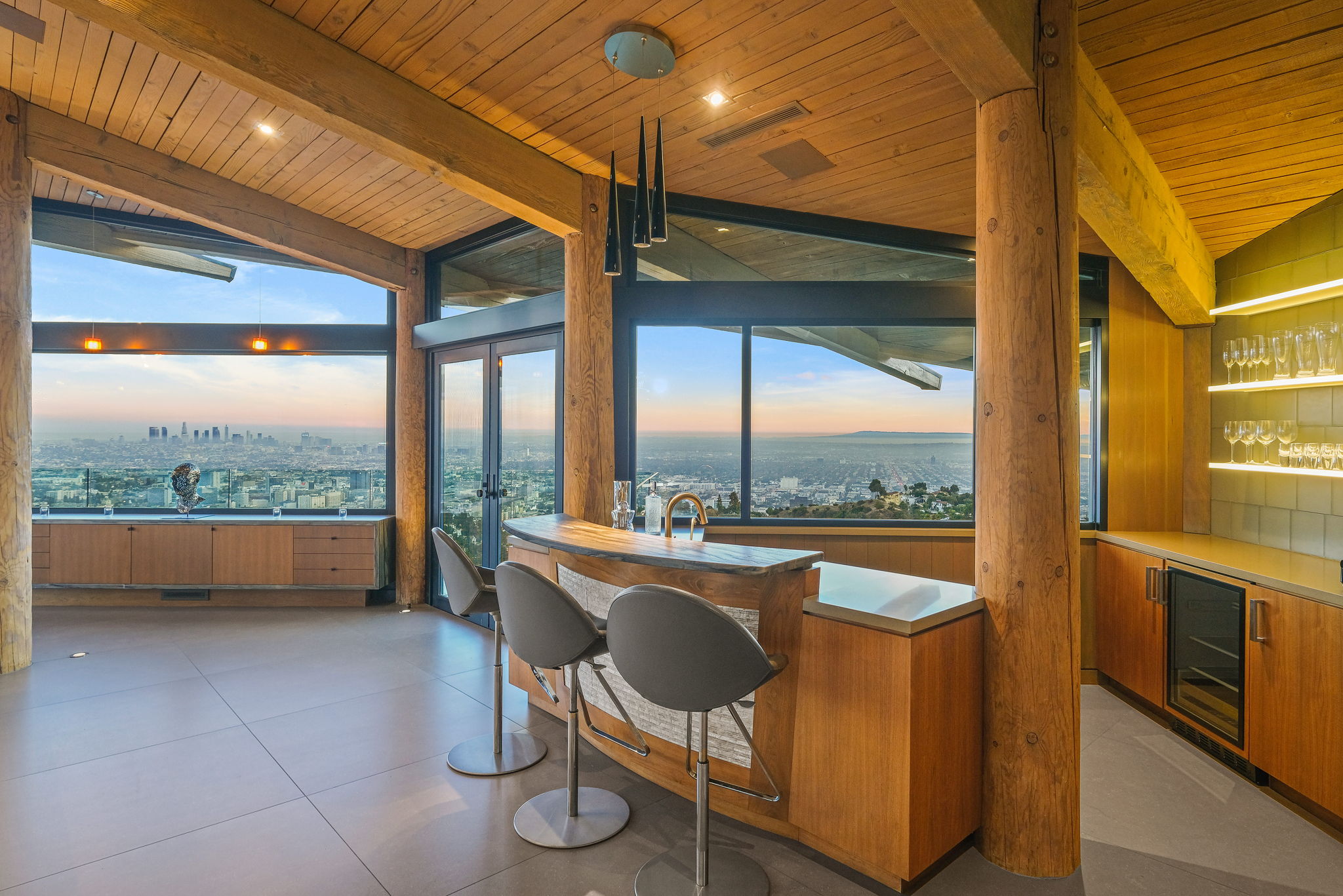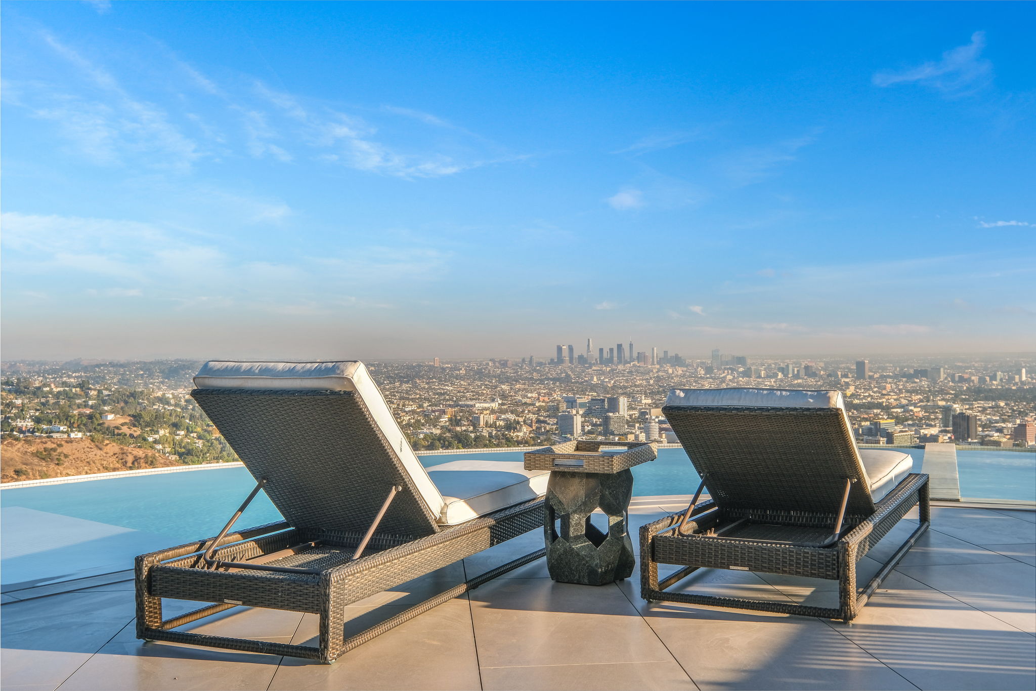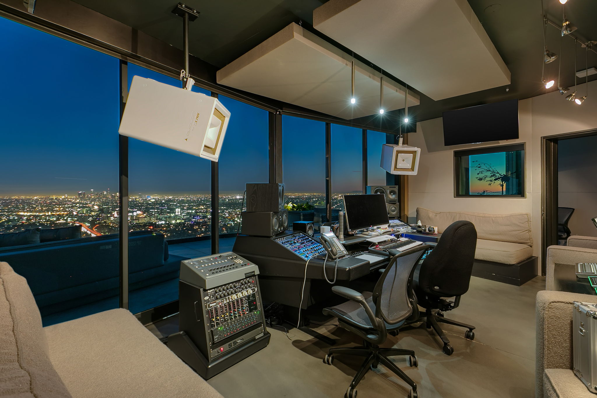 Simply unrivaled. This is the sexiest, most timeless, and architecturally impressive estate in the Hollywood Hills. Designed by the legendary Harry Gesner, and set on its own promontory behind private gates, this tour-de-force overlooks some of the most iconic views in all of Los Angeles and boasts extraordinary craftsmanship with a stylistic confluence of modernity and sophistication that redefines all expectations. An open floor plan, vaulted wood plank ceilings, and disappearing glass doors throughout the home provide a plethora of natural light and seamlessly integrate the indoor/outdoor spaces for entertainment and relaxation. The top-level offers a chef's kitchen with custom cabinetry and top-of-the-line appliances, a spacious living and dining area with a custom-built bar, and a separate office. Down the elevator, the owner's suite and bathroom have unparalleled views of the Hollywood sign and the city skyline behind the infinity pool. The recording studio, located separately from the main house, has been fitted with the best equipment the industry has to offer. 2-car garage and plenty of space for additional parking on the courtyard. This reimagined house celebrates the site and our 21st-century lifestyle and will be an architectural beacon for generations to come.