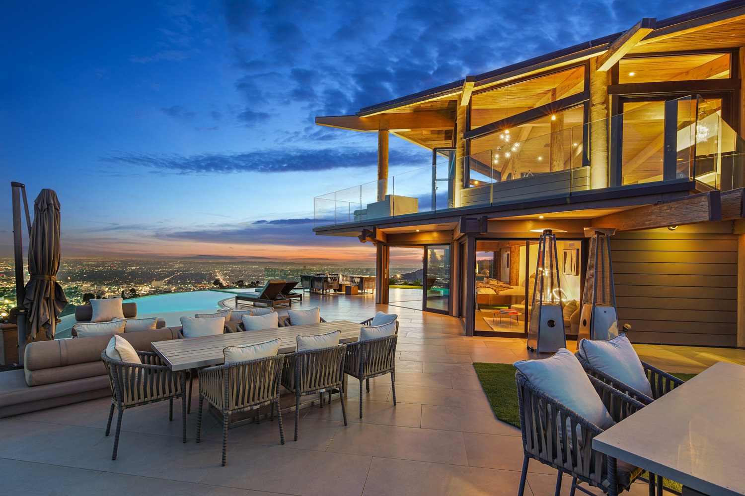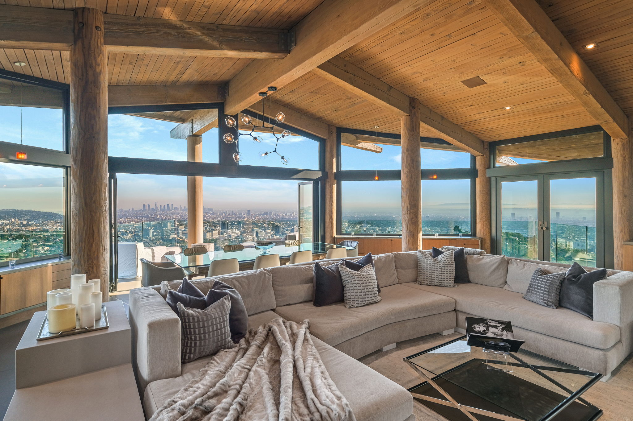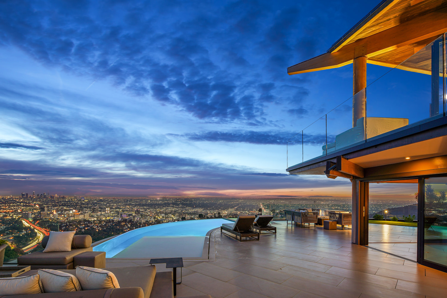Simply unrivaled. This is the sexiest, most timeless, and architecturally impressive estate in the Hollywood Hills. Designed by the legendary Harry Gesner, and set on its own promontory behind private gates, this tour-de-force overlooks some of the most iconic views in all of Los Angeles and boasts extraordinary craftsmanship with a stylistic confluence of modernity and sophistication that redefines all expectations. An open floor plan, vaulted wood plank ceilings, and disappearing glass doors throughout the home provide a plethora of natural light and seamlessly integrate the indoor/outdoor spaces for entertainment and relaxation. The top-level offers a chef's kitchen with custom cabinetry and top-of-the-line appliances, a spacious living and dining area with a custom-built bar, and a separate office. Down the elevator, the owner's suite and bathroom have unparalleled views of the Hollywood sign and the city skyline behind the infinity pool. The recording studio, located separately from the main house, has been fitted with the best equipment the industry has to offer. 2-car garage and plenty of space for additional parking on the courtyard. This reimagined house celebrates the site and our 21st-century lifestyle and will be an architectural beacon for generations to come.