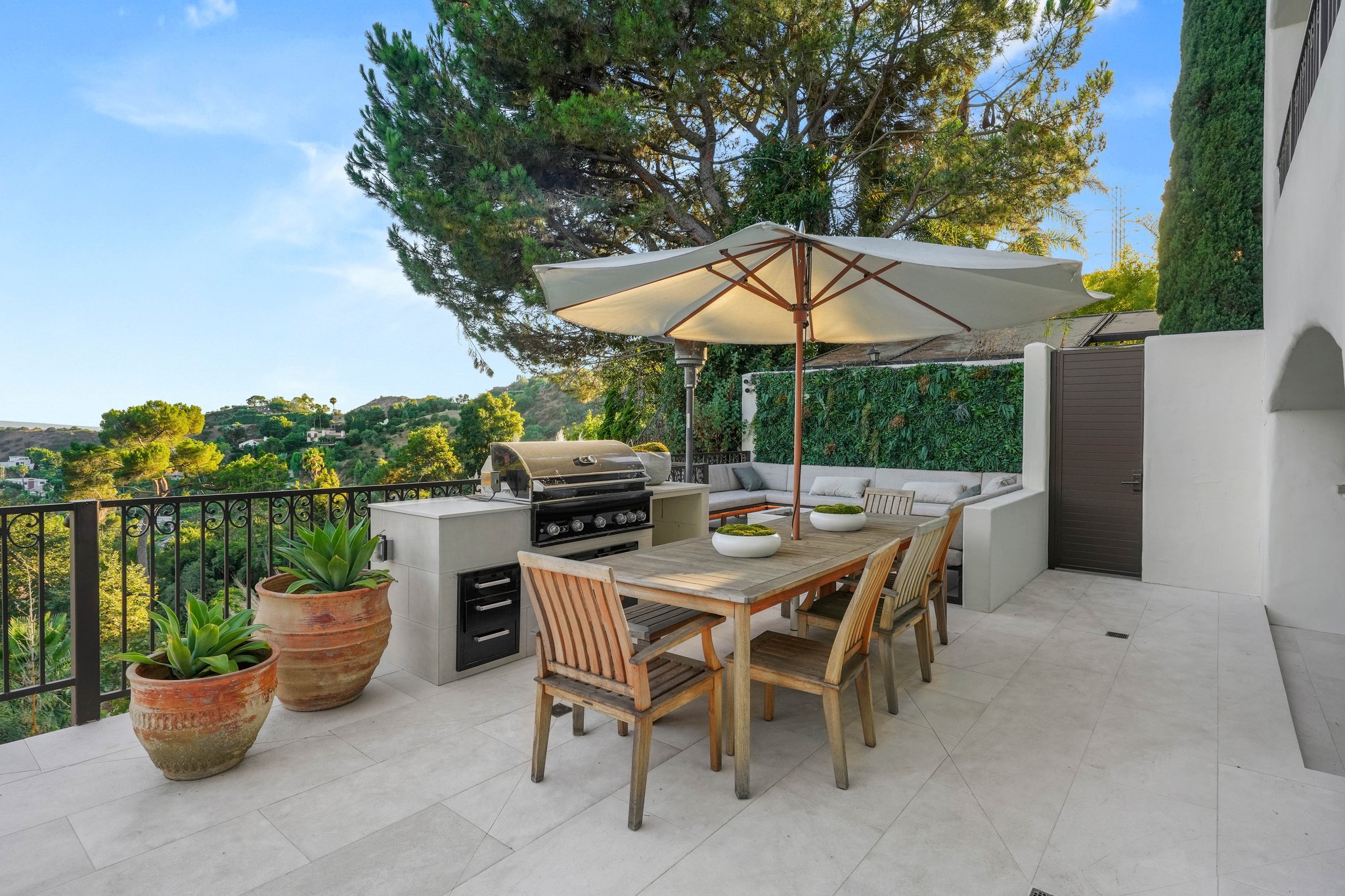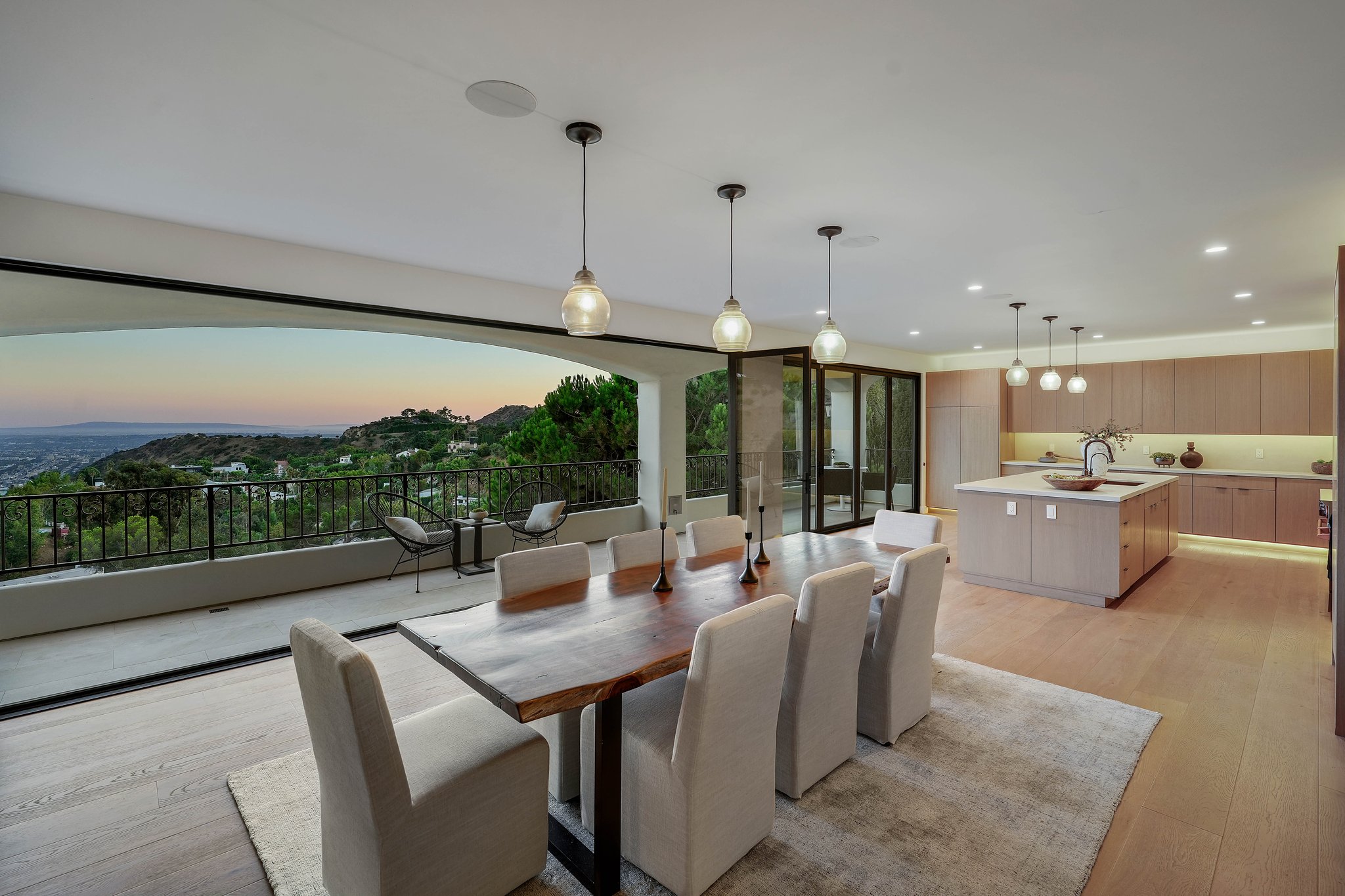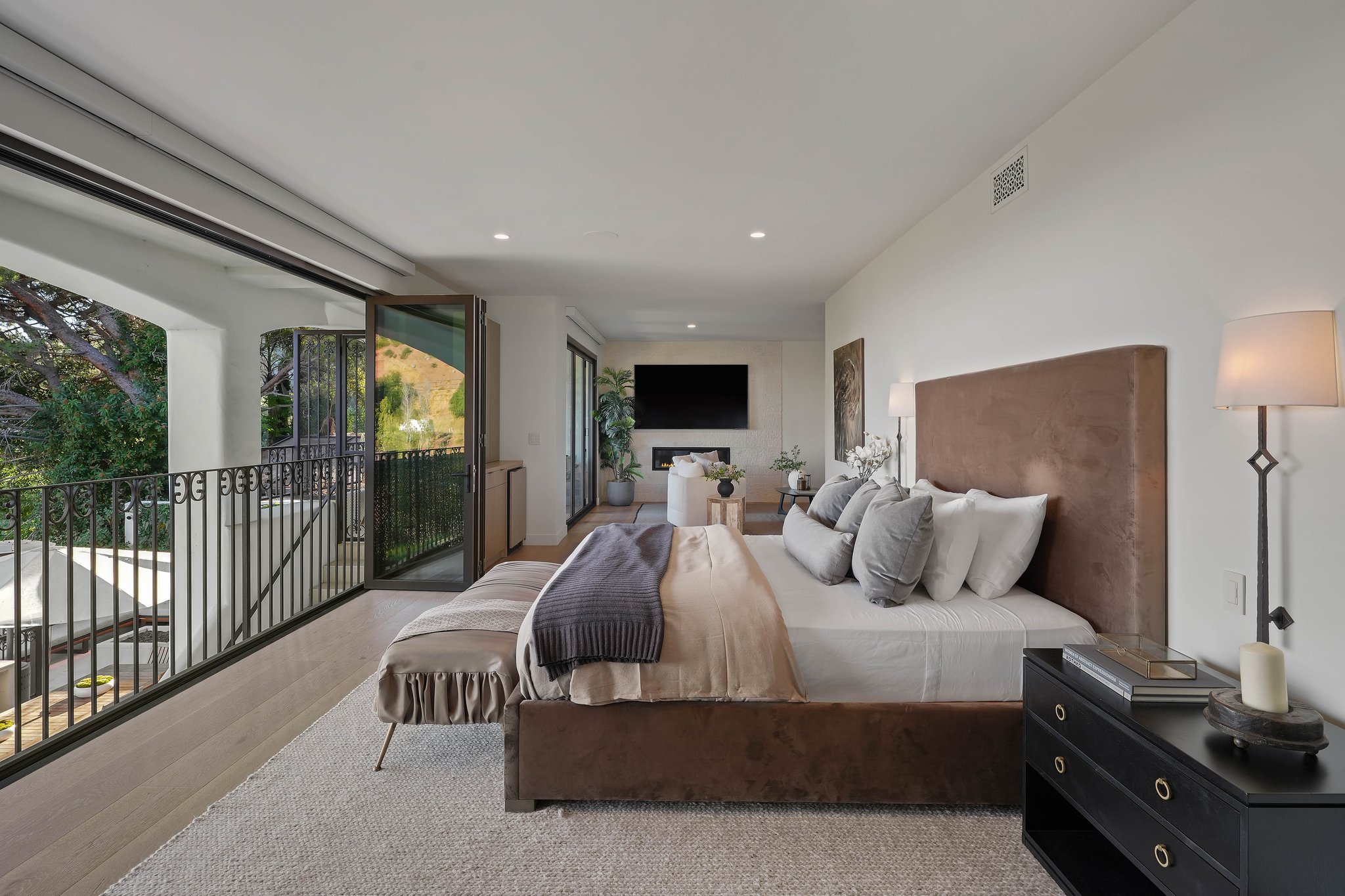 Perched in the Hollywood Hills behind private gates, discover unparalleled luxury in this beautifully renovated Contemporary Mediterranean estate offering breathtaking jetliner views of the Los Angeles skyline. This exceptional home combines elegance with a warm and organic flair, creating a serene and sophisticated retreat. Enter past the manicured lawn with gorgeous olive trees, to an expansive open floor plan where the living and dining areas effortlessly flow into a gourmet chef’s kitchen replete with bespoke neutral-toned cabinetry. A towering wall of sliding glass doors reveals the spectacular city and canyon views, leading to a sprawling balcony perfect for al fresco dining and relaxation. The nearly 2,000 sq. ft. primary suite includes a wet bar, balcony, cozy fireplace with private living area, and a luxurious ensuite bathroom that is complemented by a vast walk-in closet. Descend via the private elevator to a realm of opulent amenities, including a state-of-the-art home theater, an indoor/outdoor entertainment level, and a wellness center complete with a massage area, sauna, and gym. The backyard is an entertainer’s dream, featuring an elegantly lit outdoor space with a bar, fire-pit, BBQ area, and a stunning pool and spa. The gated parking area can accommodate up to 4 vehicles, in addition to a substantial 3-car attached garage. Modern conveniences include advanced smart home automation and surveillance systems, ensuring both comfort and security. Conveniently located near Runyon Canyon and just a short drive from Hollywood and Studio City.