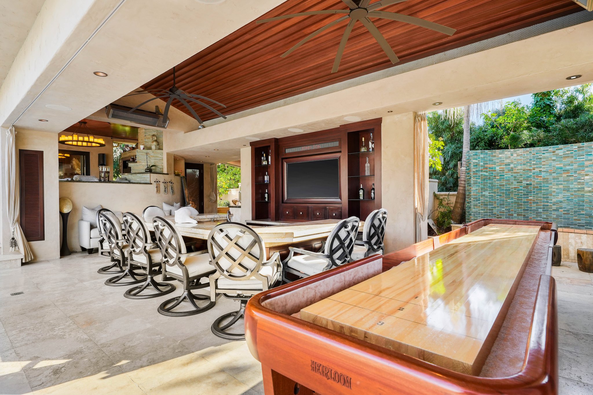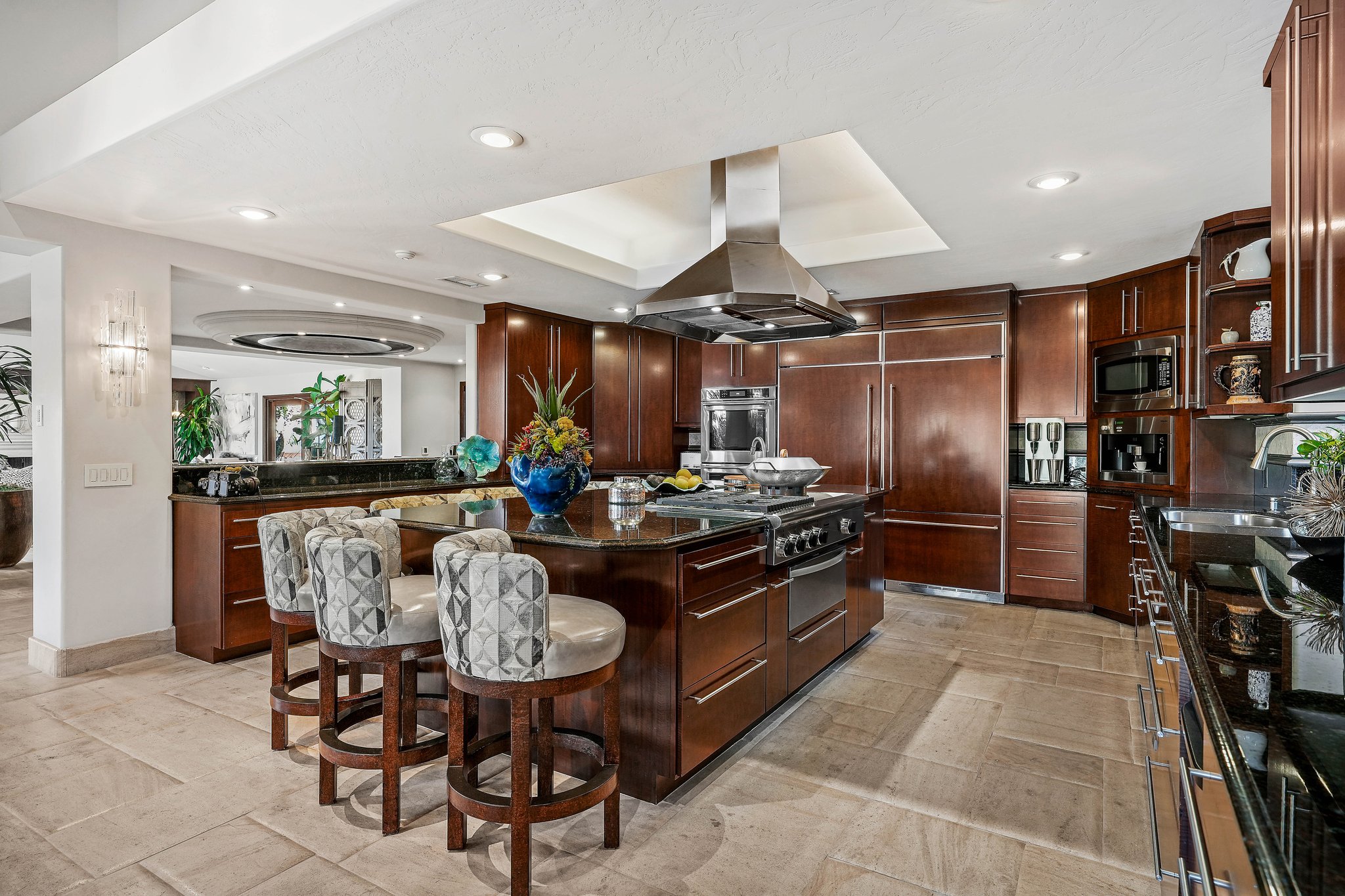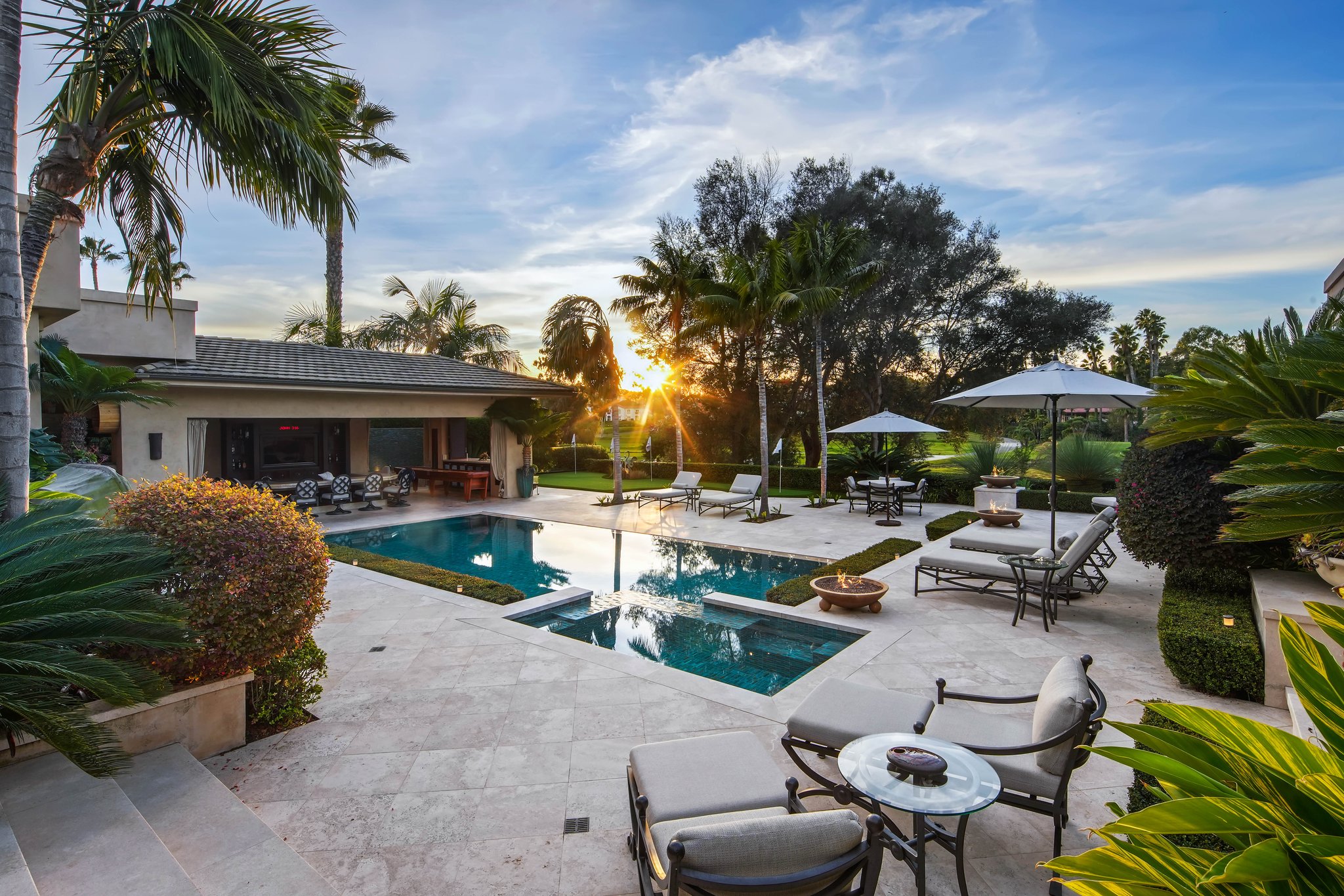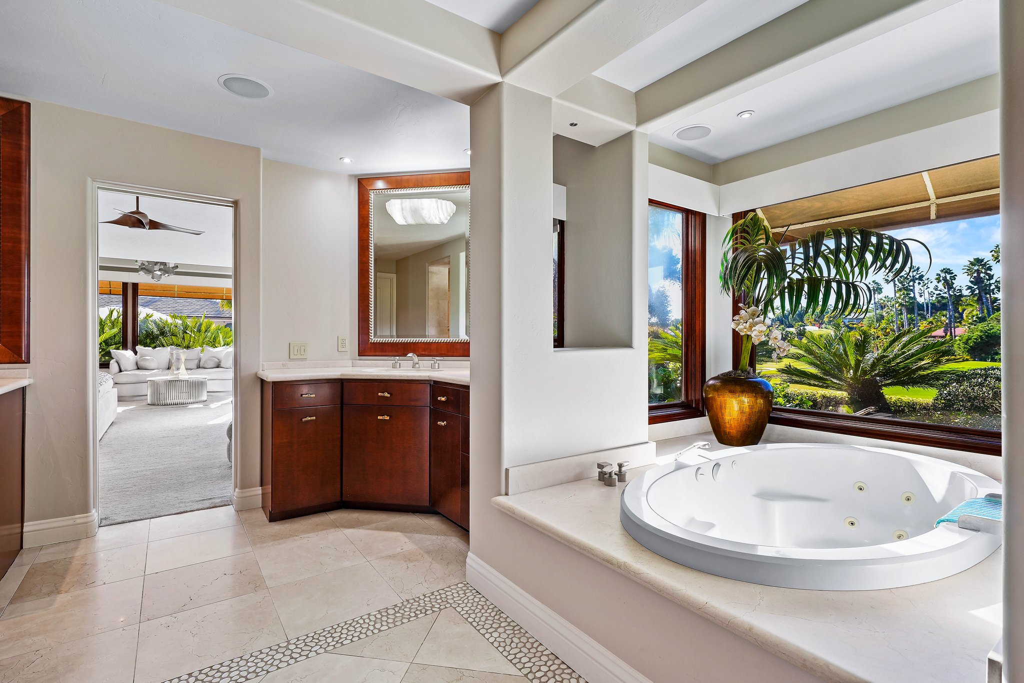As you enter this grand estate beyond a long, private driveway, you are enveloped in unparalleled luxury within the residence, gracefully situated along the 14th fairway of the La Costa Golf Course, recently revitalized by acclaimed golf-course architect Gil Hanse. After crossing a bridge above a beautiful koi pond leading to a grand doorway, a tranquil ambiance envelops you, marked by a magnificent water wall that establishes Feng Shui harmony. This residence, which boasts panoramic views of the esteemed golf course, seamlessly integrates indoor and outdoor living, with each room effortlessly connecting to the expansive yard. The gourmet kitchen is a culinary sanctuary equipped with state-of-the-art Gaggenau appliances including a steamer/wok, double oven, and multiple dishwashers for unparalleled convenience. Enjoy dynamic gatherings in the Teppanyaki room, featuring a professional cooktop and custom copper hood that transforms into a poker table and cigar lounge. A smart home system allows for effortless control of lighting, sound, and a nine-foot drop-down theater screen in the living room. Additional features include an outdoor humidor, wine bar, wood-fired pizza oven, and a fully lit outdoor bar with heated countertops. Entertainment reaches new heights with a private putting green and a newly tiled pool/spa accompanied by a water wall featuring a fire element. The outdoor area extends to a covered full catering Viking kitchen equipped with a large BBQ, smoker oven, refrigerator, dishwasher, and warming drawers. The ultimate primary suite features a seating area, a private patio, and a luxurious walk-through shower. The primary suite patio overlooks the 14th fairway, making it a perfect vantage point for golf tournaments. For golf enthusiasts, the property offers private automatic gates for golf cart access directly onto the green, providing a rare and exclusive experience. Ample parking for 10+ cars on a long driveway and additional three car garage. Revel in a lifestyle seldom captured, tailored for connoisseurs who appreciate the enchantment of grand entertaining and the allure of intimate gatherings in a meticulously crafted oasis.
