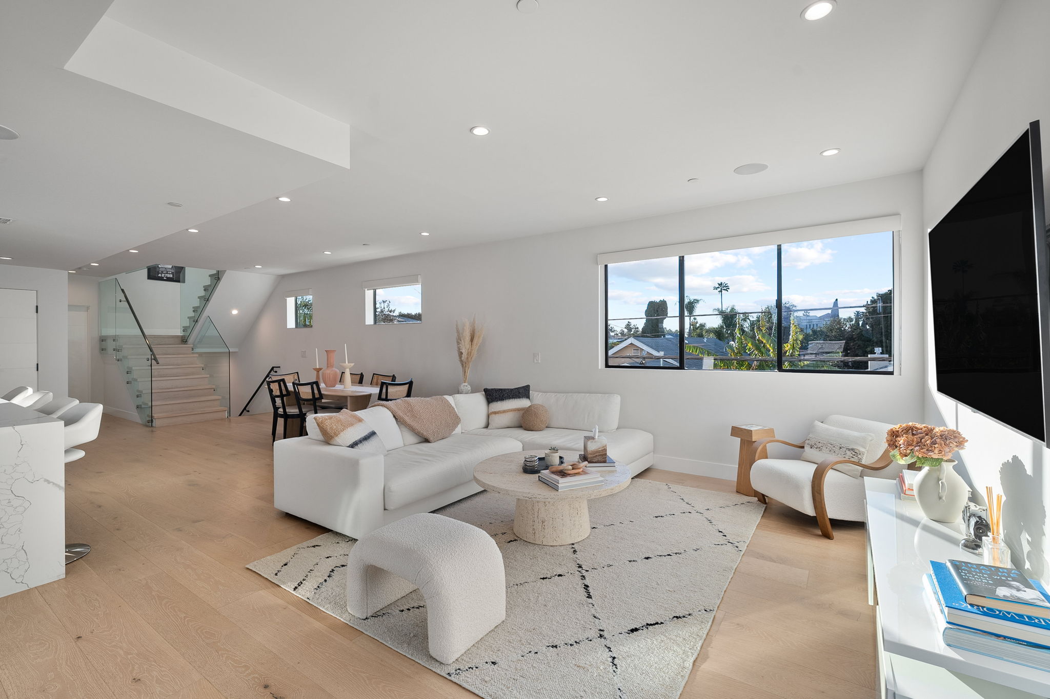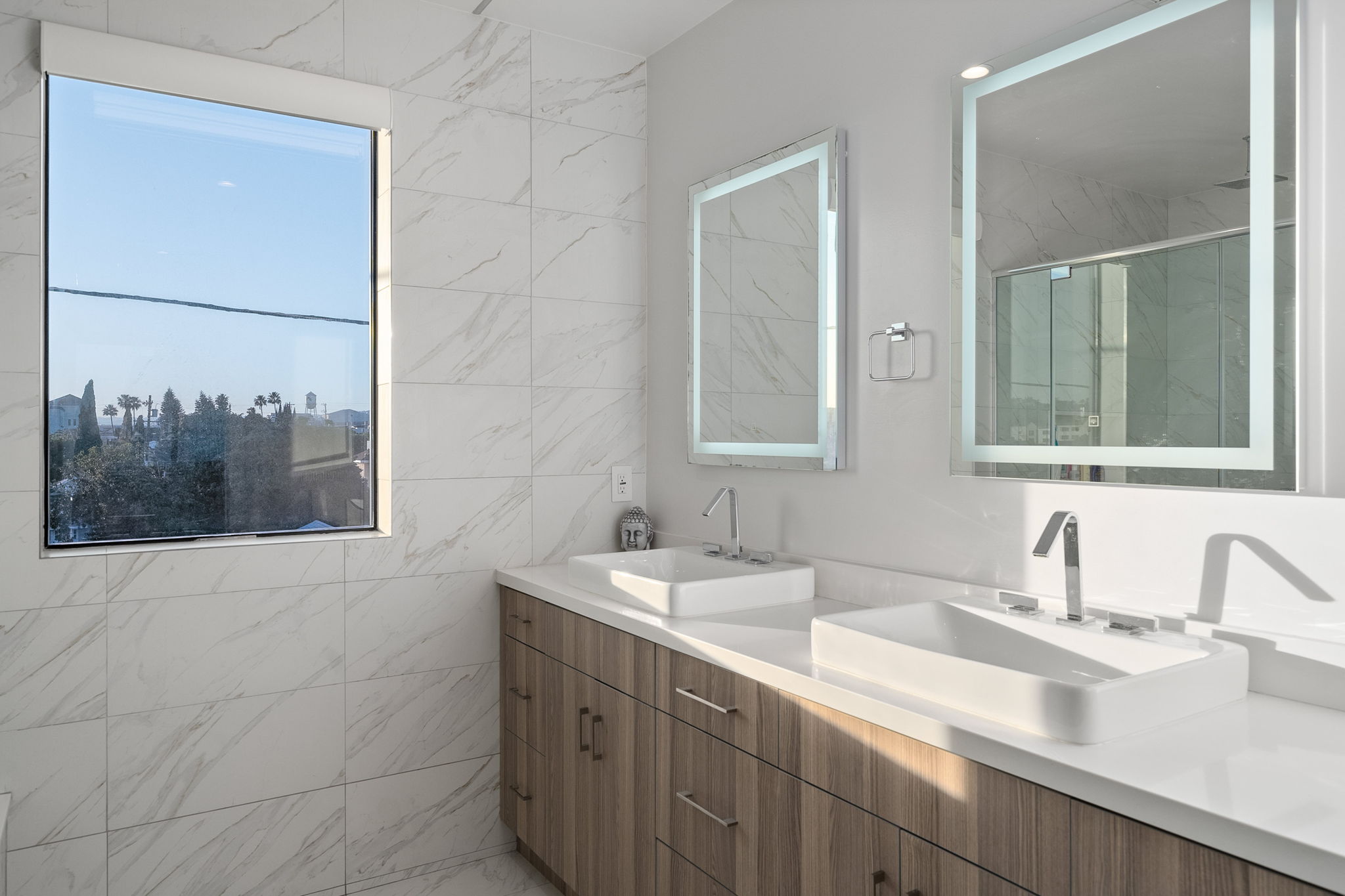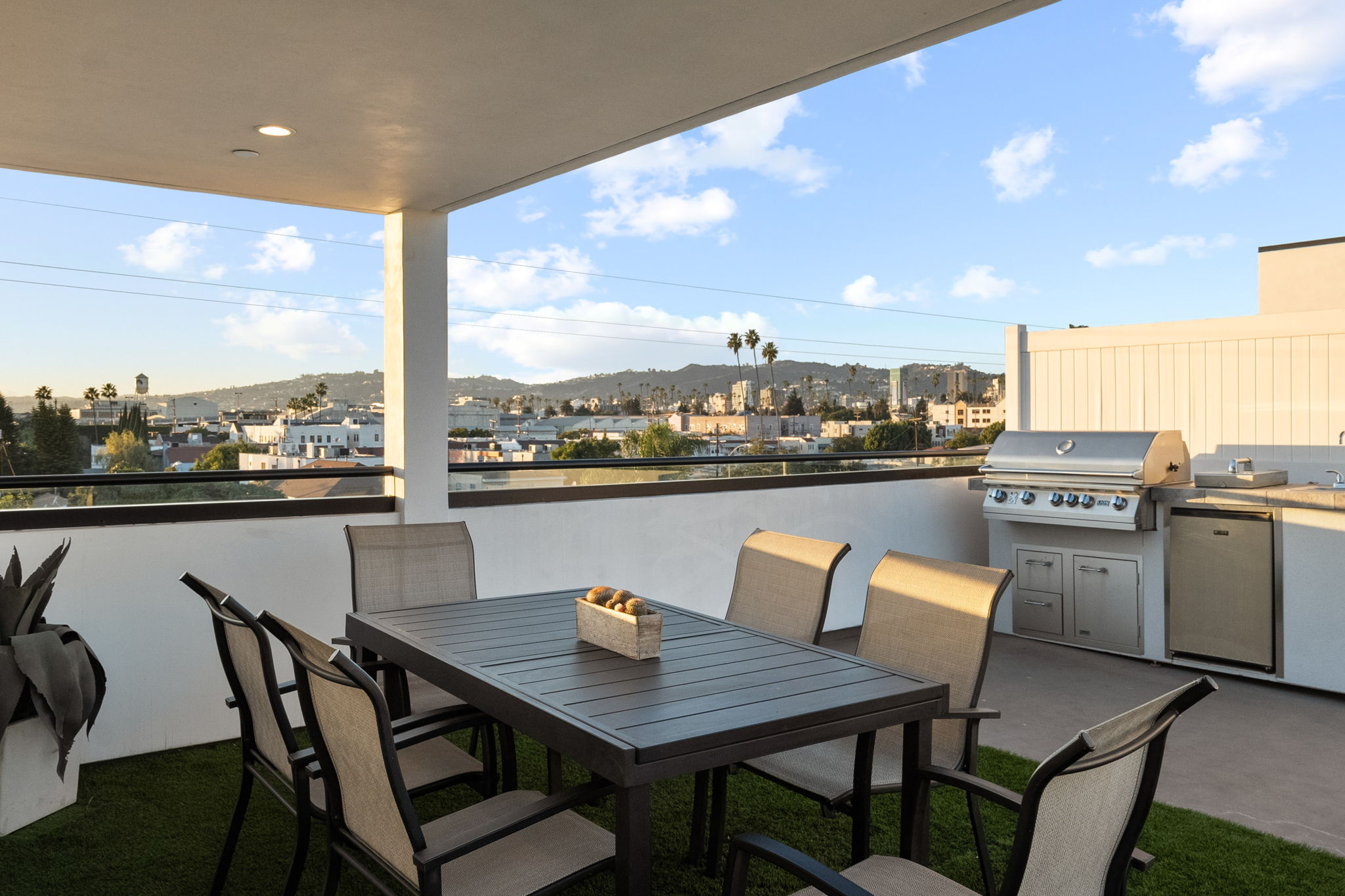 A stunning contemporary residence with an 800+ sq. ft. rooftop patio offering gorgeous Downtown views, located just moments from both Hollywood and Larchmont. Featuring an 8’ mahogany entry door, an open floor plan, soaring ceilings, and expansive Fleetwood sliding doors, this property seamlessly blends luxury and modern comfort. The home is replete with 4 bedrooms, 3 baths, and a gourmet chef’s kitchen with quartz countertops and a waterfall island with built-in breakfast bar. The spacious master suite boasts walk-in closets and a spa-like bath with dual sinks, premium fixtures, and LED mirrors. Designer amenities include wide-plank oak flooring, custom blinds throughout, in-ceiling speakers, and Control4 smart home automation. The expansive rooftop patio has built-in speakers, a pre-wired TV setup, and outdoor kitchen perfect for relaxing or entertaining under the stars with breathtaking views. Attached 2-car garage. Located just moments from the city’s finest dining and entertainment, this residence perfectly blends upscale living with unmatched convenience.