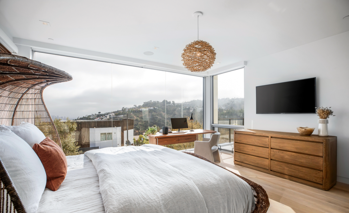 Ideally located in coveted Mount Olympus, this soft contemporary view home is designed with great attention to detail. Recently remodeled from the studs up, this gated and secure home features 4 bedrooms and 4 bathrooms + an expansive home gym and state-of-the-art theater. Numerous designer fixtures and finishes throughout, including European white oak floors, 100-year-old reclaimed Brazilian teak cabinetry, Ann Sacks tile, and custom window treatments. A top-of-the-line chef's kitchen complete with Sub Zero & Wolf appliances is situated between a dining area and large living area on the main floor, all of which open to resort-like outdoor dining and lounging, complete with a generous turf yard, pool & spa with LED lighting and waterfall, built-in seating area with fire pit, fireplace and a new custom built-in BBQ area. Carefully considered details continue to 2 master bedrooms with outdoor decks and spa-like en suite baths. 2 additional guest bedrooms and bathrooms complete the home. Nearly every indoor space flows effortlessly to the outdoors with city and ocean views from both master suites and kitchen & dining spaces. Boasting an elevator, 4-car garage with epoxy floor, accent lighting & marble feature wall, total privacy, and central location to all the shopping, dining, & nightlife that the Sunset Strip has to offer, this home is not to be missed!
