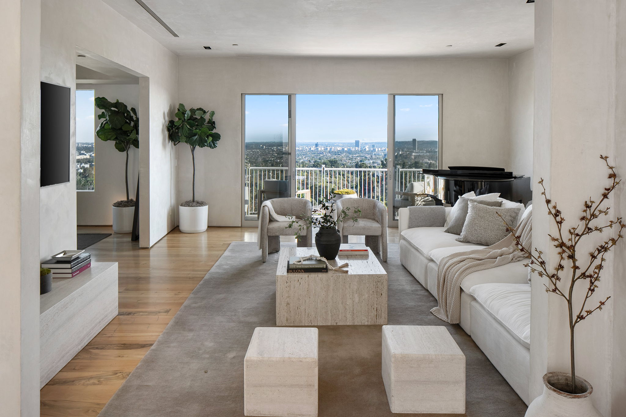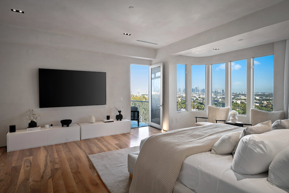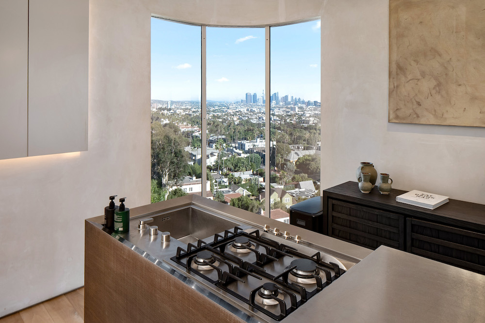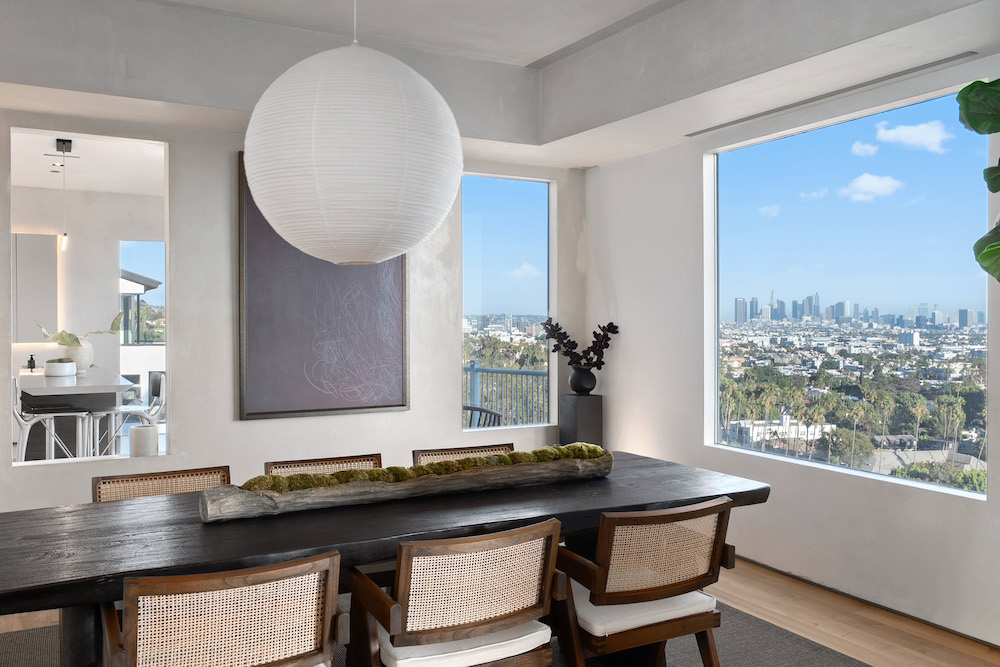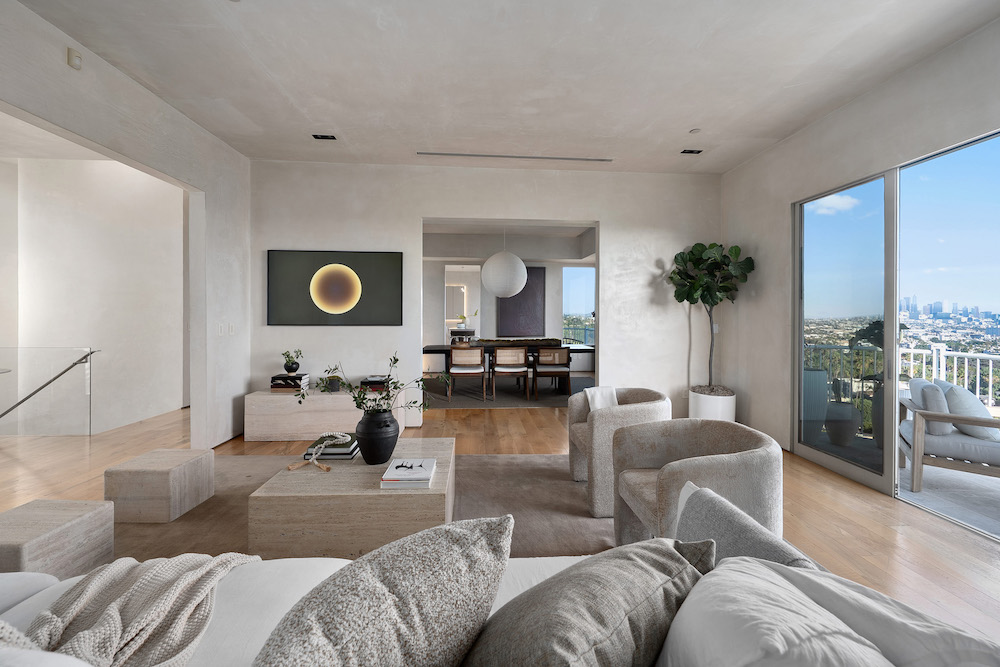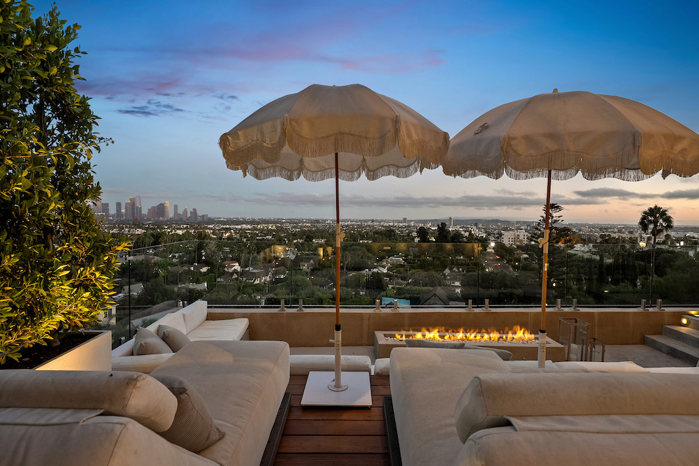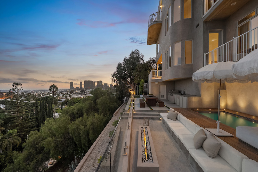 This privately-gated and former celebrity-owned contemporary hideaway sits above it all, with jetliner views stretching from Downtown LA to Century City and out to the ocean. Framed by a dramatic pivot door, the designer-done home opens to soaring ceilings, smooth Venetian plaster, hardwood floors, and sun-drenched interiors that exude a sophisticated and organic feel. The main level showcases a spacious formal living room that flows seamlessly into the dining area and chef's kitchen, designed for both effortless entertaining and everyday living. The relaxing primary suite offers a travertine-cladded spa-like bathroom with walk-in shower and separate soaking tub, a picture window framing endless panoramic vistas, and an oversized walk-in closet. Two additional guest bedrooms are replete with en-suite baths and private balconies, with an additional flexible space that can serve as a screening room, office, or fourth bedroom. Outdoors, this estate takes entertaining to the next level with a newly added outdoor kitchen/BBQ, in-ground spa, sauna, outdoor shower, and dramatic outdoor fireplace with built-in seating providing the perfect stage for al-fresco dining, sunset gatherings, or simply unwinding above the city lights. With a prestigious history, unmatched style, and coveted location just moments from the Sunset Strip and West Hollywood, this residence is truly a private retreat set against one of the most breathtaking backdrops in Los Angeles.