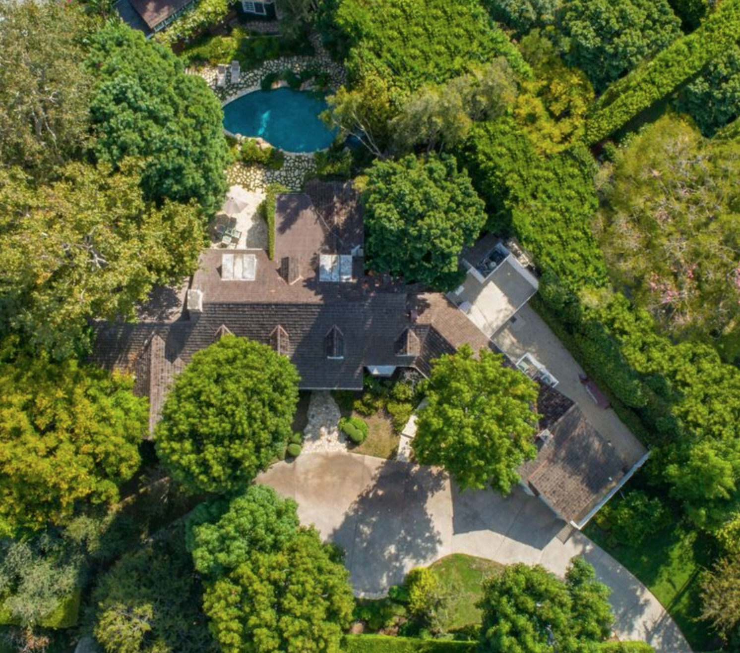 Set on over a half-acre lot in prime Beverly Hills flats minutes from Rodeo Drive & world class dining & entertainment. This charming family home was built by Mark Rios in 1952 & is an exceptional example of Colcord design. Upon entering, it's clear that this home was built & designed to the highest level of style & luxury of its time. Enter through private & gated driveway to semi-circular motor court & picturesque grounds, which are entirely surrounded by mature landscaping for privacy. Inside find a cozy living room w/bar & fireplace; den w/fireplace & rows of French doors opening to the serene back yard that includes pool, hot tub w/waterfall creating a Zen-like garden sanctuary. Large master suite includes 2 en-suite baths both w/own master closets & lounge area w/fireplace. Additional guest suites on 2nd level. Detached guesthouse includes large gym, office & meditation room.