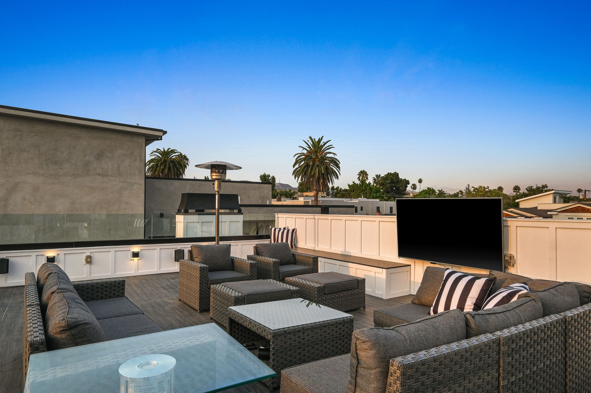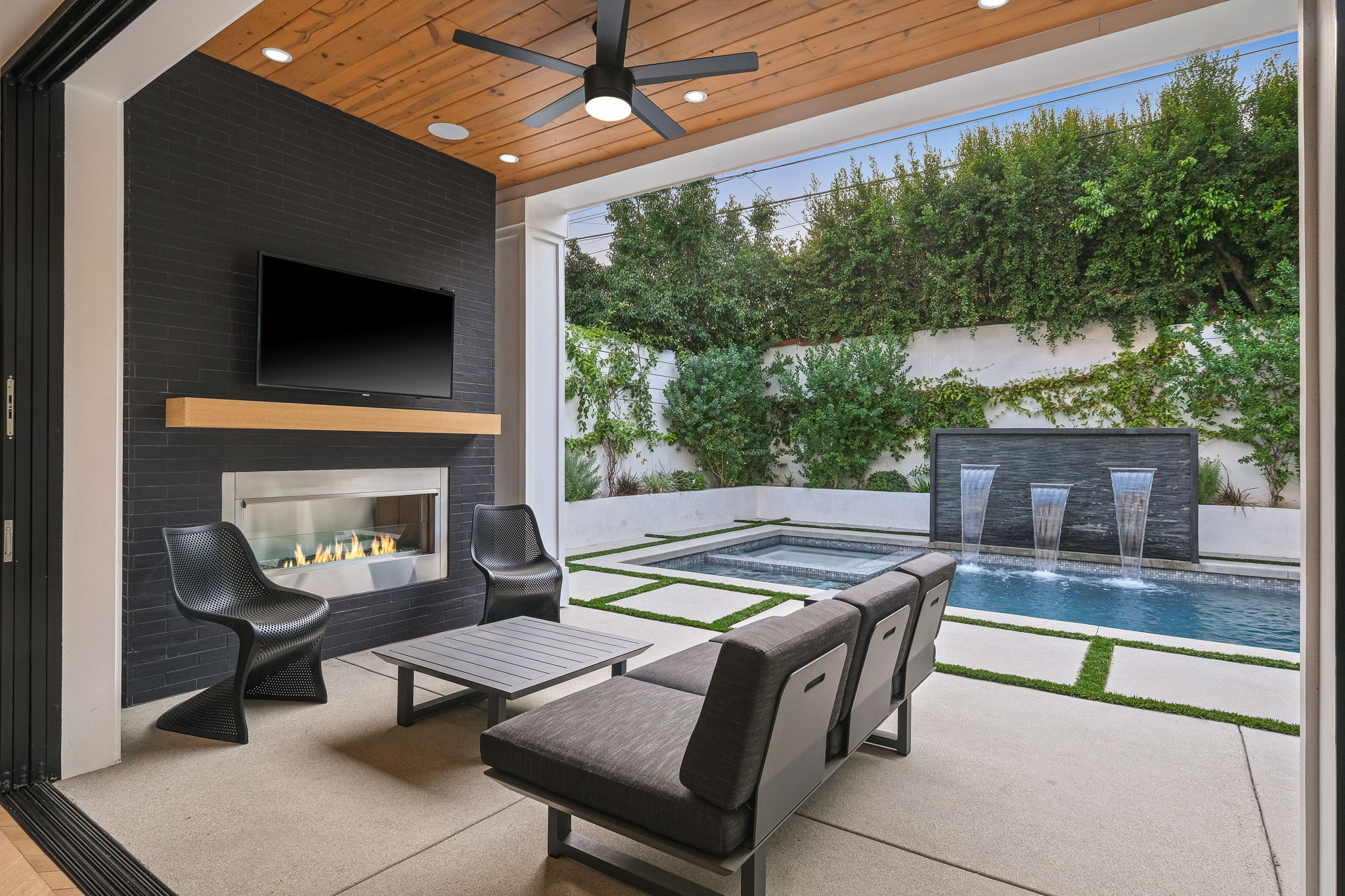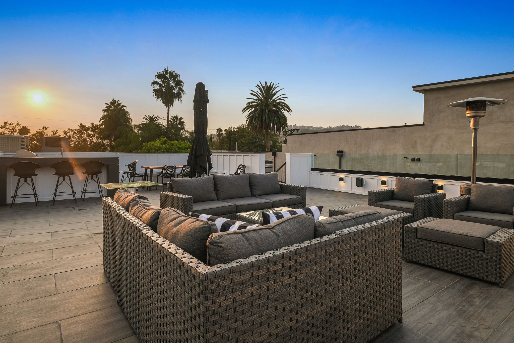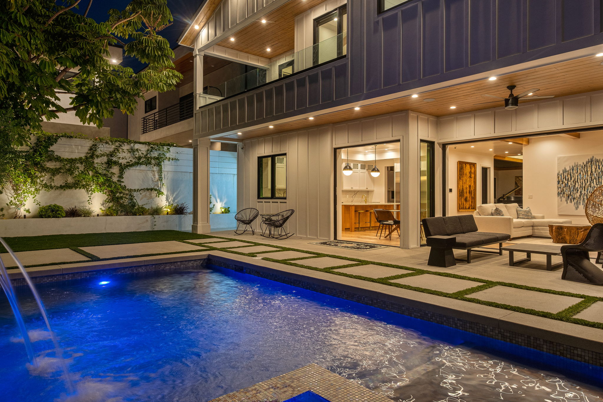 Privately gated, this new Contemporary Farmhouse offers a stunning retreat in the heart of the iconic Beverly Grove. With over 5,000 sq. ft. of exquisite craftmanship and designer aesthetic, this 5 bed, 6 bath home offers an open floor plan with Chef's kitchen complete with Sub-Zero and Wolf appliances, a theater and wine room, and a spacious office/gym. The main level opens up to a private garden with a pool and spa accentuated by a waterfall and cozy fireplace. The expansive owner's suite comes replete with a luxurious bath, walk-in closet, and private balcony. An entertainer's roof-top deck offers an outdoor kitchen with city and mountain views, including a full view of the Hollywood sign. This smart home features Control4 home automation, Tri-zone climate control, and a 2-car garage.