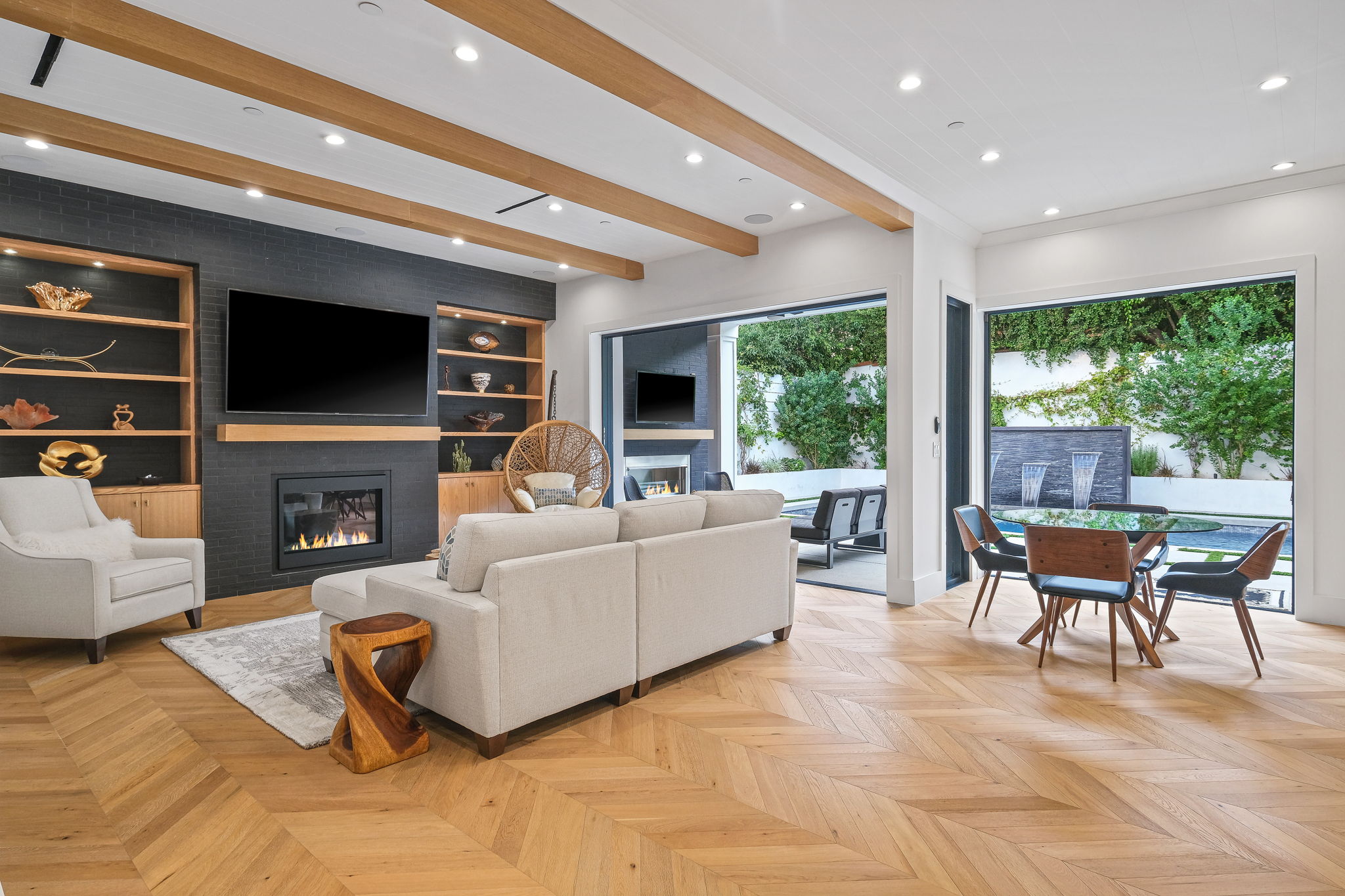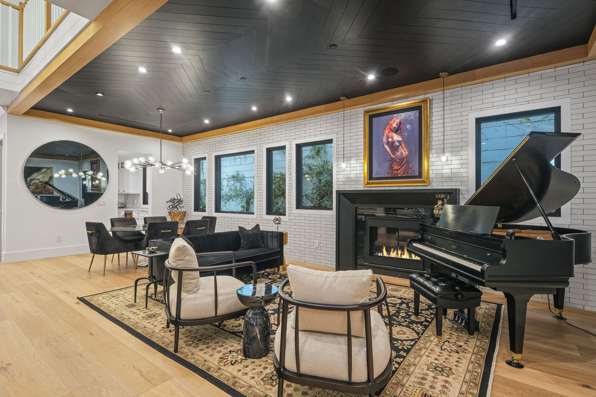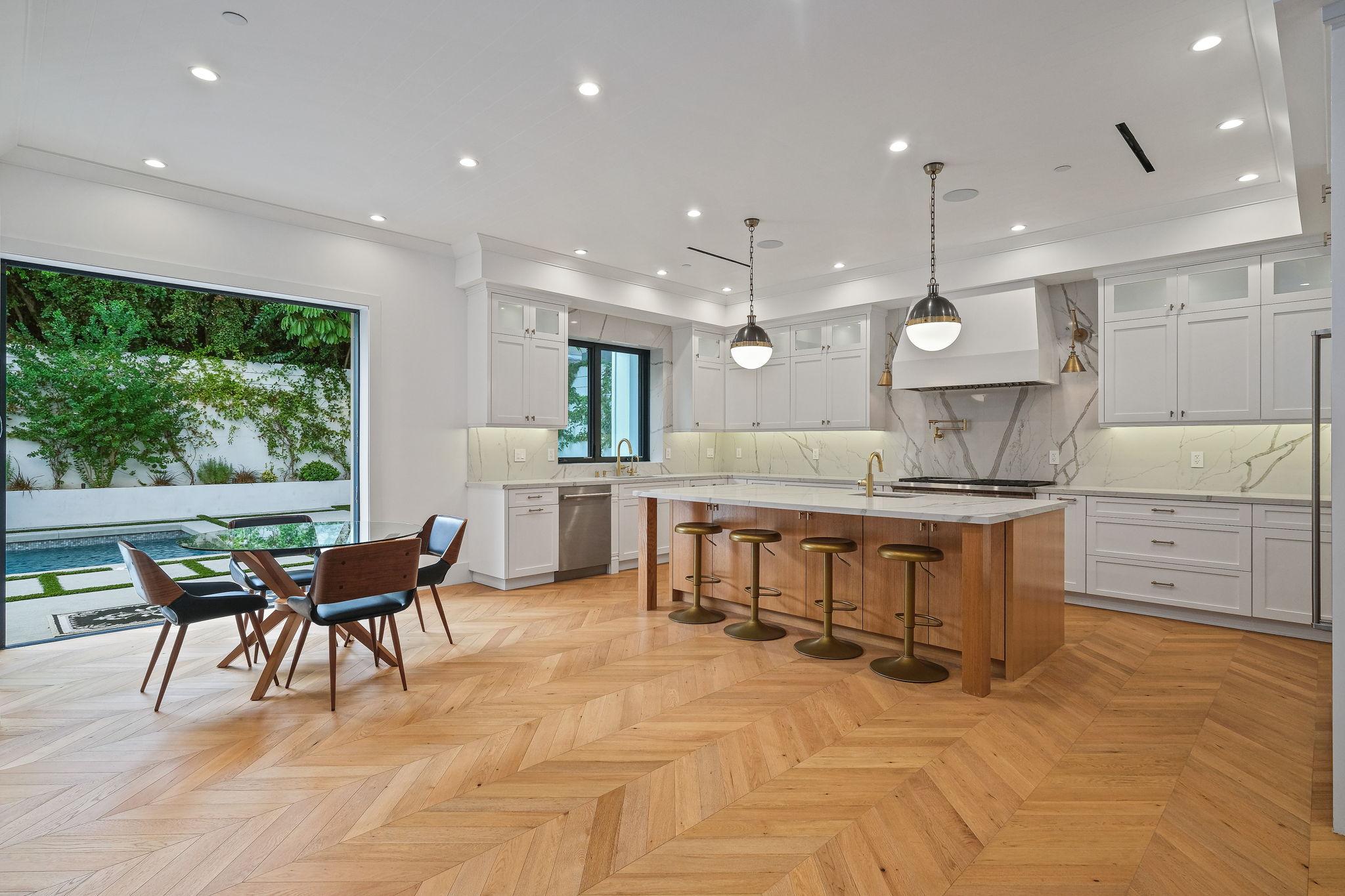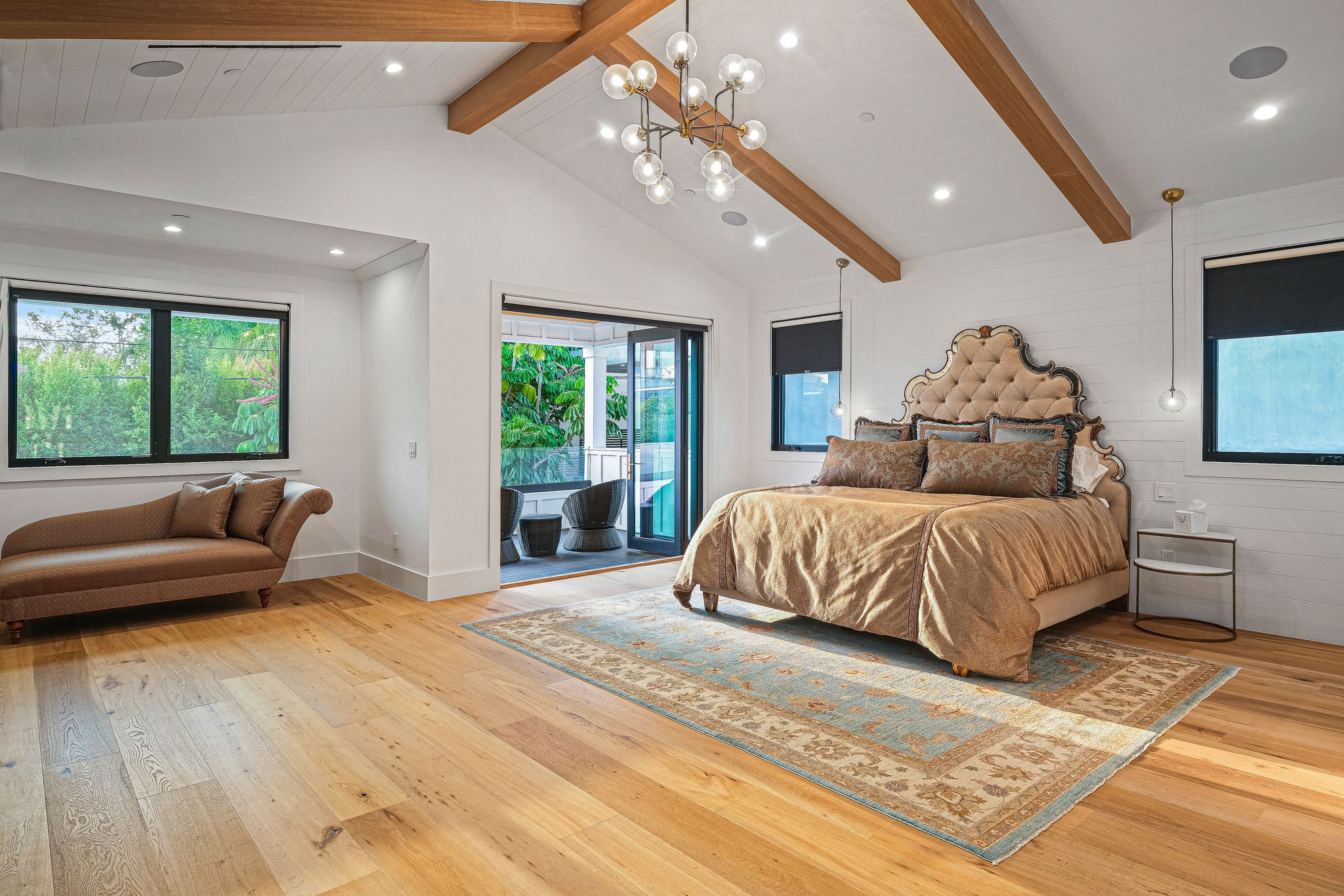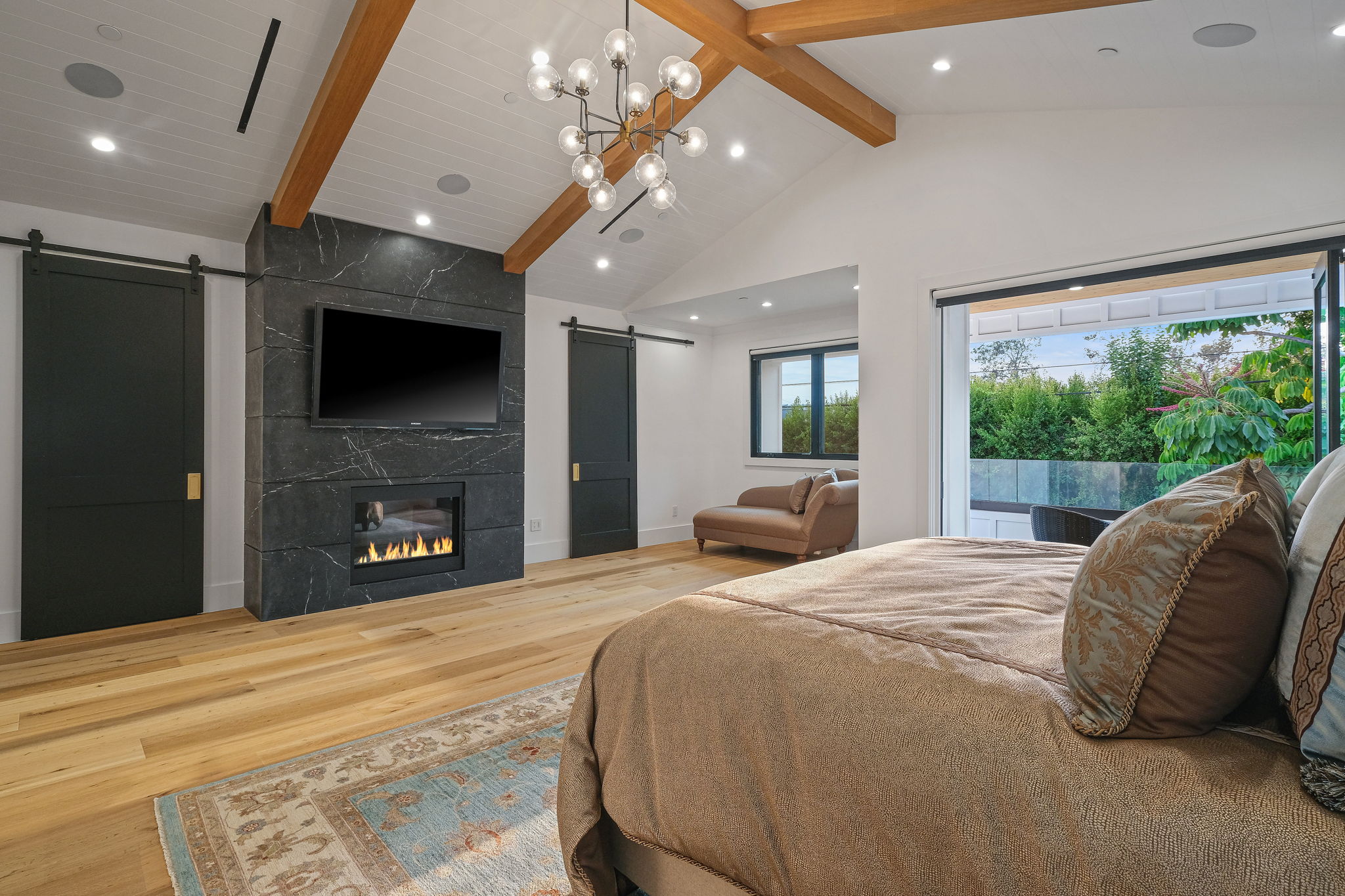 Privately gated, this new Contemporary Farmhouse offers a stunning retreat in the heart of the iconic Beverly Grove. With over 5,000 sq. ft. of exquisite craftmanship and designer aesthetic, this 5 bed, 6 bath home offers an open floor plan with Chef's kitchen complete with Sub-Zero and Wolf appliances, a theater and wine room, and a spacious office/gym. The main level opens up to a private garden with a pool and spa accentuated by a waterfall and cozy fireplace. The expansive owner's suite comes replete with a luxurious bath, walk-in closet, and private balcony. An entertainer's roof-top deck offers an outdoor kitchen with city and mountain views, including a full view of the Hollywood sign. This smart home features Control4 home automation, Tri-zone climate control, and a 2-car garage.