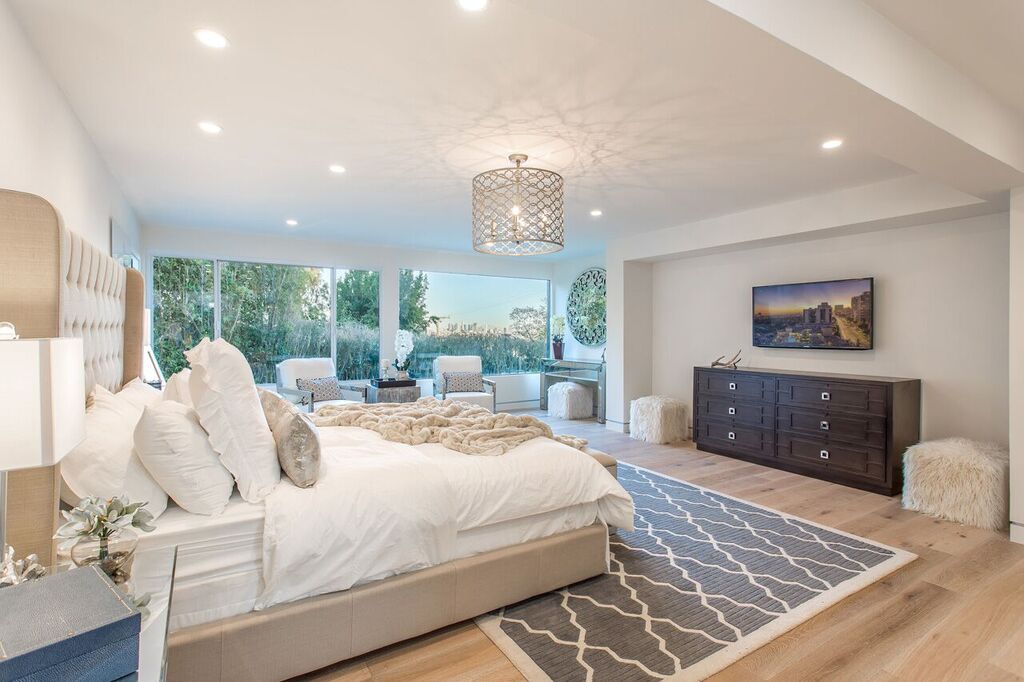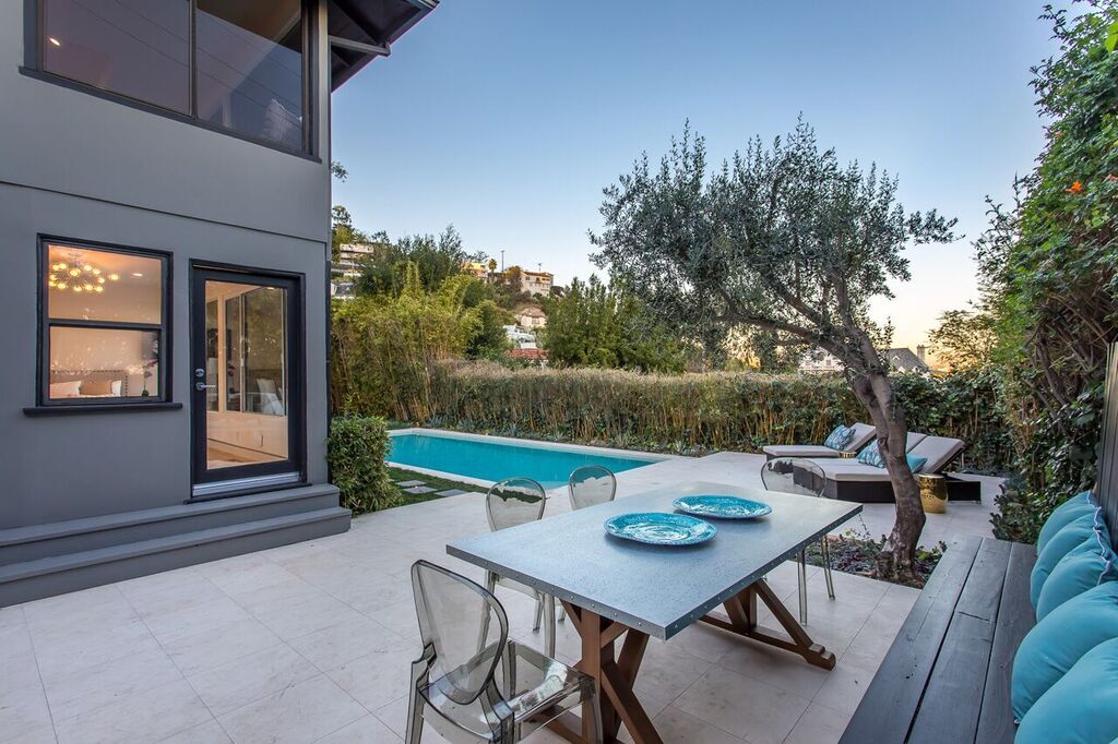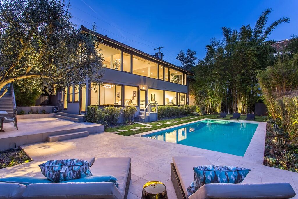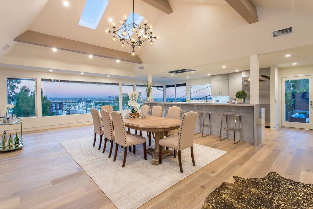 Perched on a cul-de-sac just above the Chateau Marmont, sits this completely renovated and gated estate with jetliner city views. A private entrance leads you to an expansive living room with soaring vaulted ceilings, sleek gourmet chef's kitchen with 15' center island, stainless professional-grade appliances, and ample natural light through the several skylights and wall-to-wall windows. The first level also features a modern office space with separate entrance. Three spacious downstairs bedrooms all have downtown views and direct access to a sprawling backyard with sparkling pool and BBQ area, including a master suite with an elegant spa-like bathroom subtly accented with Carrara marble. Ample parking with a 2-car garage, additional carport, and plenty of street parking. This thorough and tasteful renovation creates an ambiance of sophistication and warmth for the most discriminating buyer. See virtual tour.