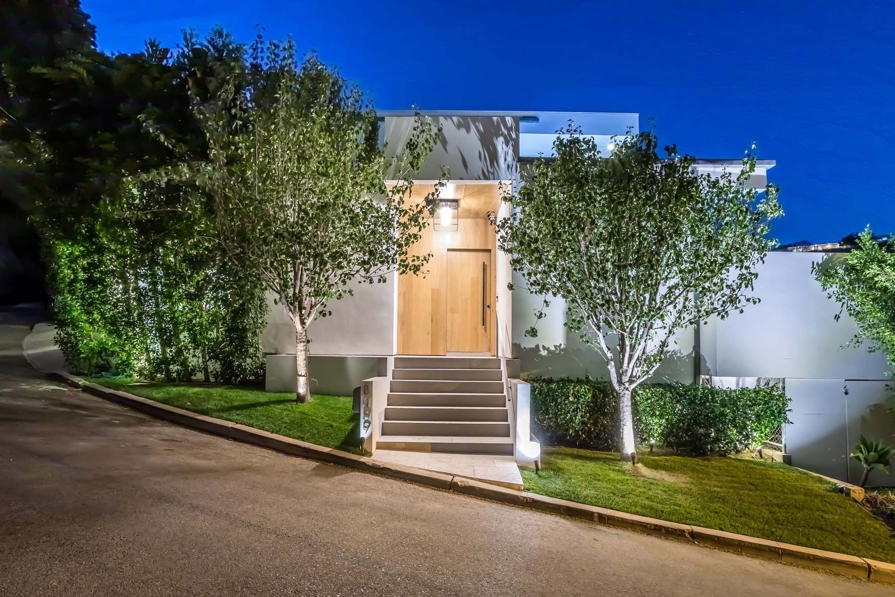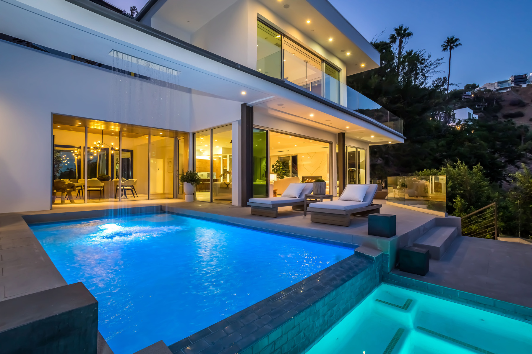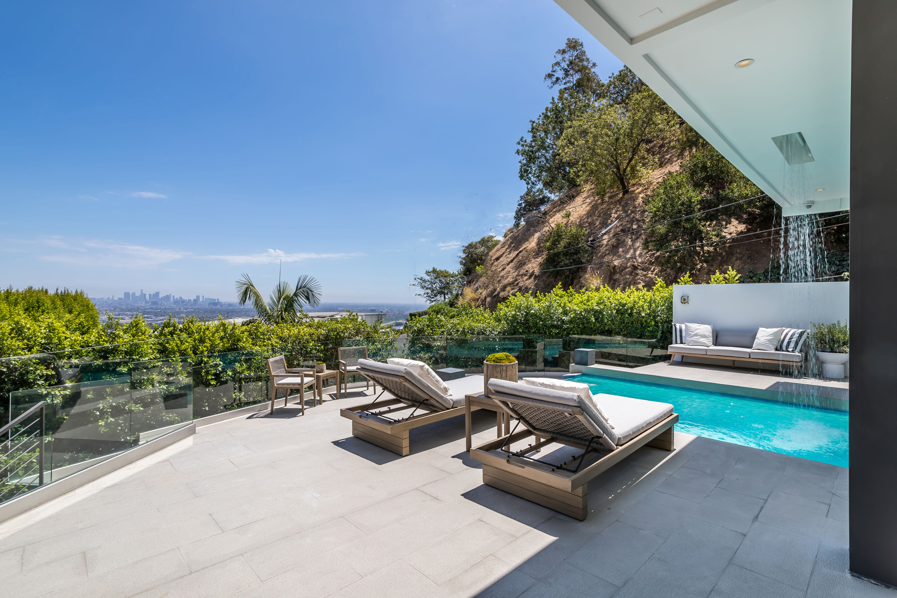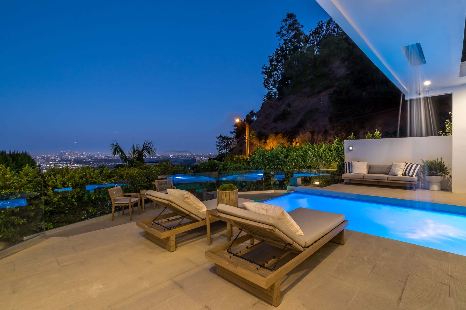 Perched at the end of a quiet cul-de-sac just above the Sunset Strip, this recently renovated contemporary estate features panoramic city skyline and canyon views. Secure and private, the home is replete with new European white oak floors and an open floor plan with floor-to-ceiling sliding glass doors that lead to the sparkling pool with built-in waterfall and spa. A separate grassy yard and built-in BBQ makes this the perfect setting for indoor-outdoor living and entertaining. The chef's kitchen has luxurious Viking appliances and an oversized island with built-in breakfast bar, and a stunning dining room wrapped in oak. Upstairs lies the massive primary suite featuring jetliner views of the entire city, a huge deck, fireplace, and an open ensuite bath with spa-like tub and walk-in closet. 2 additional bedrooms with ensuite baths completes the upstairs. The 5th bedroom has its own separate entry and can be used as gym. Additional sauna, wine cellar, and an attached 2-car garage complete this contemporary masterpiece.