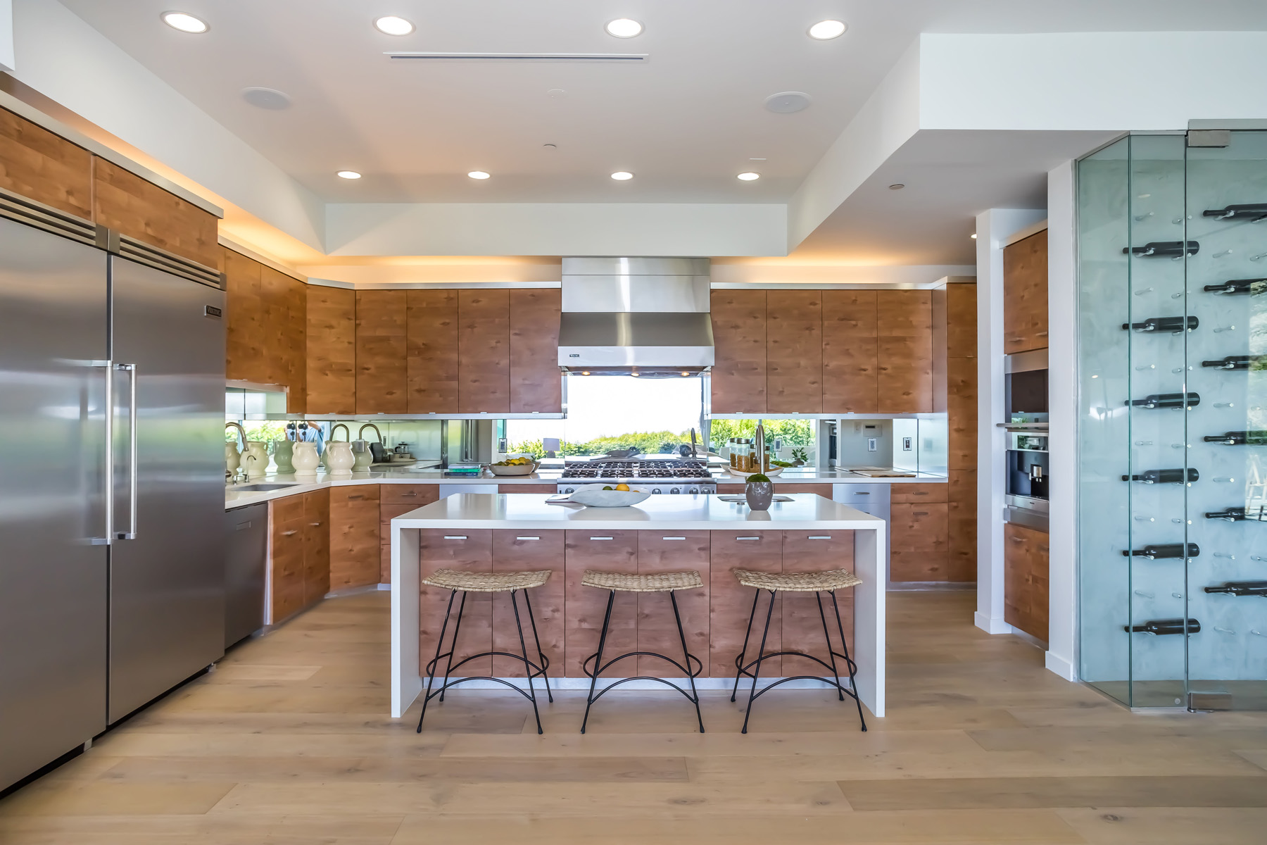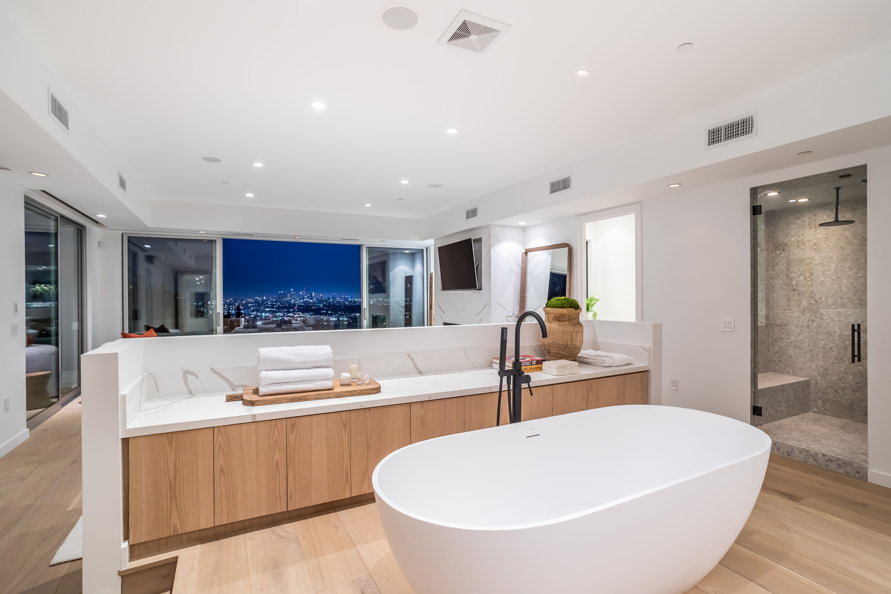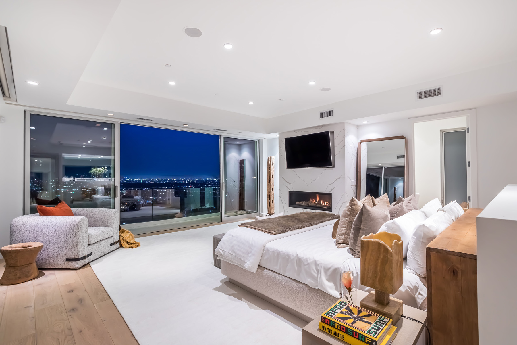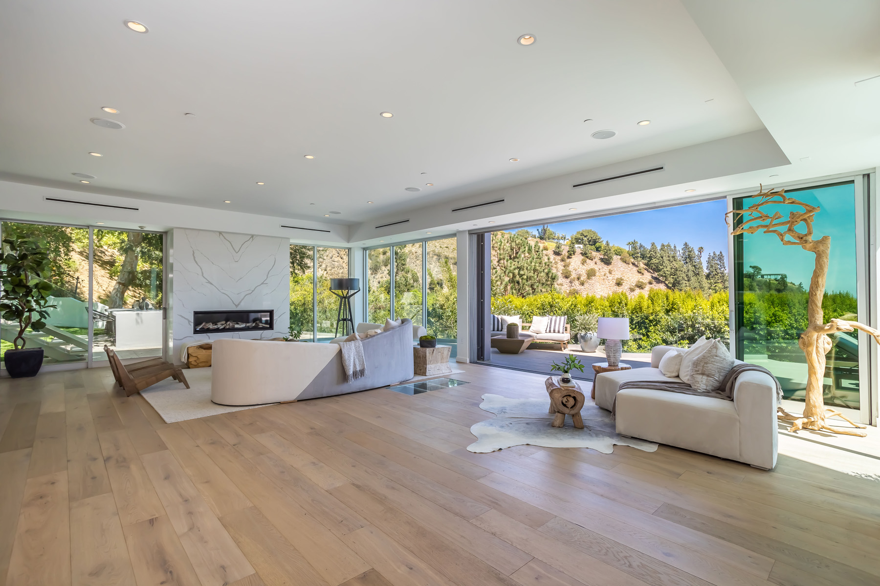 Perched at the end of a quiet cul-de-sac just above the Sunset Strip, this recently renovated contemporary estate features panoramic city skyline and canyon views. Secure and private, the home is replete with new European white oak floors and an open floor plan with floor-to-ceiling sliding glass doors that lead to the sparkling pool with built-in waterfall and spa. A separate grassy yard and built-in BBQ makes this the perfect setting for indoor-outdoor living and entertaining. The chef's kitchen has luxurious Viking appliances and an oversized island with built-in breakfast bar, and a stunning dining room wrapped in oak. Upstairs lies the massive primary suite featuring jetliner views of the entire city, a huge deck, fireplace, and an open ensuite bath with spa-like tub and walk-in closet. 2 additional bedrooms with ensuite baths completes the upstairs. The 5th bedroom has its own separate entry and can be used as gym. Additional sauna, wine cellar, and an attached 2-car garage complete this contemporary masterpiece.