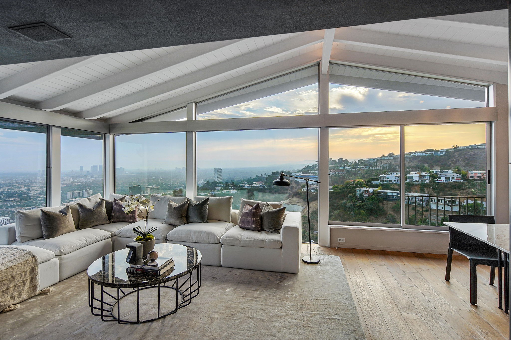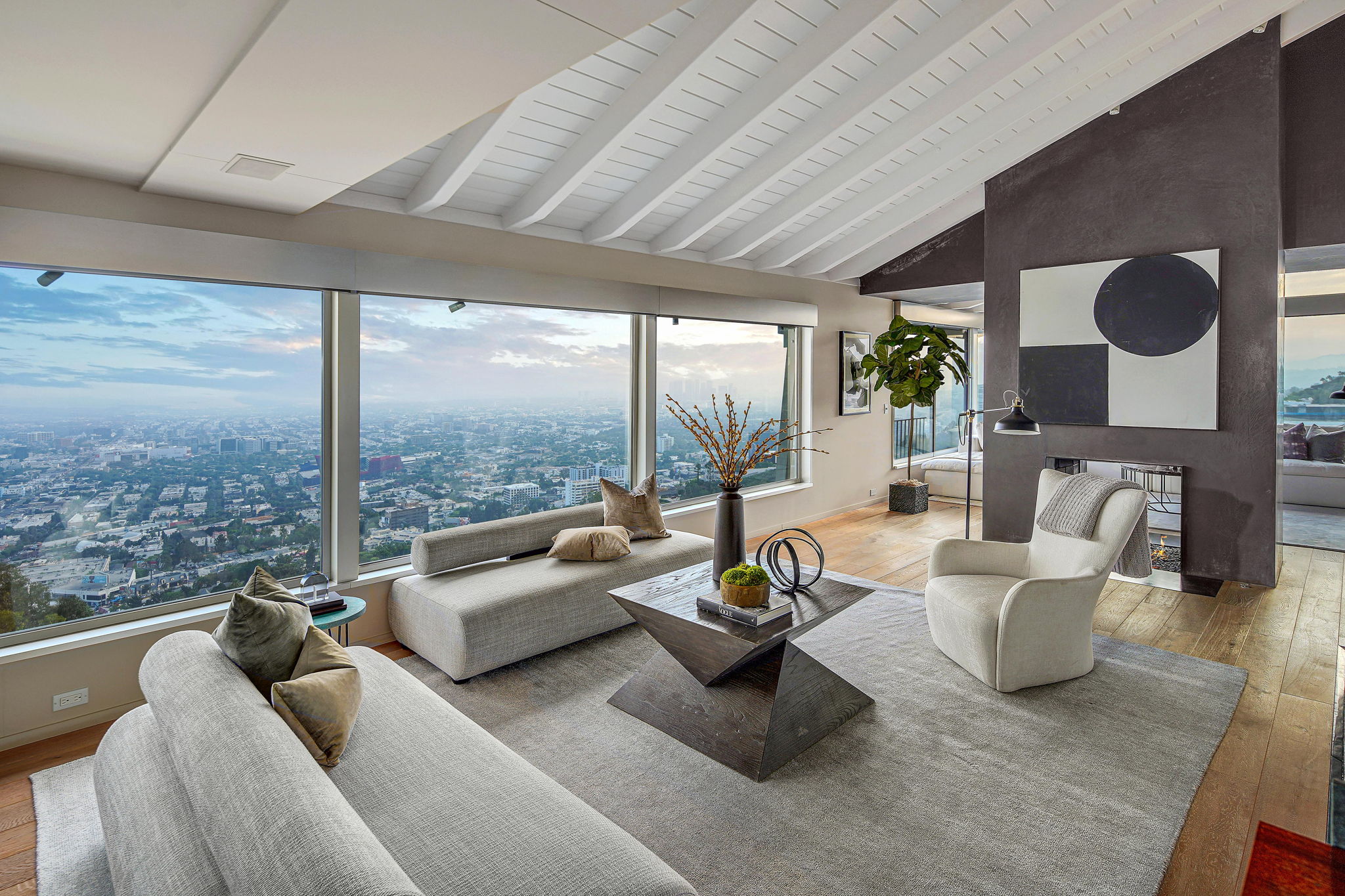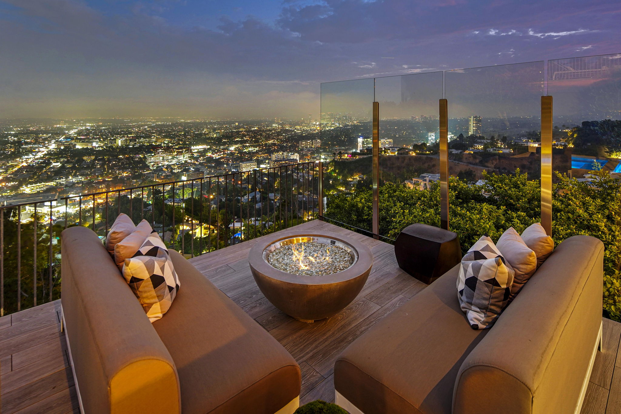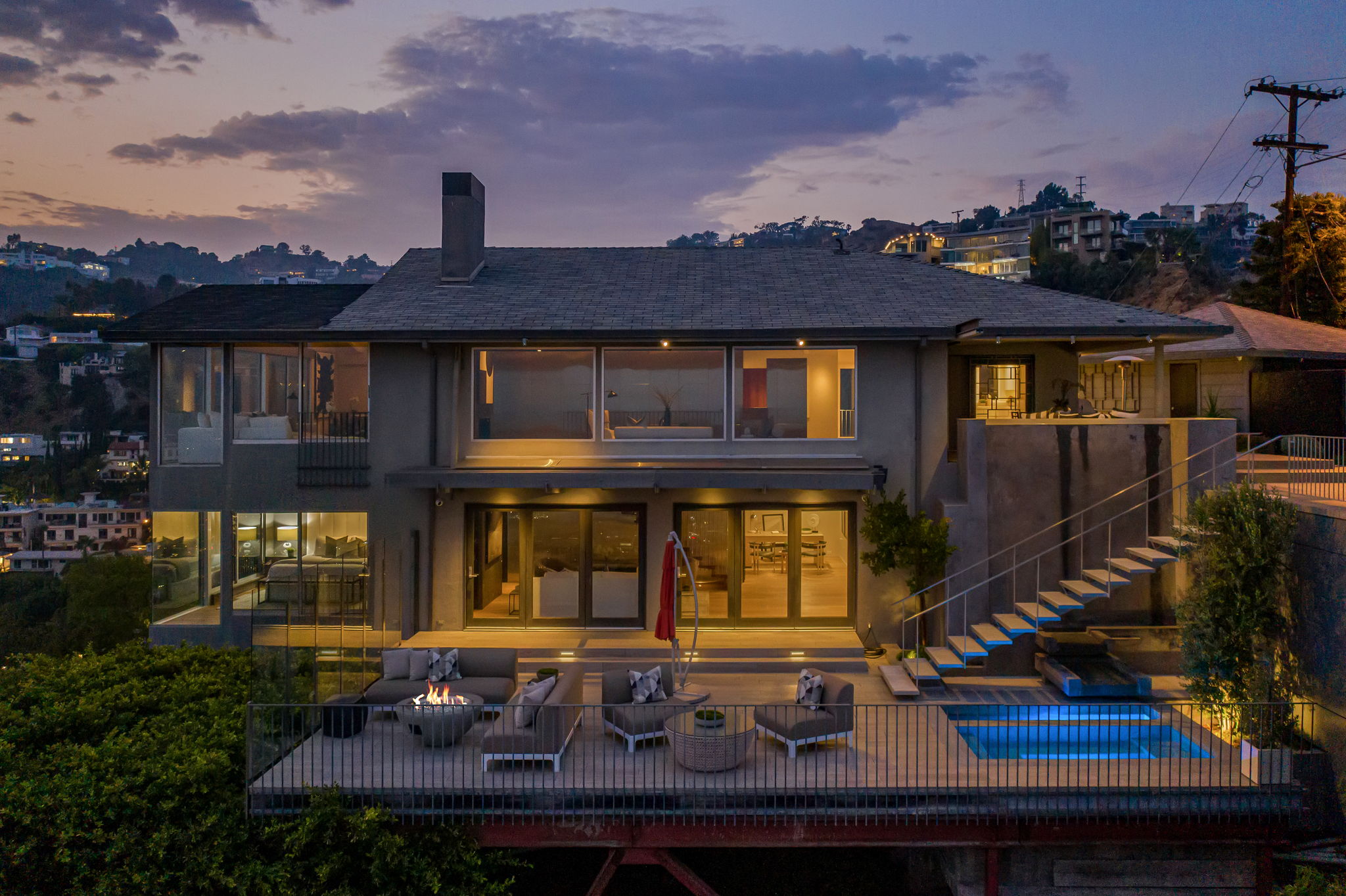 Situated on its own promontory just above the Sunset Strip, this serene and private home features unrivaled jetliner panoramic views of the entire city and Hollywood Hills. The pool and outdoor patio evoke feelings of a five-star resort, with an additional waterfall, spa, and fire pit providing seamless indoor/outdoor flow. Enter through the unique front door to the open floor plan with a gorgeous living room, vaulted wood-beamed ceilings, see-through fireplace, and a dining area with incredible views from every room. The sleek kitchen is complete with modern, stainless steel appliances. An additional bedroom, bathroom, and laundry room complete the main floor. A custom steel wall and floating staircase lead below to a large seating area and owner’s suite overlooking the entire city, replete with a luxurious spa-like bathroom including a walk-in shower with benches for sitting, all opening to a massive deck. The third bedroom with an ensuite bath has floor-to-ceiling sliding doors perfect for an office or extra guest room. Detached 2-car garage and 2 uncovered parking spaces.