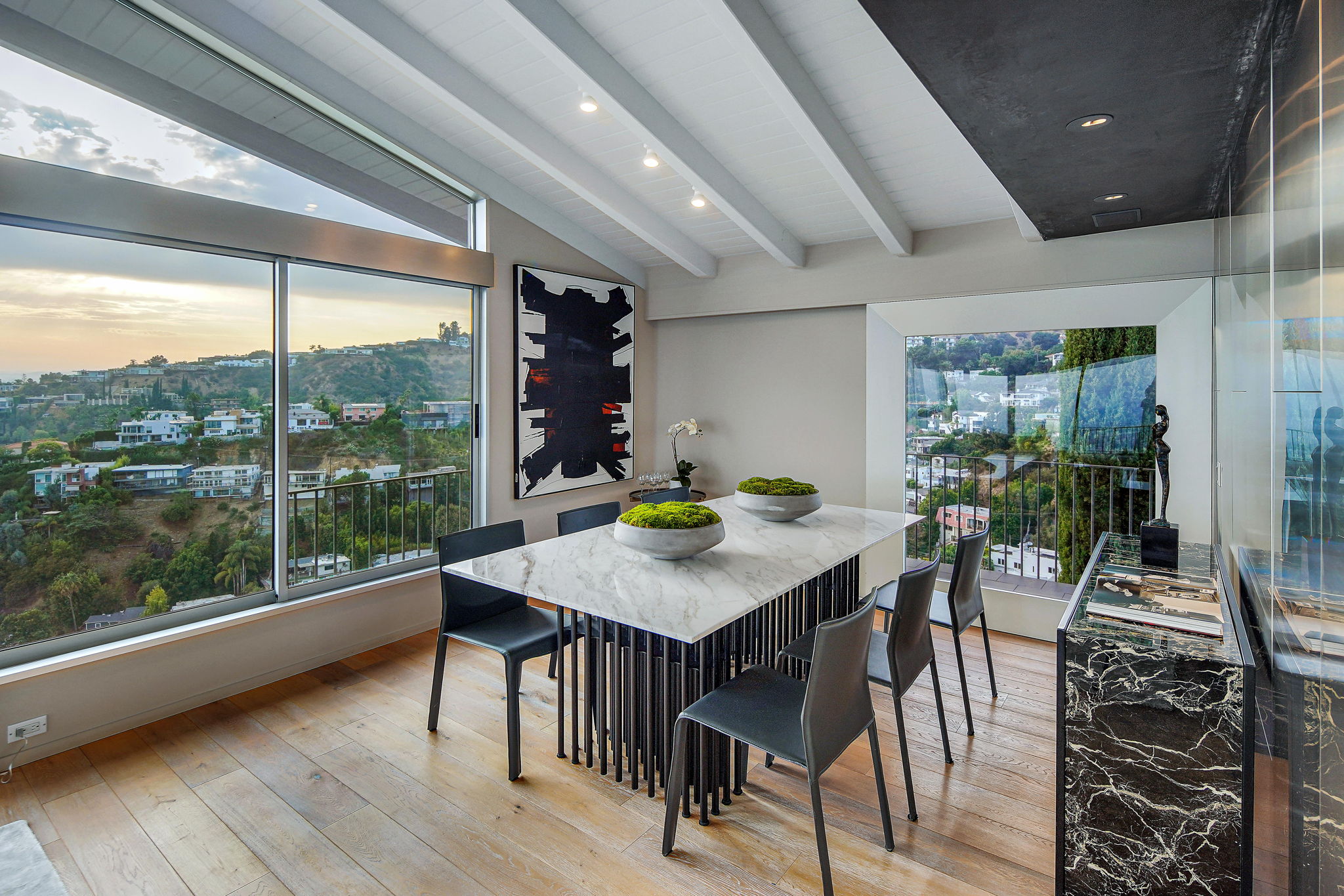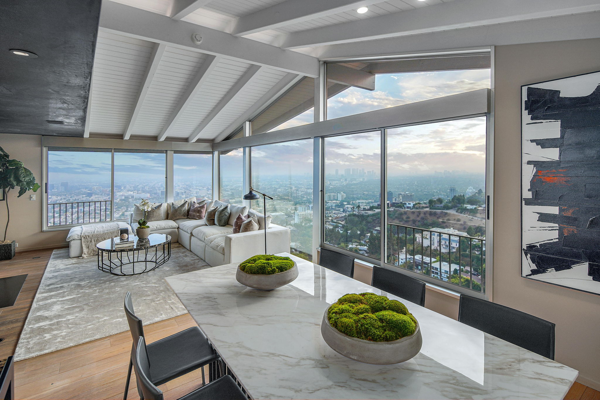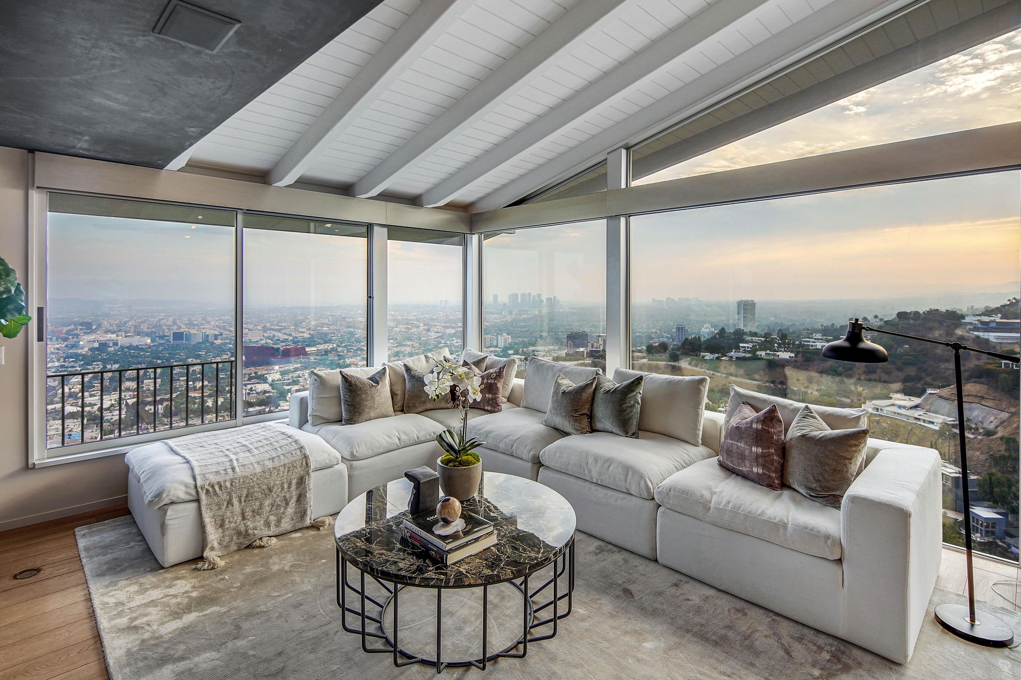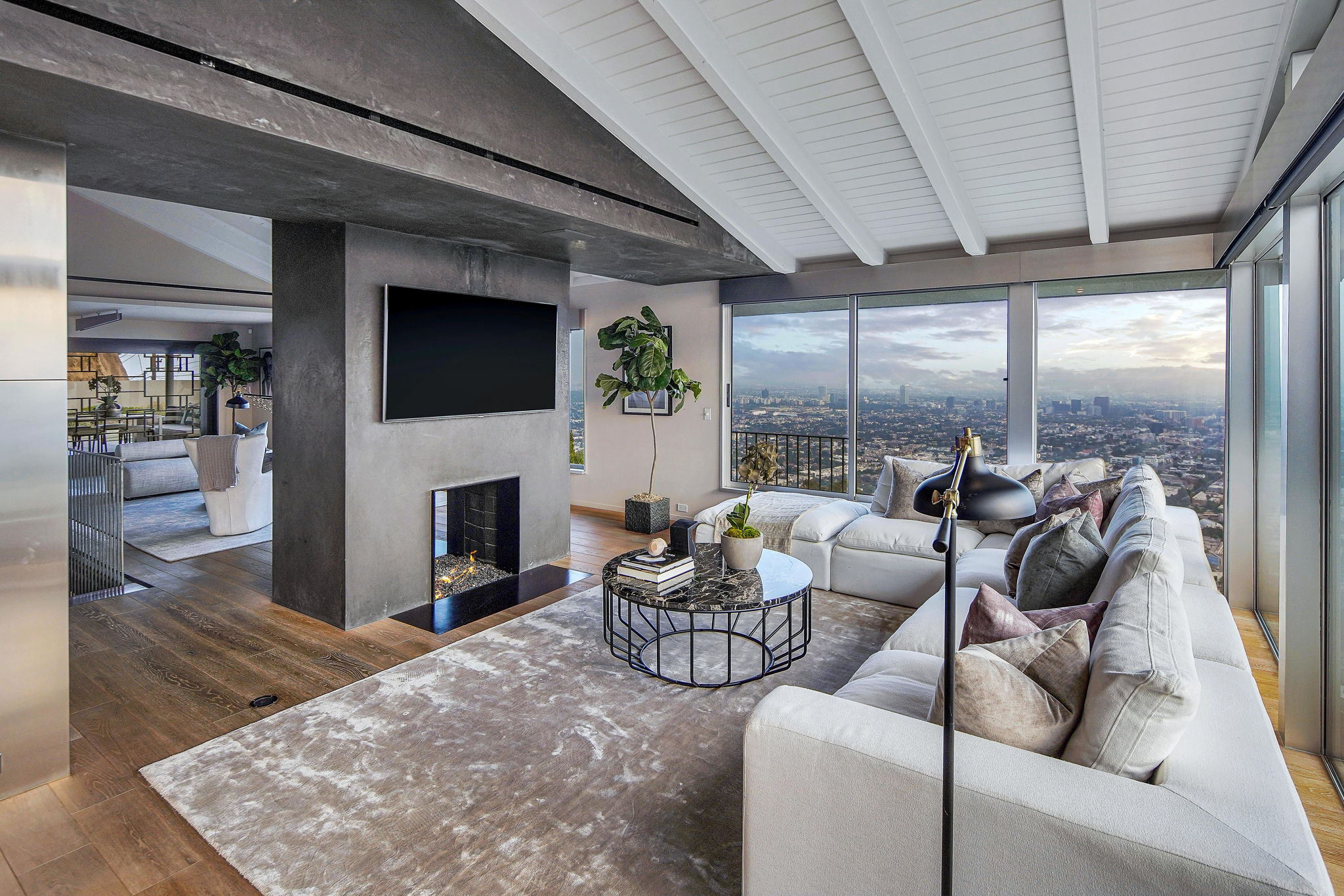 Situated on its own promontory just above the Sunset Strip, this serene and private home features unrivaled jetliner panoramic views of the entire city and Hollywood Hills. The pool and outdoor patio evoke feelings of a five-star resort, with an additional waterfall, spa, and fire pit providing seamless indoor/outdoor flow. Enter through the unique front door to the open floor plan with a gorgeous living room, vaulted wood-beamed ceilings, see-through fireplace, and a dining area with incredible views from every room. The sleek kitchen is complete with modern, stainless steel appliances. An additional bedroom, bathroom, and laundry room complete the main floor. A custom steel wall and floating staircase lead below to a large seating area and owner’s suite overlooking the entire city, replete with a luxurious spa-like bathroom including a walk-in shower with benches for sitting, all opening to a massive deck. The third bedroom with an ensuite bath has floor-to-ceiling sliding doors perfect for an office or extra guest room. Detached 2-car garage and 2 uncovered parking spaces.