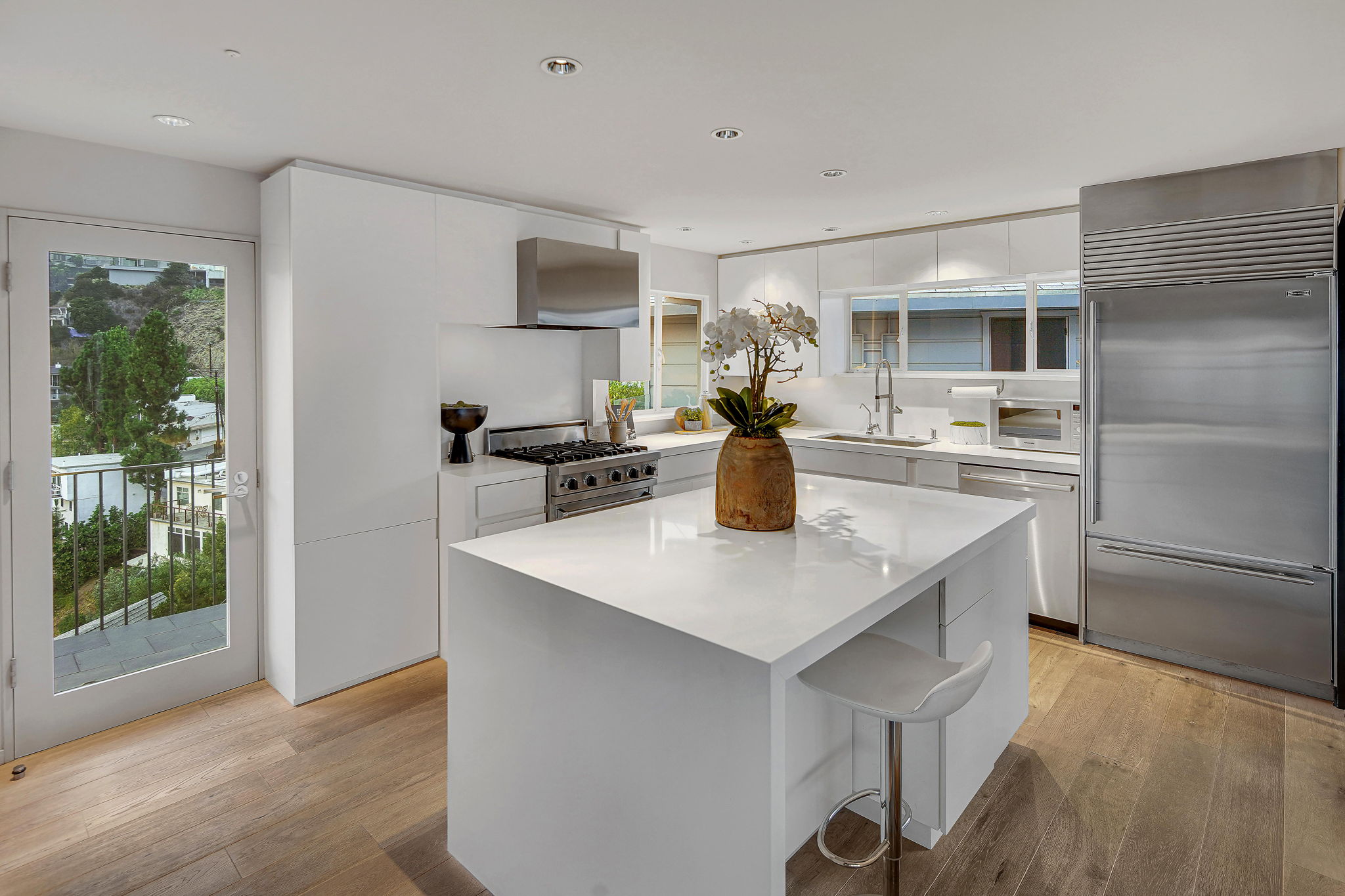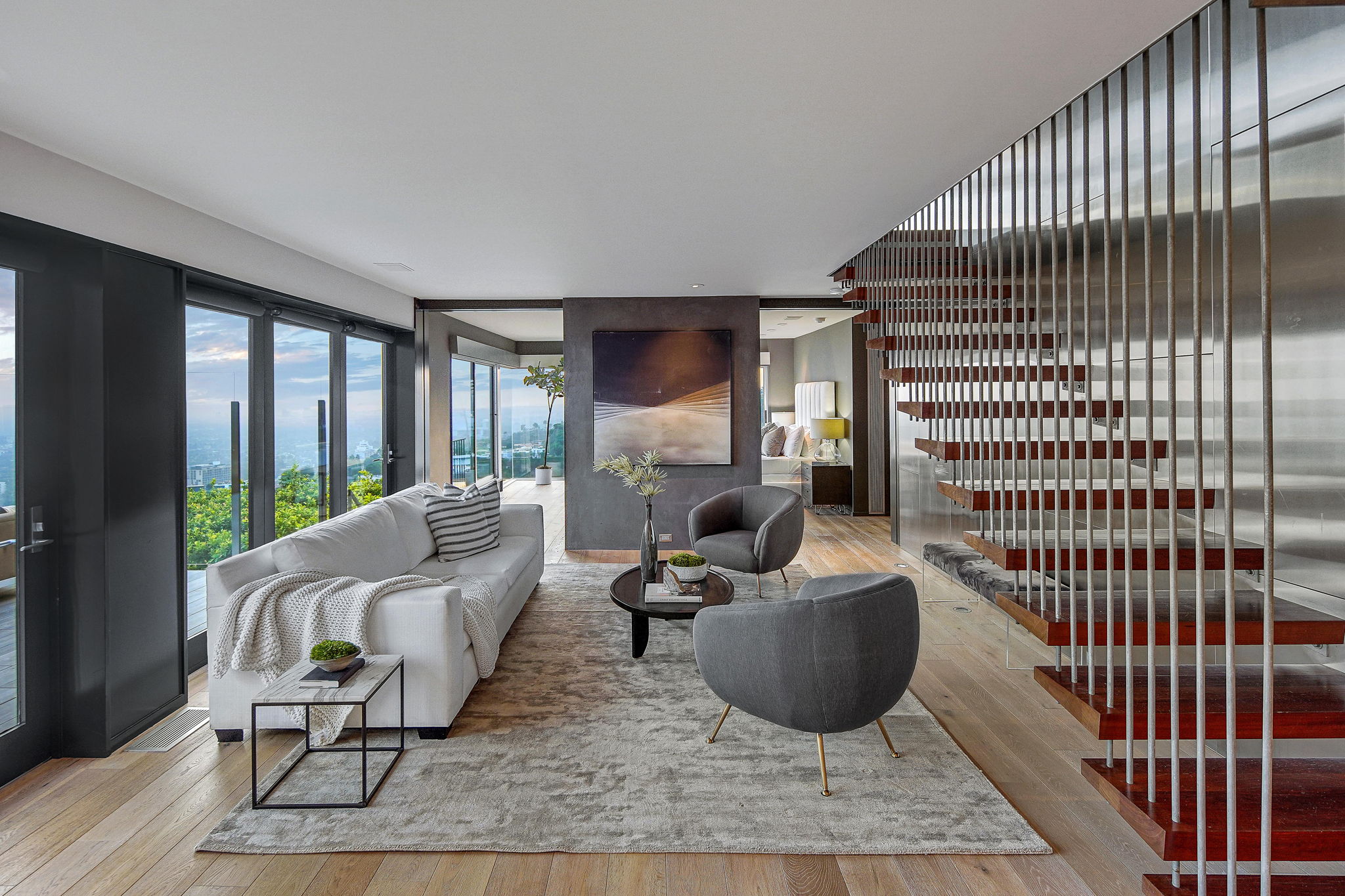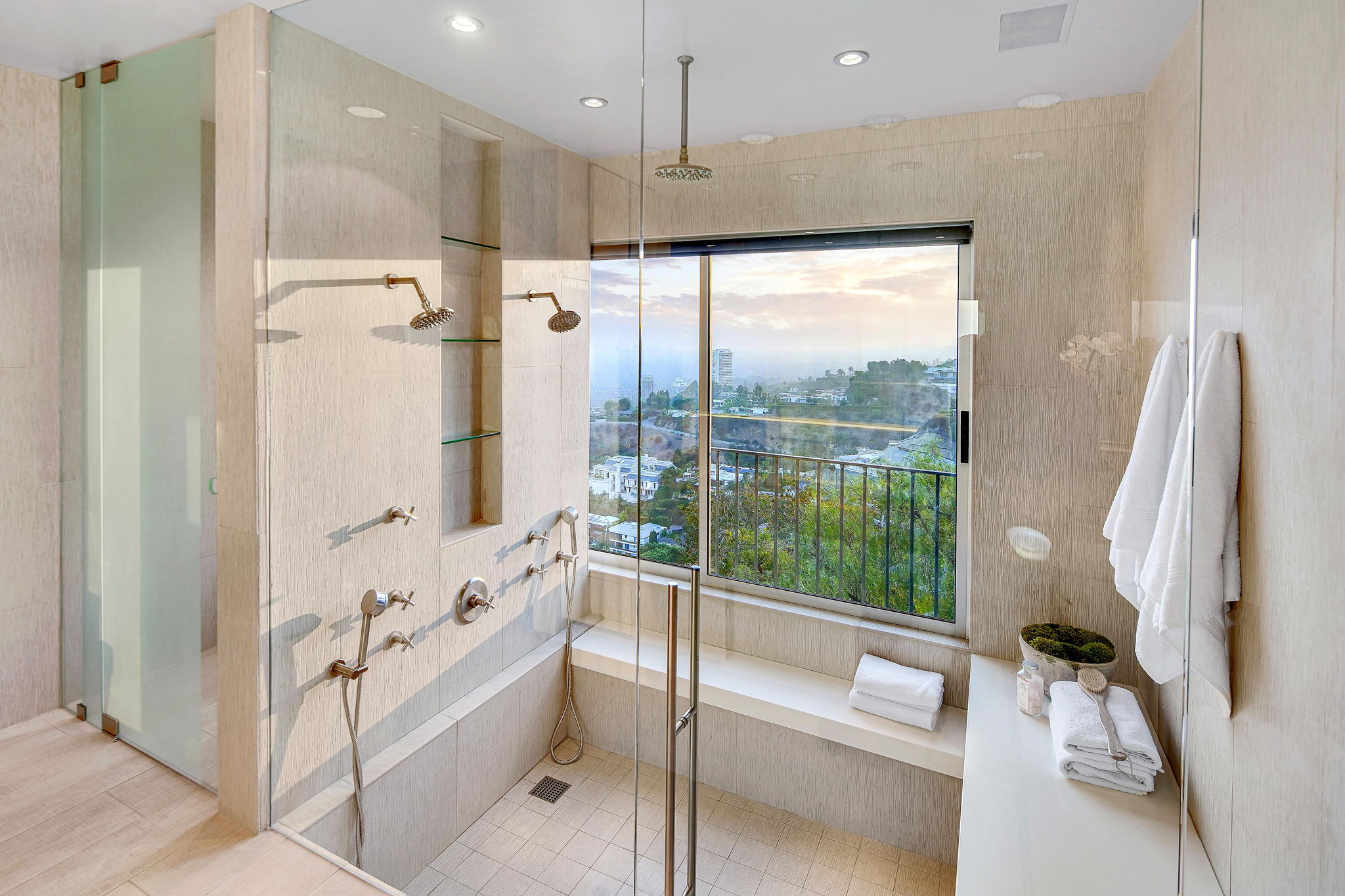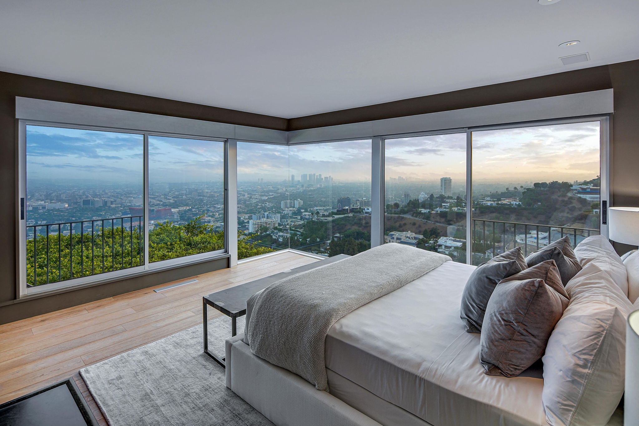 Situated on its own promontory just above the Sunset Strip, this serene and private home features unrivaled jetliner panoramic views of the entire city and Hollywood Hills. The pool and outdoor patio evoke feelings of a five-star resort, with an additional waterfall, spa, and fire pit providing seamless indoor/outdoor flow. Enter through the unique front door to the open floor plan with a gorgeous living room, vaulted wood-beamed ceilings, see-through fireplace, and a dining area with incredible views from every room. The sleek kitchen is complete with modern, stainless steel appliances. An additional bedroom, bathroom, and laundry room complete the main floor. A custom steel wall and floating staircase lead below to a large seating area and owner’s suite overlooking the entire city, replete with a luxurious spa-like bathroom including a walk-in shower with benches for sitting, all opening to a massive deck. The third bedroom with an ensuite bath has floor-to-ceiling sliding doors perfect for an office or extra guest room. Detached 2-car garage and 2 uncovered parking spaces.