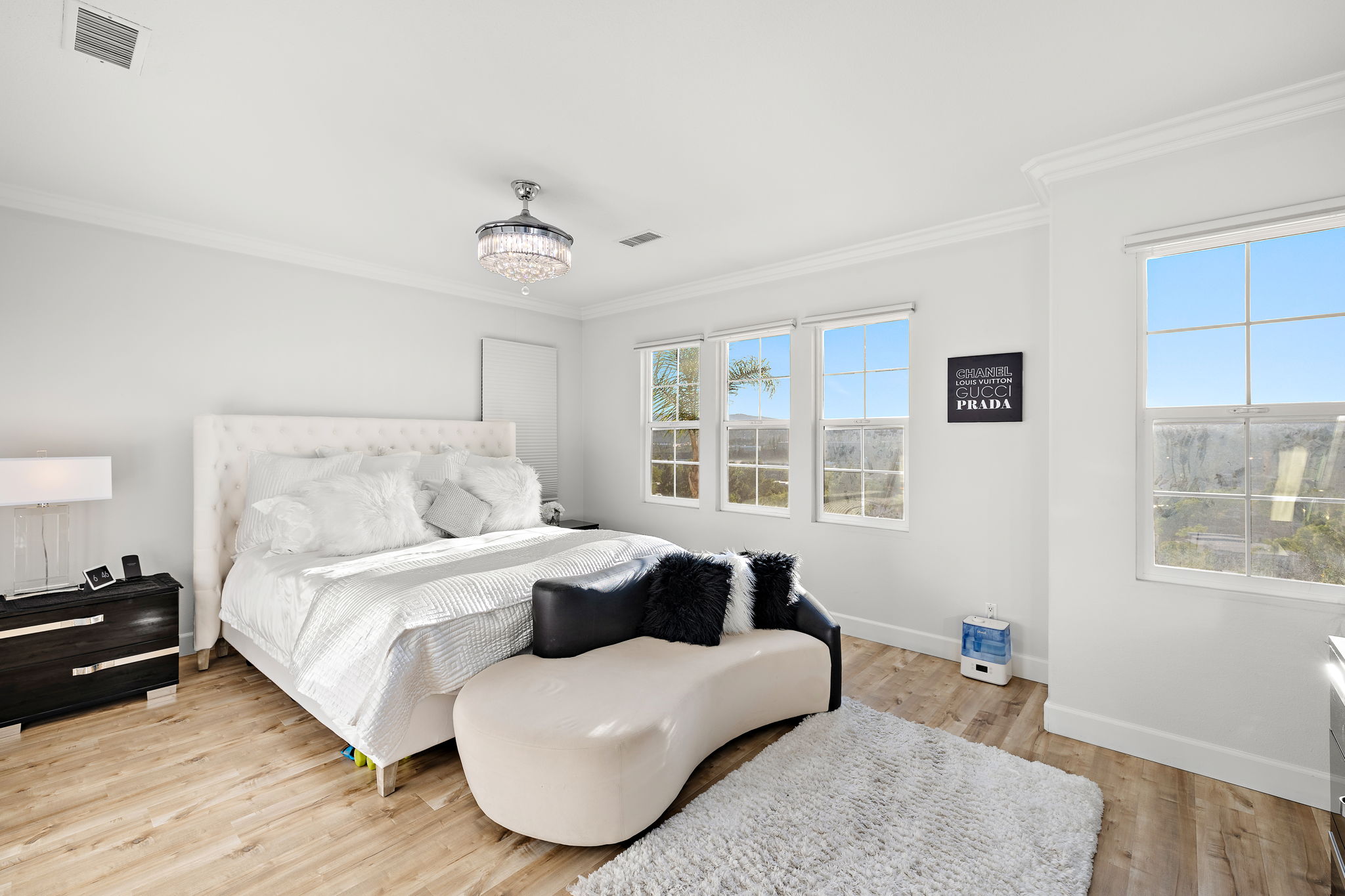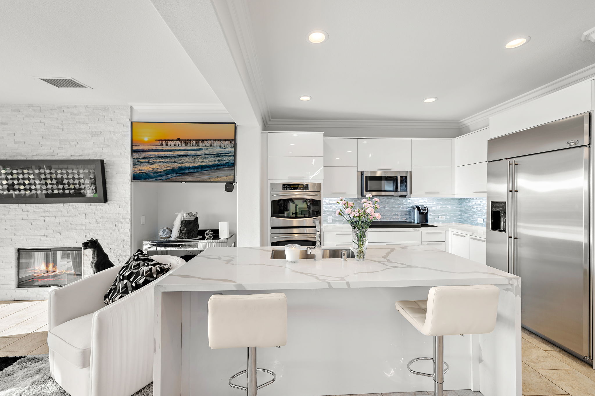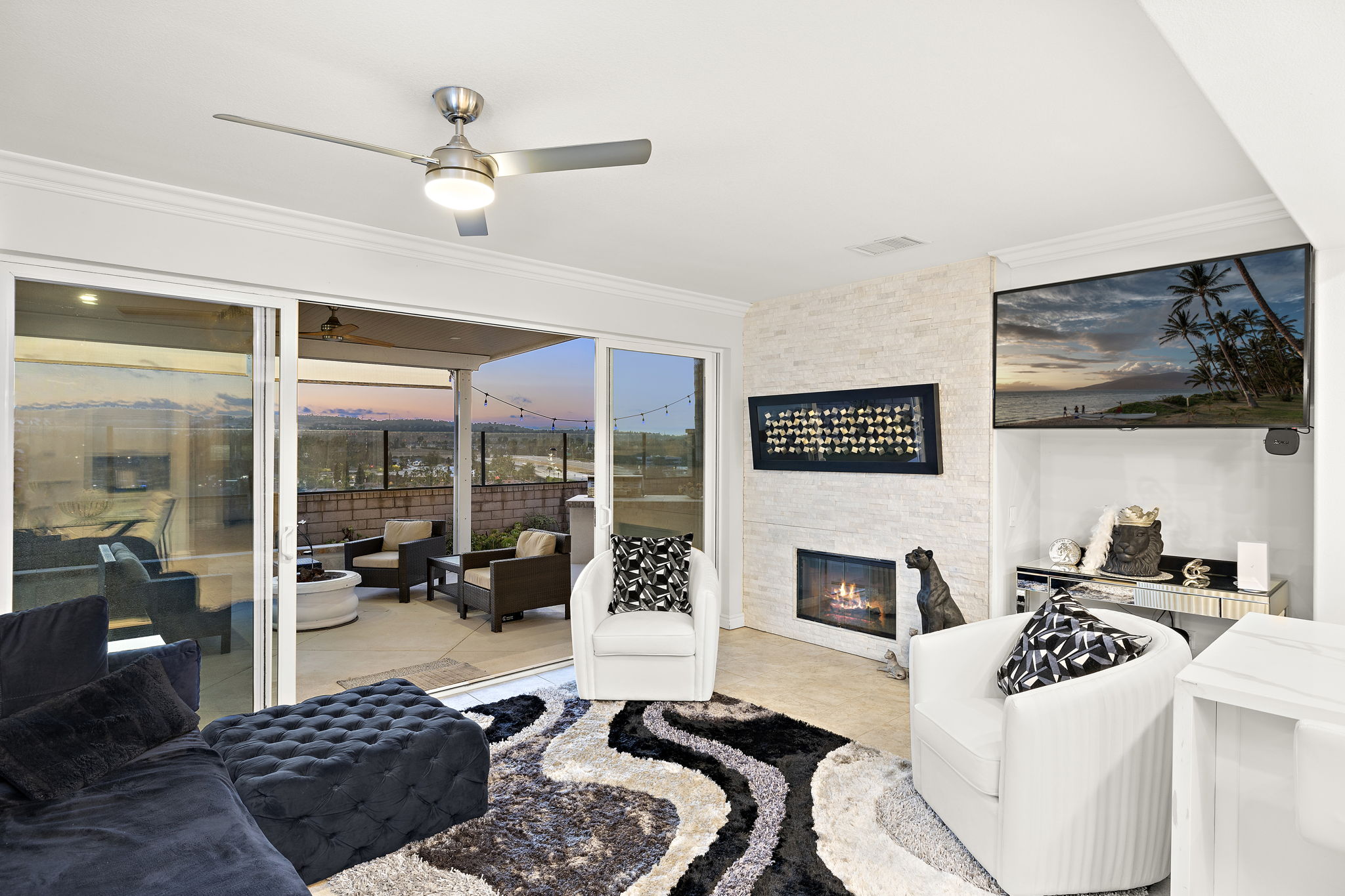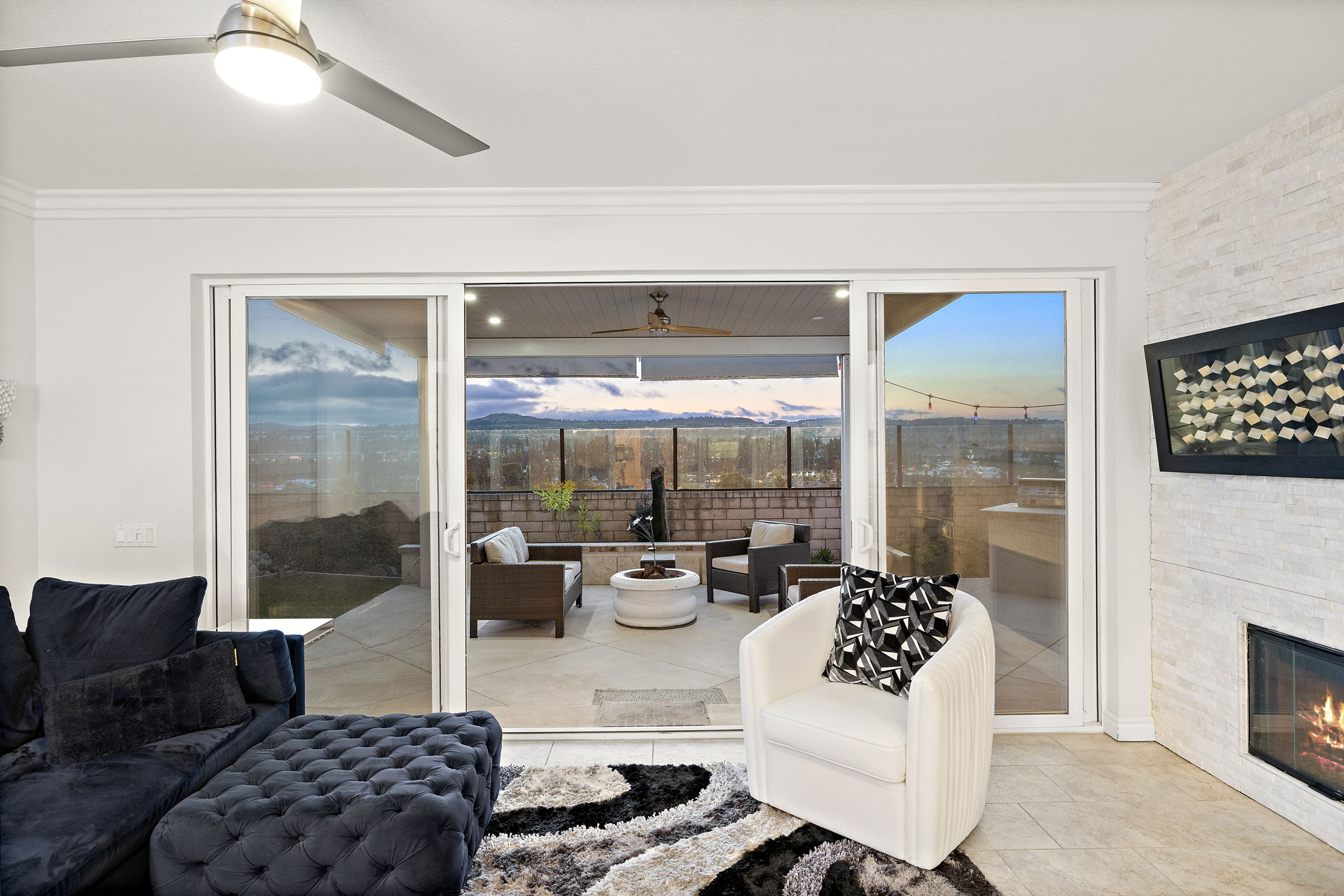City lights, coastal breezes, and elevated living await in this beautifully updated 3-bedroom, 2.5-bath detached condo with no common walls, located in the desirable Cornerstone community of Laguna Niguel. With a spacious bonus loft, wraparound yard, and stunning hilltop views, this home blends style, comfort, and functionality. Step inside to find a light-filled layout with tile flooring, plantation shutters, recessed lighting, and a wrought iron staircase. The heart of the home is the open-concept kitchen featuring quartz countertops, a custom backsplash, stainless steel appliances, and white cabinetry, all flowing seamlessly into the living and dining areas. The family room with upgraded fireplace opens to a private backyard retreat—professionally landscaped with tropical accents, a built-in gas BBQ, and panoramic views of hills and city lights. Upstairs, the primary suite offers a walk-in closet, motorized blinds, and a spa-like bath with separate tub and shower. A spacious loft provides a flexible bonus space, and two additional bedrooms include ceiling fans and share a stylish hall bath. A dedicated upstairs laundry room and downstairs powder room add convenience. Thoughtful upgrades throughout the home include smart features, a Nest thermostat, Ring camera, fan chandelier, smart garage door opener, and wiring for EV charging. The HVAC system was replaced within the last year, and the leased solar system helps boost energy efficiency at approx $115/month. Cornerstone offers residents a peaceful hilltop setting with access to a private community pool and spa, all just minutes from schools, shops, parks, and coastal access. This is a rare opportunity to own a turnkey home with designer touches and unforgettable views in one of Laguna Niguel’s most sought-after neighborhoods.