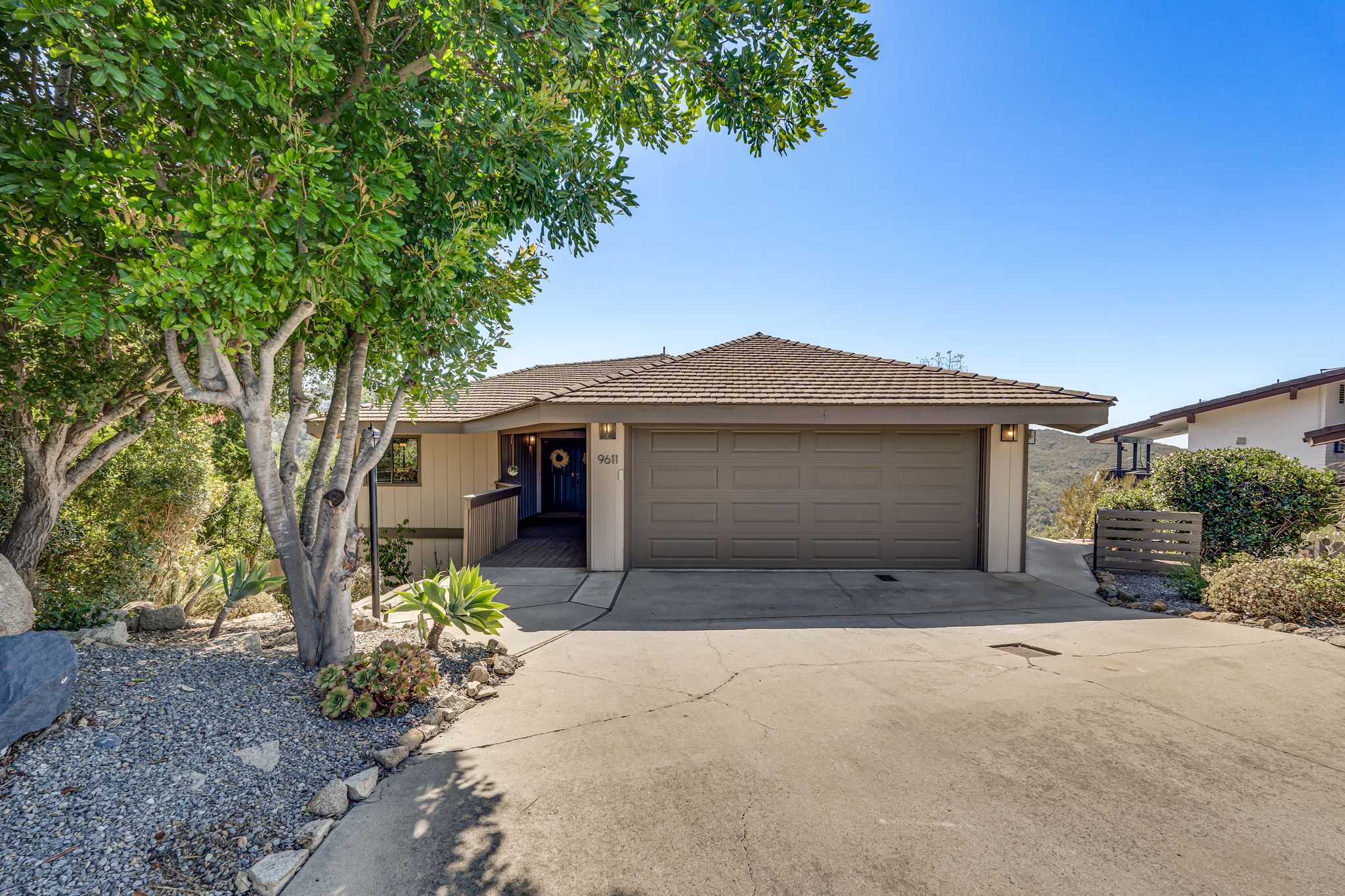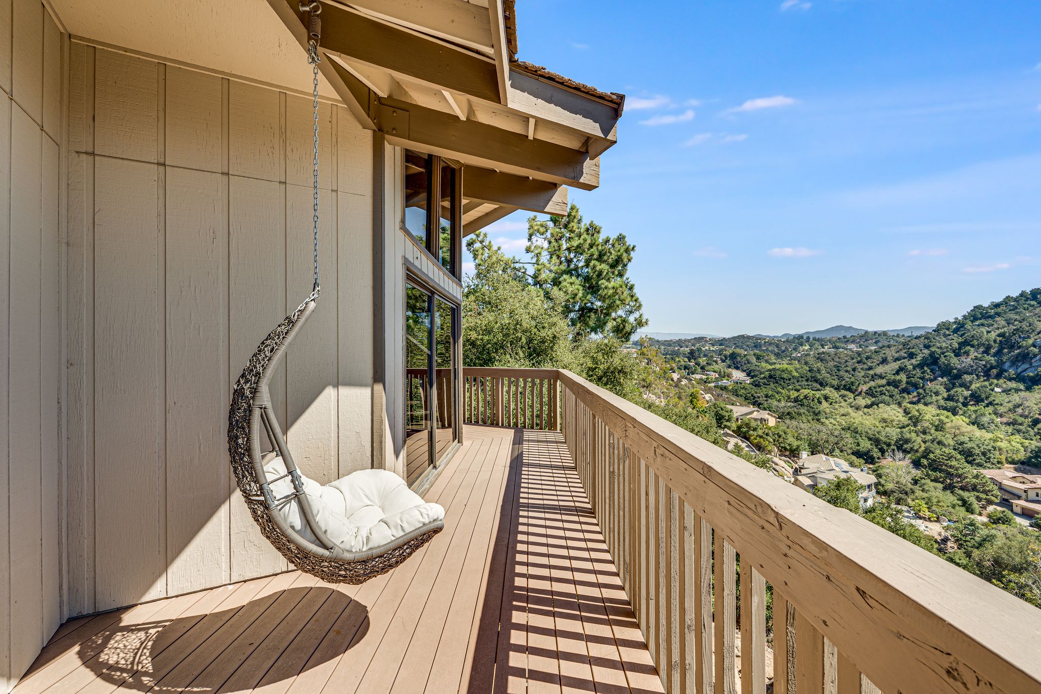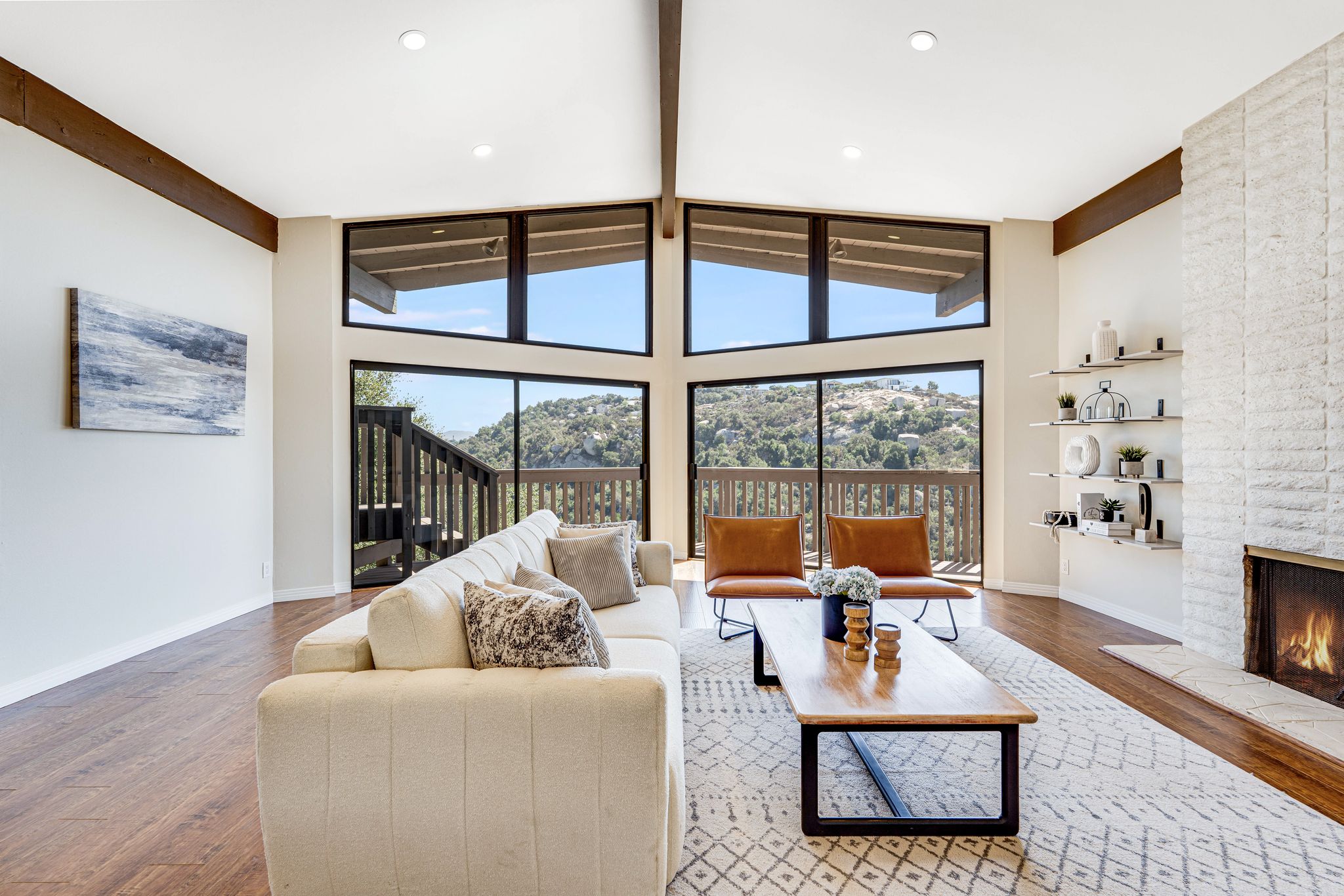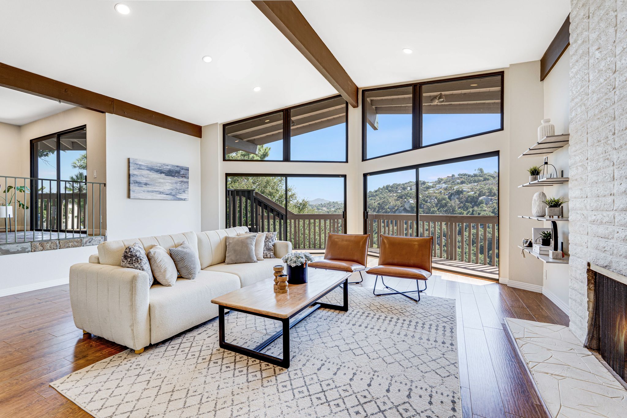 Discover this iconic mid-century modern home, featuring striking A-frame windows, nestled in the serene hills of Hidden Meadows with breathtaking views over Escondido, California, and a peek of the Pacific Ocean in the distance. Set on a quiet cul-de-sac, the welcoming entry through double doors leads you into the impressive foyer of this expansive 3,151-square-foot residence with the potential to expand a large unfinished basement. Inside, you'll be captivated by the unique pitched roofline and floor-to-ceiling glass that frames stunning vistas of the rugged Escondido landscape. The thoughtful floor plan offers effortless living, highlighted by a spacious primary suite on the main floor, complete with an ultra-modern bathroom and a large walk-in closet. Enjoy the comfort of a newer HVAC system with a smart Nest thermostat. The updated kitchen boasts Carrera-style quartz countertops, elegant cabinetry, stainless steel appliances, and natural slate flooring. The elevated dining room seamlessly transitions to a wrap-around balcony that spans the entire back of the home, providing the perfect setting to savor magnificent sunsets and panoramic mountain views. Descend the wide staircase to discover generously sized bedrooms. Additional features include an oversized two-car garage with extra space for a golf cart or workshop/studio. The easy-care landscaping showcases drought-tolerant plants and an orange tree. A low HOA fee grants access to the Hidden Meadows pool, two lighted tennis courts, and an air-conditioned clubhouse. Conveniently located just minutes from I-15, Boulder Oaks Golf Club, and local dining.
