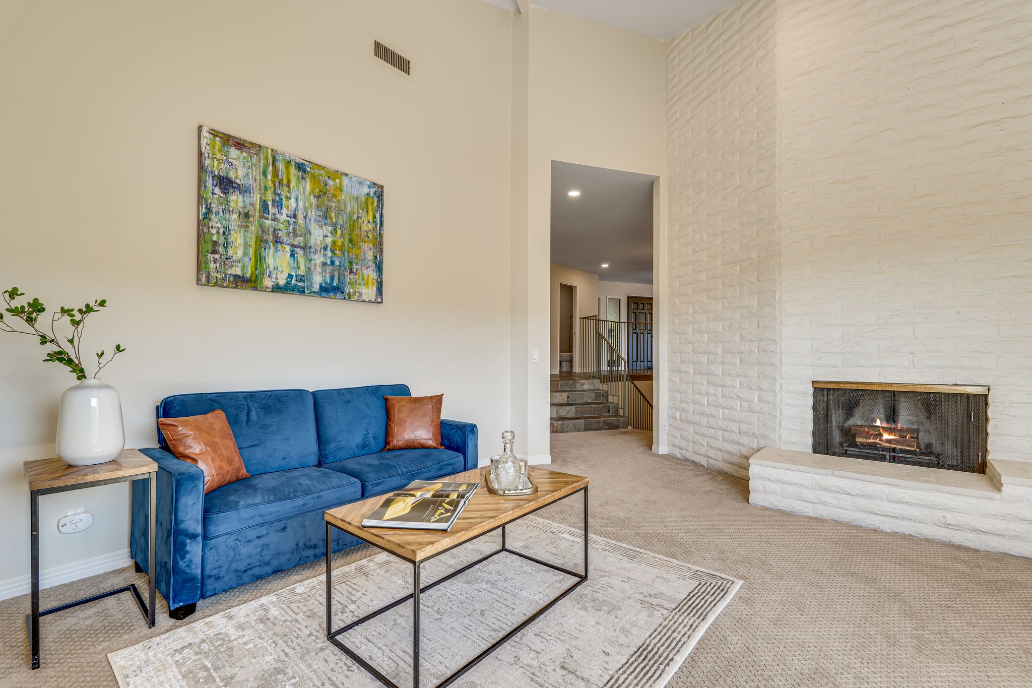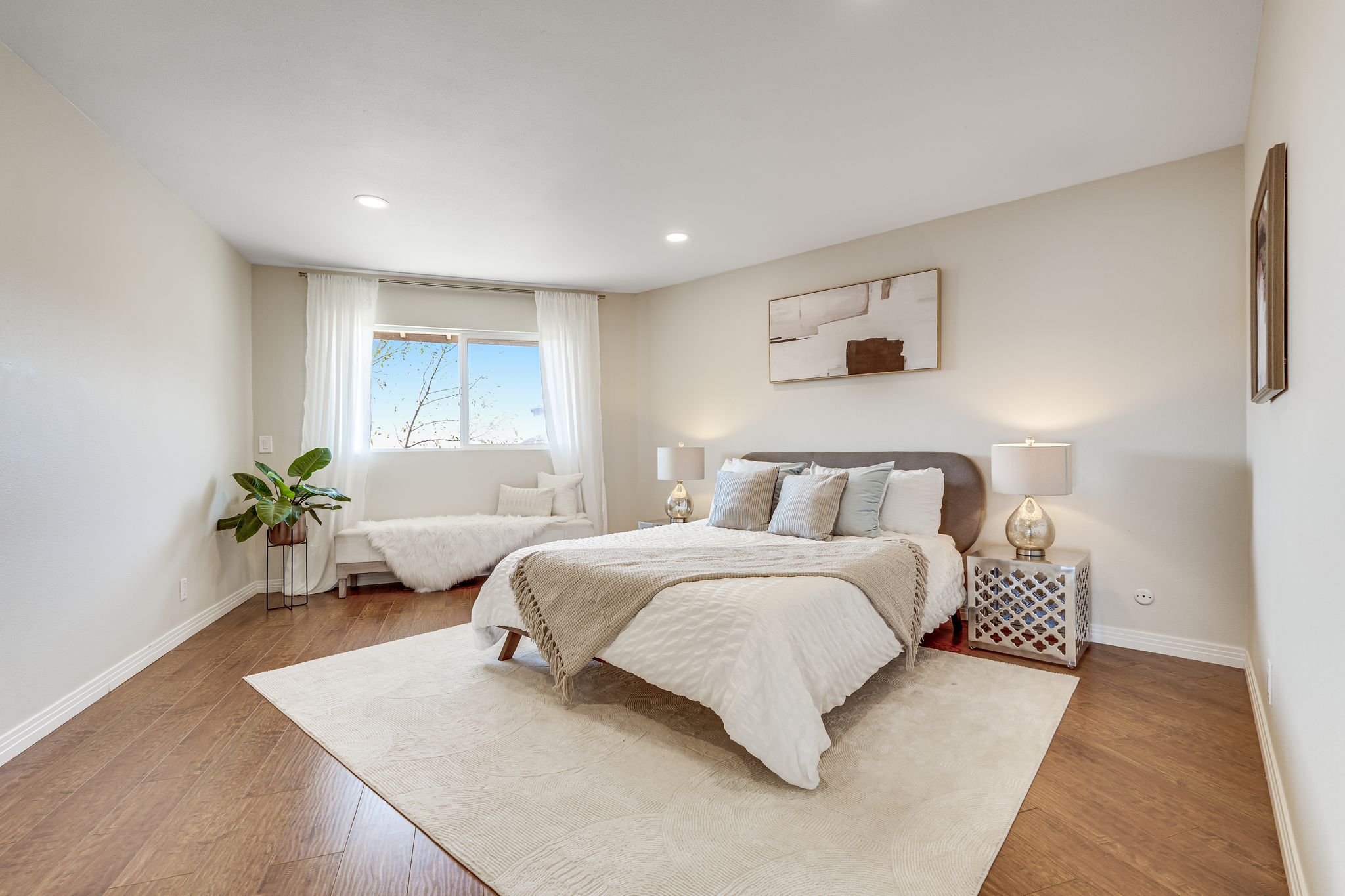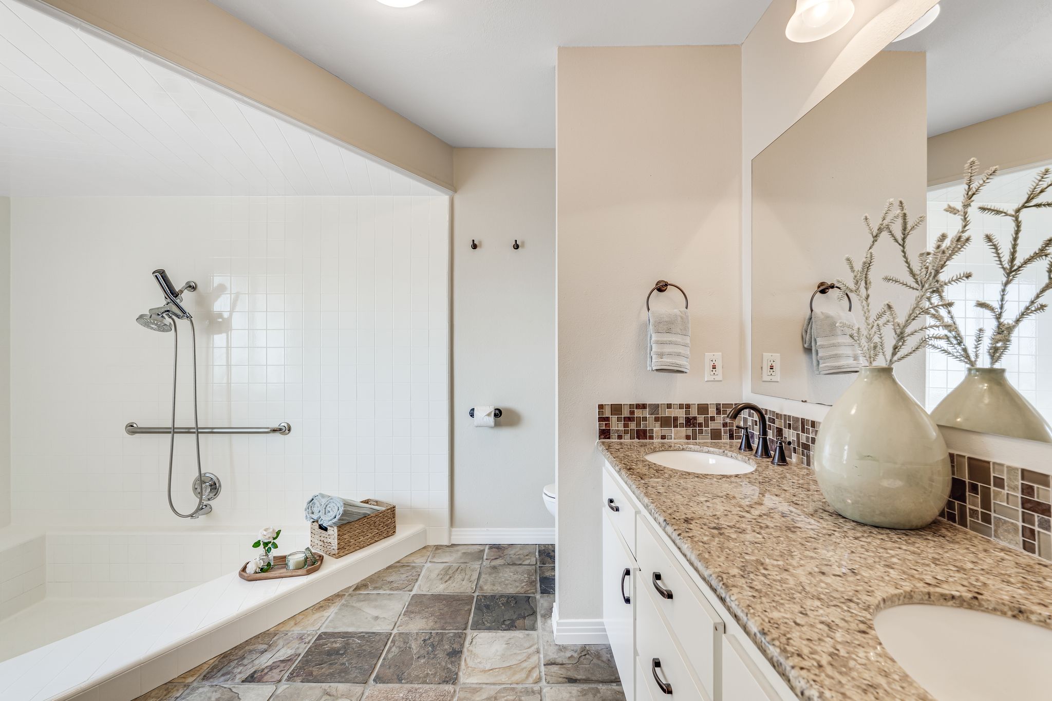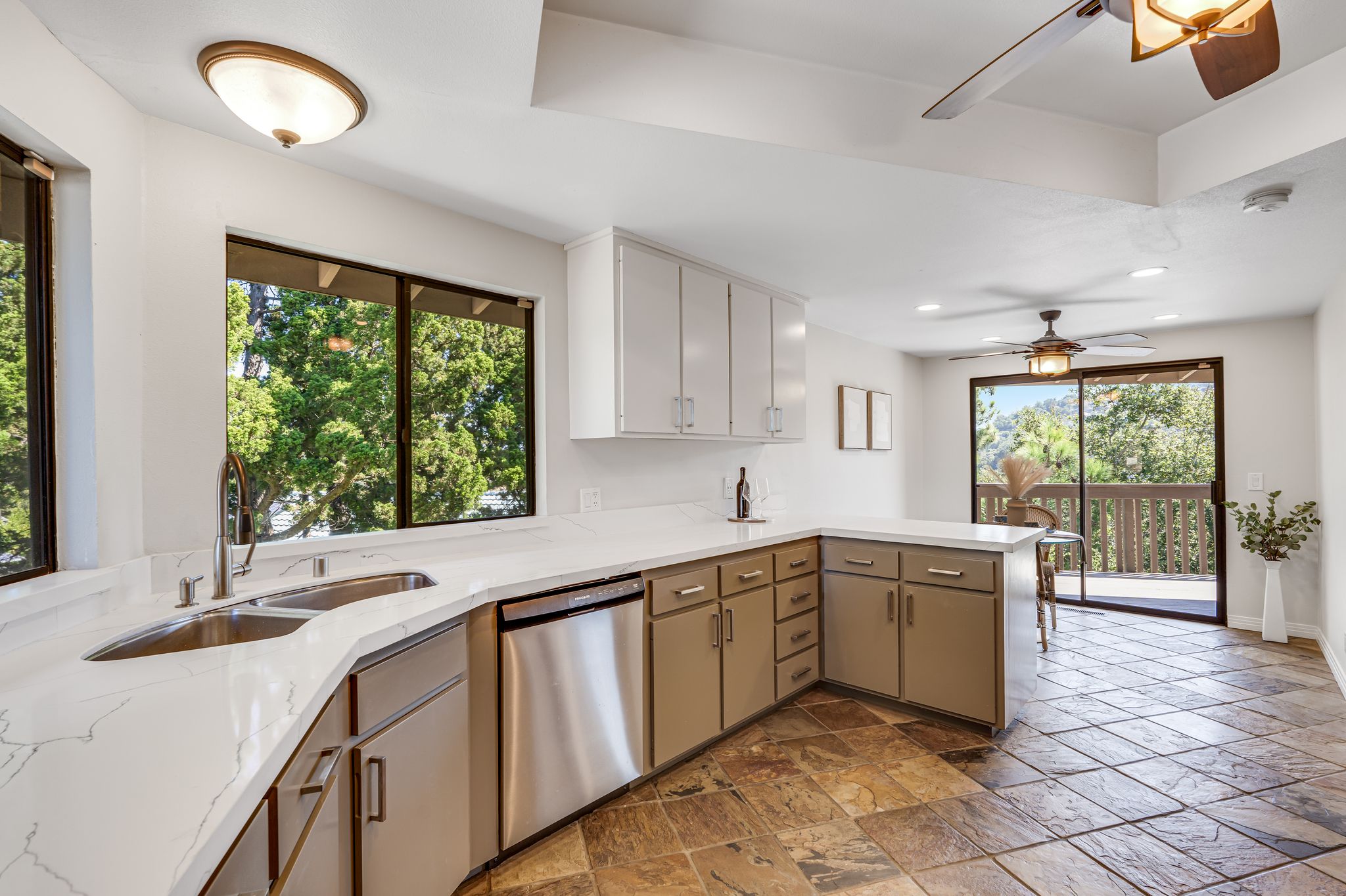 Discover this iconic mid-century modern home, featuring striking A-frame windows, nestled in the serene hills of Hidden Meadows with breathtaking views over Escondido, California, and a peek of the Pacific Ocean in the distance. Set on a quiet cul-de-sac, the welcoming entry through double doors leads you into the impressive foyer of this expansive 3,151-square-foot residence with the potential to expand a large unfinished basement. Inside, you'll be captivated by the unique pitched roofline and floor-to-ceiling glass that frames stunning vistas of the rugged Escondido landscape. The thoughtful floor plan offers effortless living, highlighted by a spacious primary suite on the main floor, complete with an ultra-modern bathroom and a large walk-in closet. Enjoy the comfort of a newer HVAC system with a smart Nest thermostat. The updated kitchen boasts Carrera-style quartz countertops, elegant cabinetry, stainless steel appliances, and natural slate flooring. The elevated dining room seamlessly transitions to a wrap-around balcony that spans the entire back of the home, providing the perfect setting to savor magnificent sunsets and panoramic mountain views. Descend the wide staircase to discover generously sized bedrooms. Additional features include an oversized two-car garage with extra space for a golf cart or workshop/studio. The easy-care landscaping showcases drought-tolerant plants and an orange tree. A low HOA fee grants access to the Hidden Meadows pool, two lighted tennis courts, and an air-conditioned clubhouse. Conveniently located just minutes from I-15, Boulder Oaks Golf Club, and local dining.
