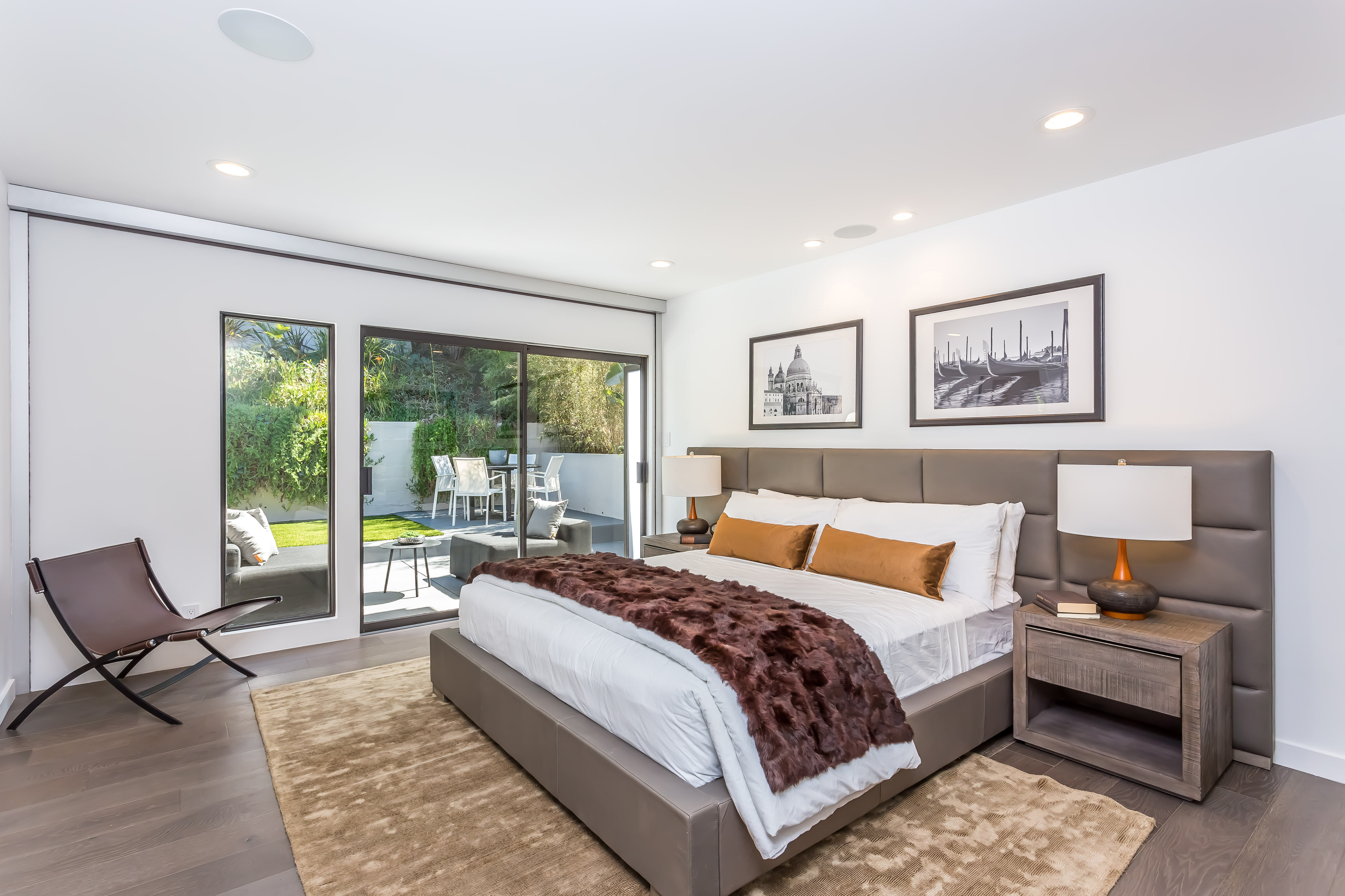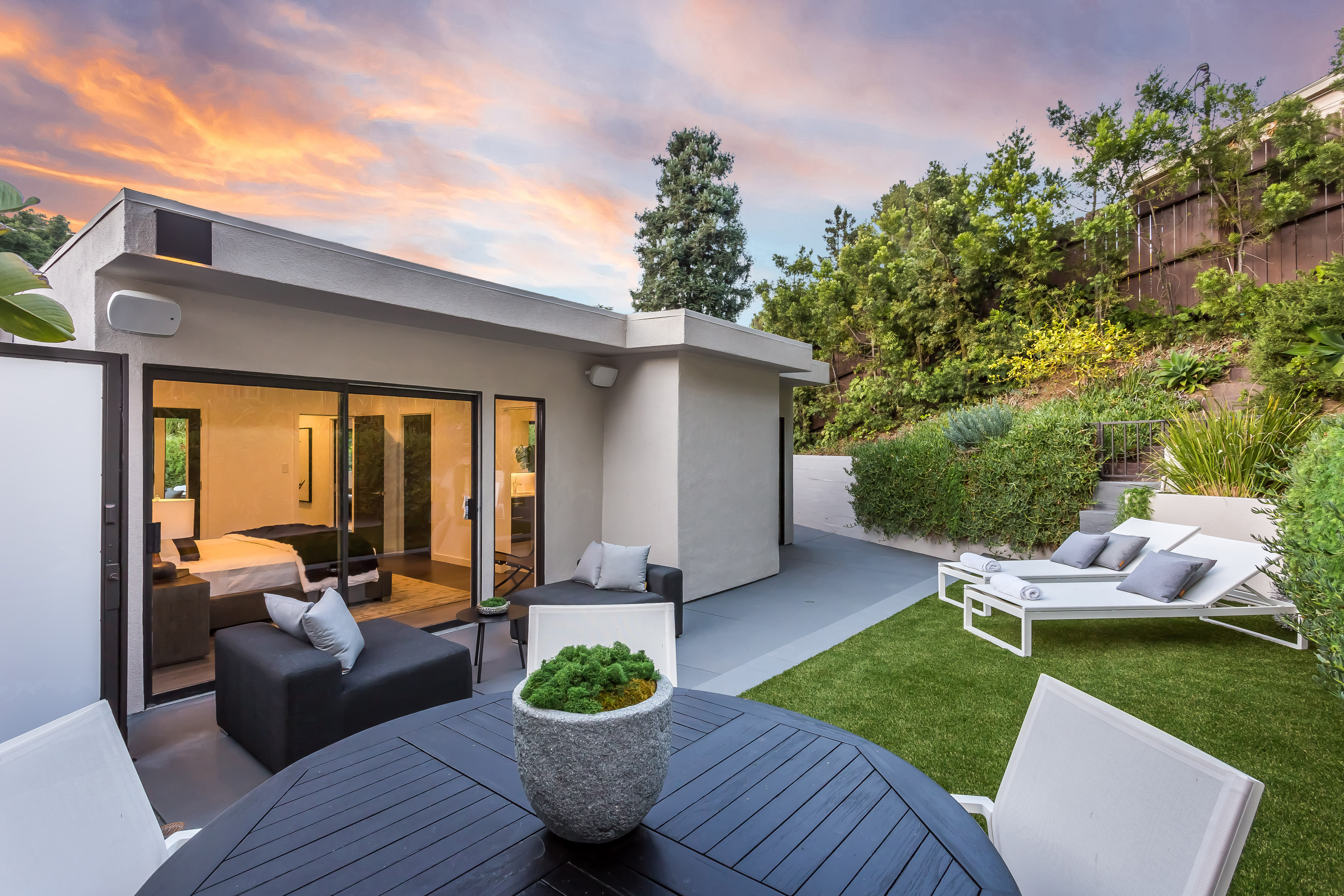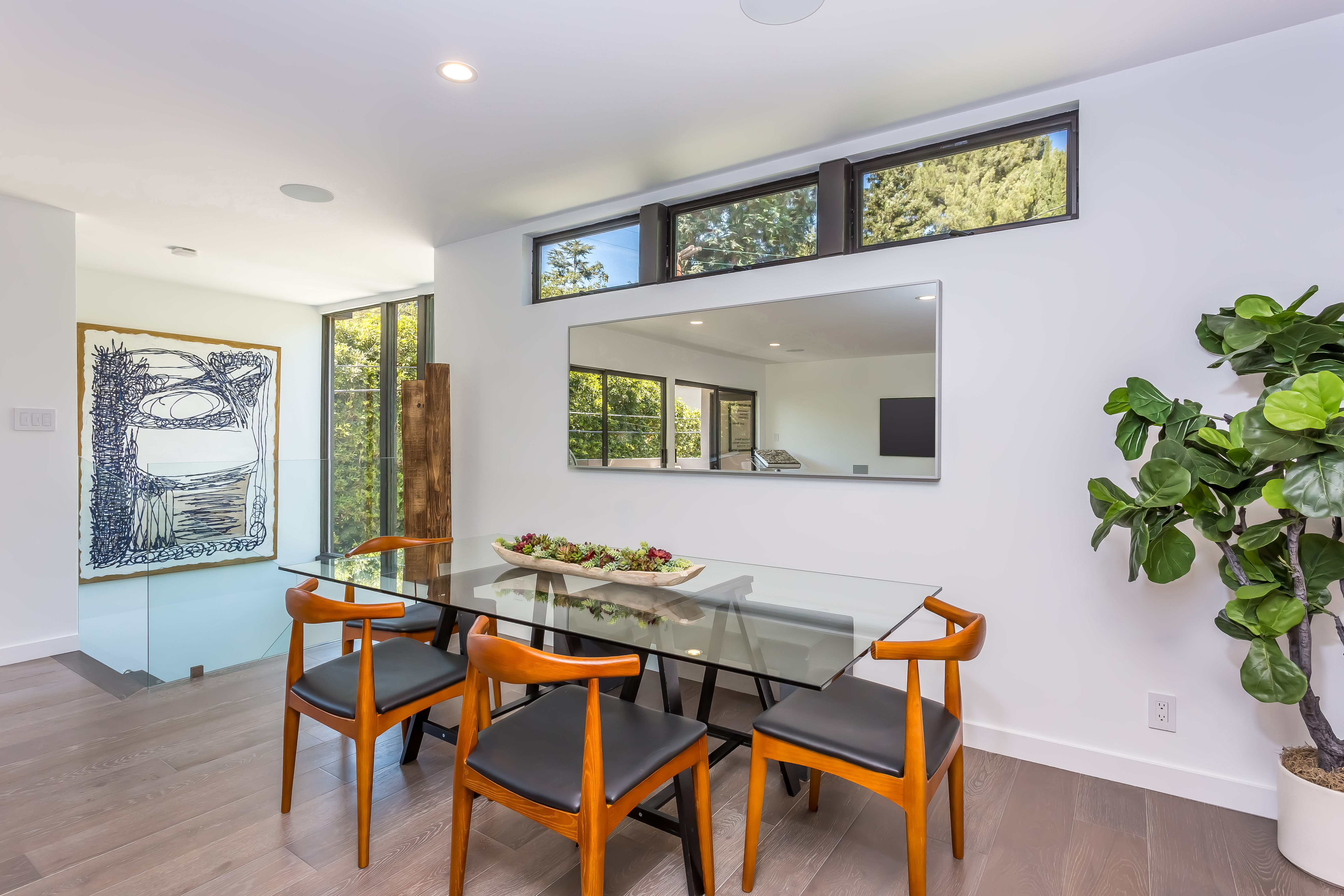 Stunning, sleek, stylish - this dramatic Mid-Century, 4 bed/3 bath home has been renovated throughout with meticulous attention to design and detail; every finish and texture selected for high-end form and function. The seamless indoor-outdoor flow creates inviting spaces for entertaining, while expansive windows maximize the lush, serene outlooks, with abundant natural light throughout. Enter through the dramatic, two-story foyer with terrazzo floors, steel and glass staircase leading to the open living spaces with hand-scraped European oak floors, European cabinetry, and quartz counters. The flexible, open-concept floor plan offers two bedrooms, two baths up, including owner's retreat with lavish-spa-like bath; two bedrooms, 1 bath down, including a custom-appointed guest suite with kitchenette, laundry and separate entrance, perfect for au-pair, in-law, home office or screening room. Generous two-car garage with ample storage has interior access to the home.