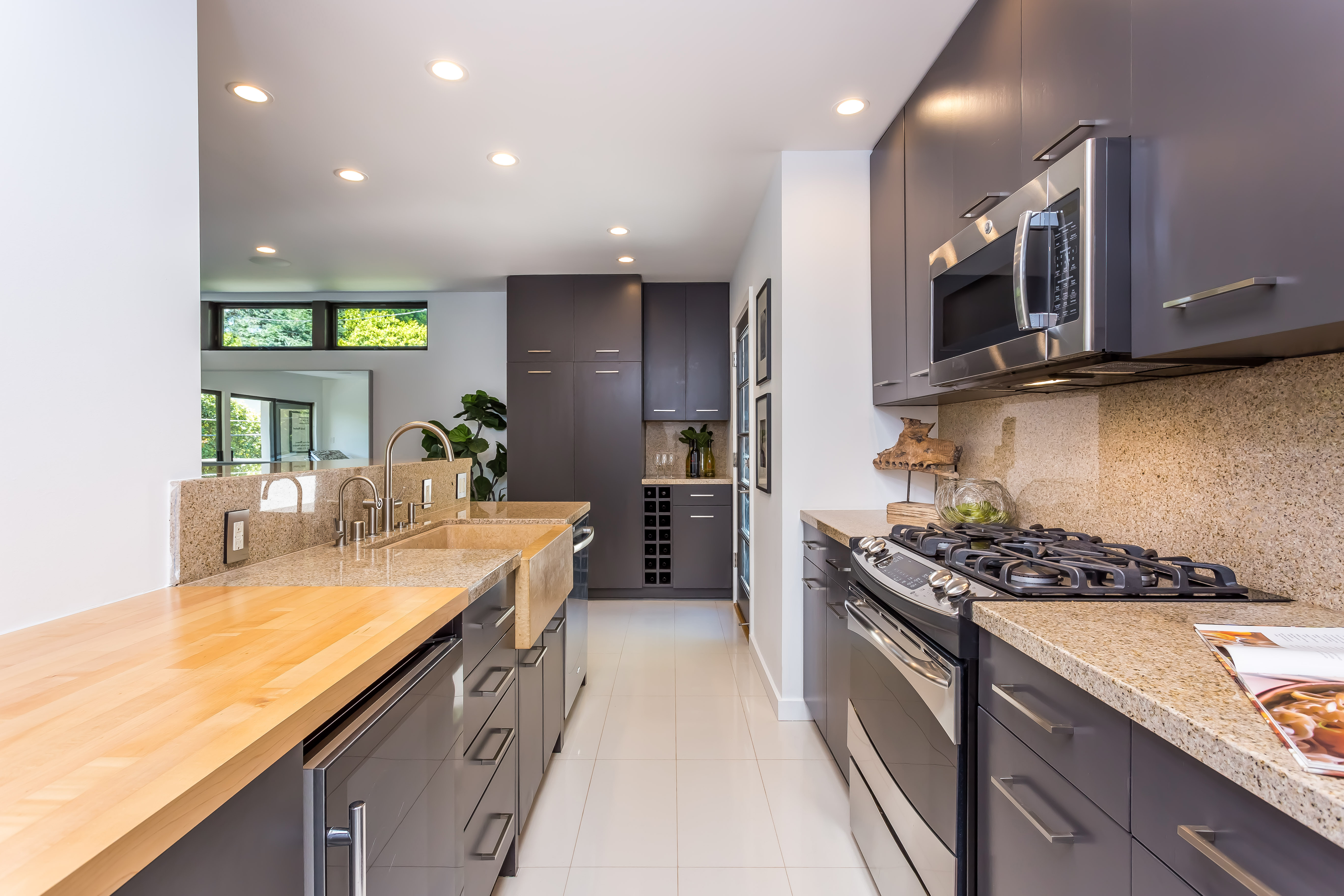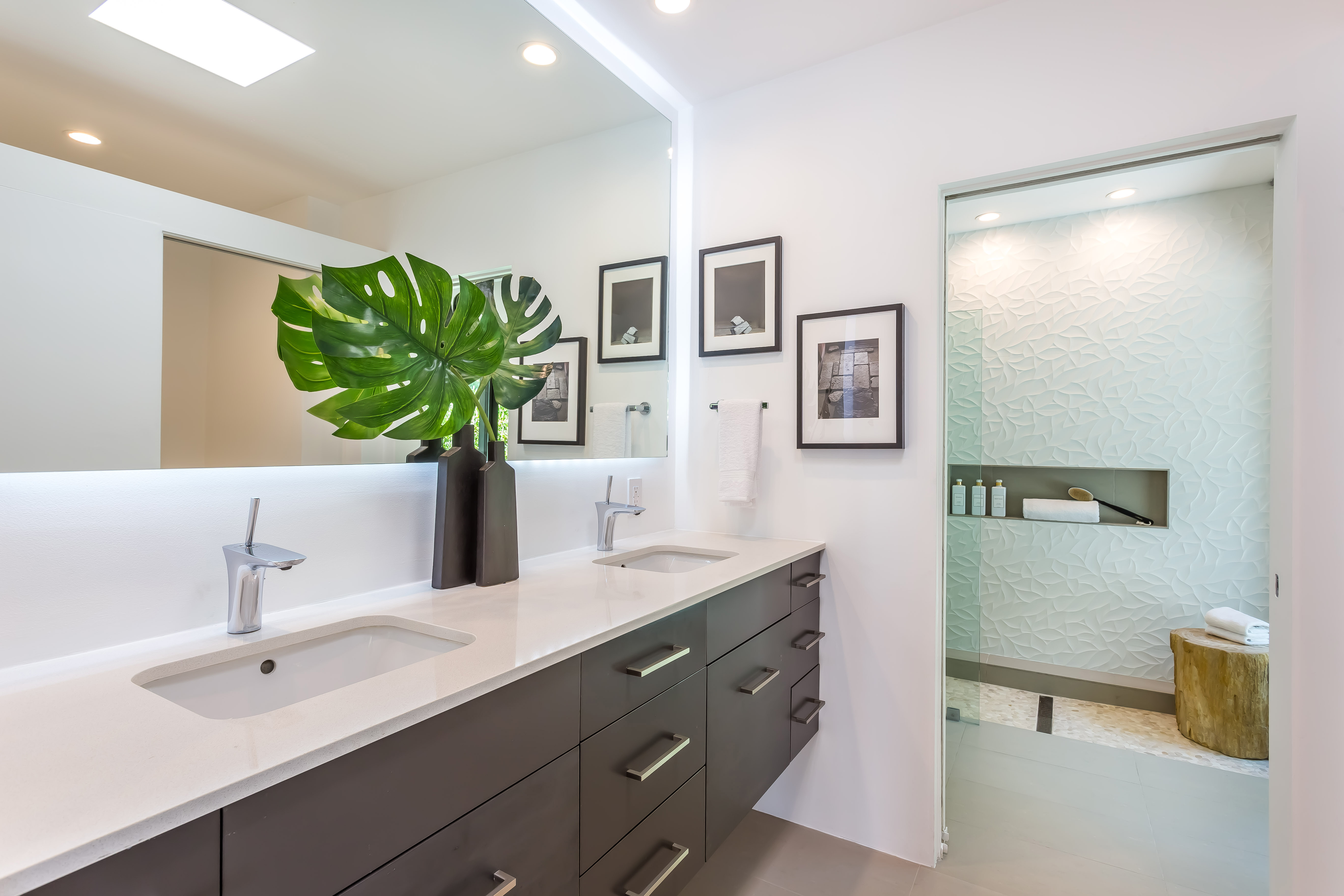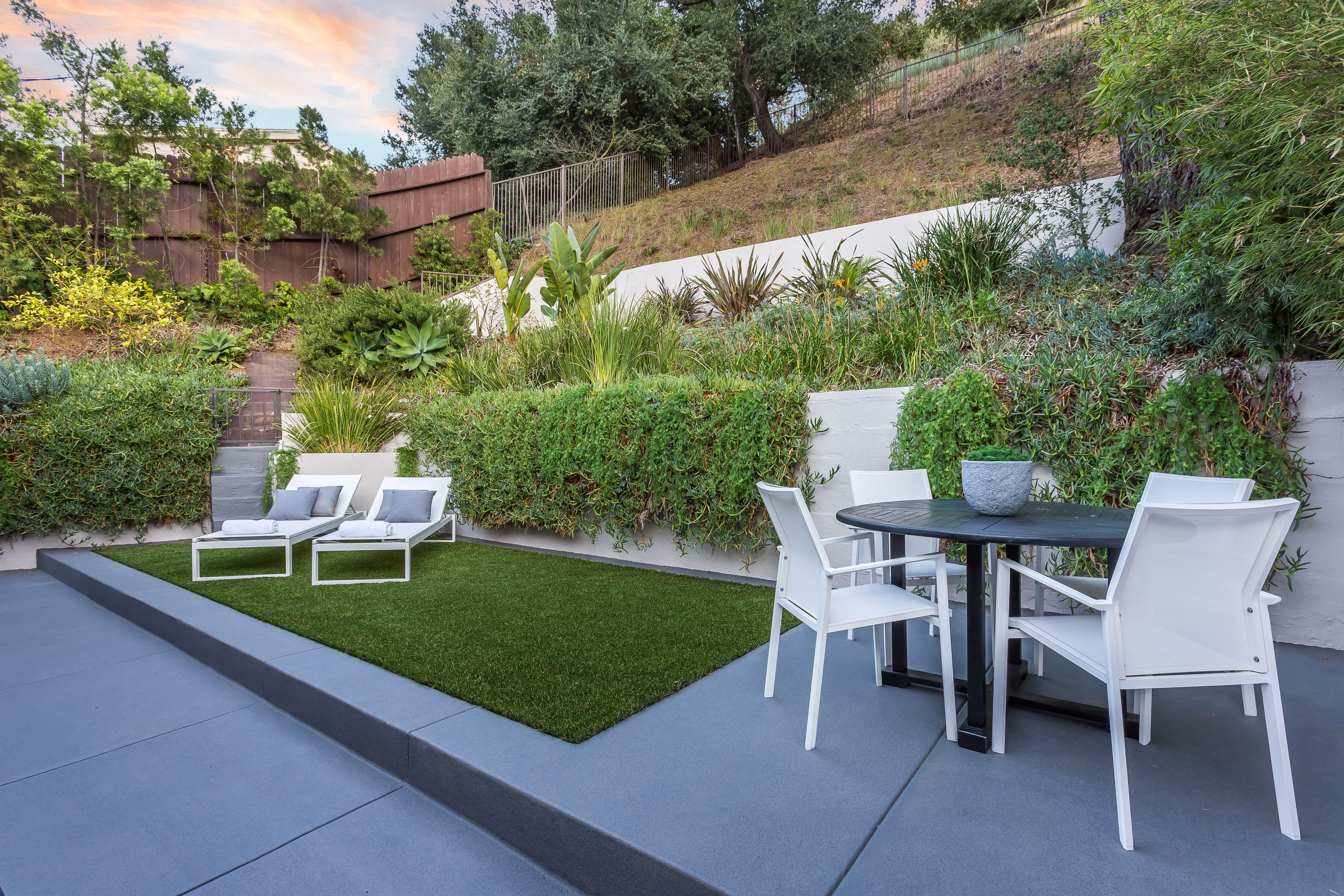 Stunning, sleek, stylish - this dramatic Mid-Century, 4 bed/3 bath home has been renovated throughout with meticulous attention to design and detail; every finish and texture selected for high-end form and function. The seamless indoor-outdoor flow creates inviting spaces for entertaining, while expansive windows maximize the lush, serene outlooks, with abundant natural light throughout. Enter through the dramatic, two-story foyer with terrazzo floors, steel and glass staircase leading to the open living spaces with hand-scraped European oak floors, European cabinetry, and quartz counters. The flexible, open-concept floor plan offers two bedrooms, two baths up, including owner's retreat with lavish-spa-like bath; two bedrooms, 1 bath down, including a custom-appointed guest suite with kitchenette, laundry and separate entrance, perfect for au-pair, in-law, home office or screening room. Generous two-car garage with ample storage has interior access to the home.