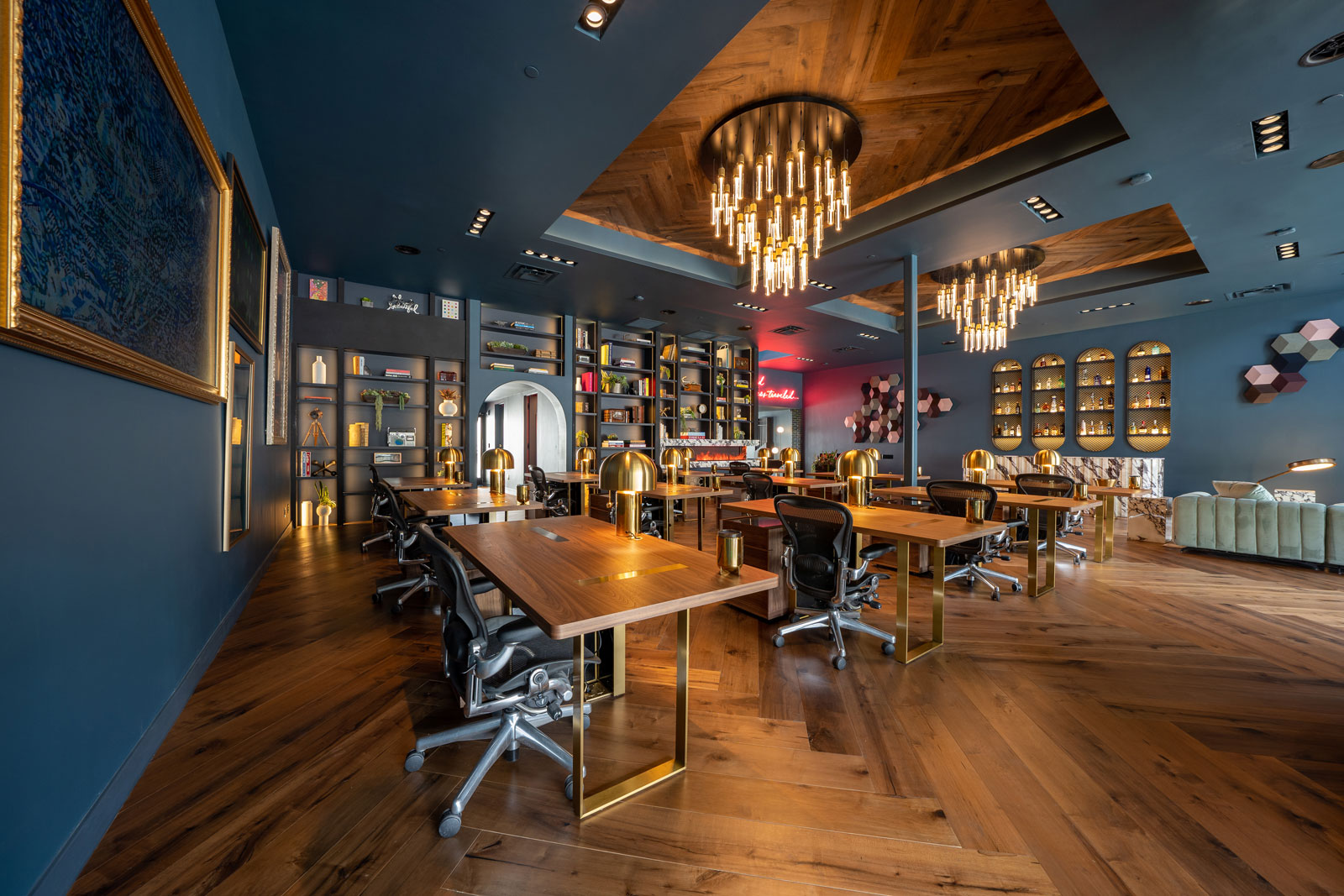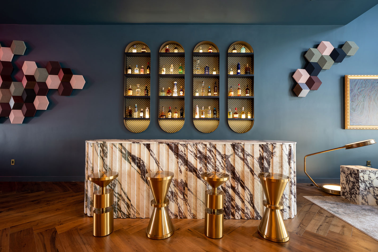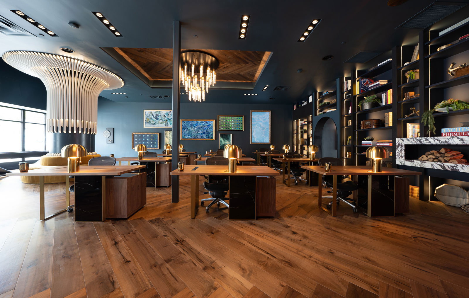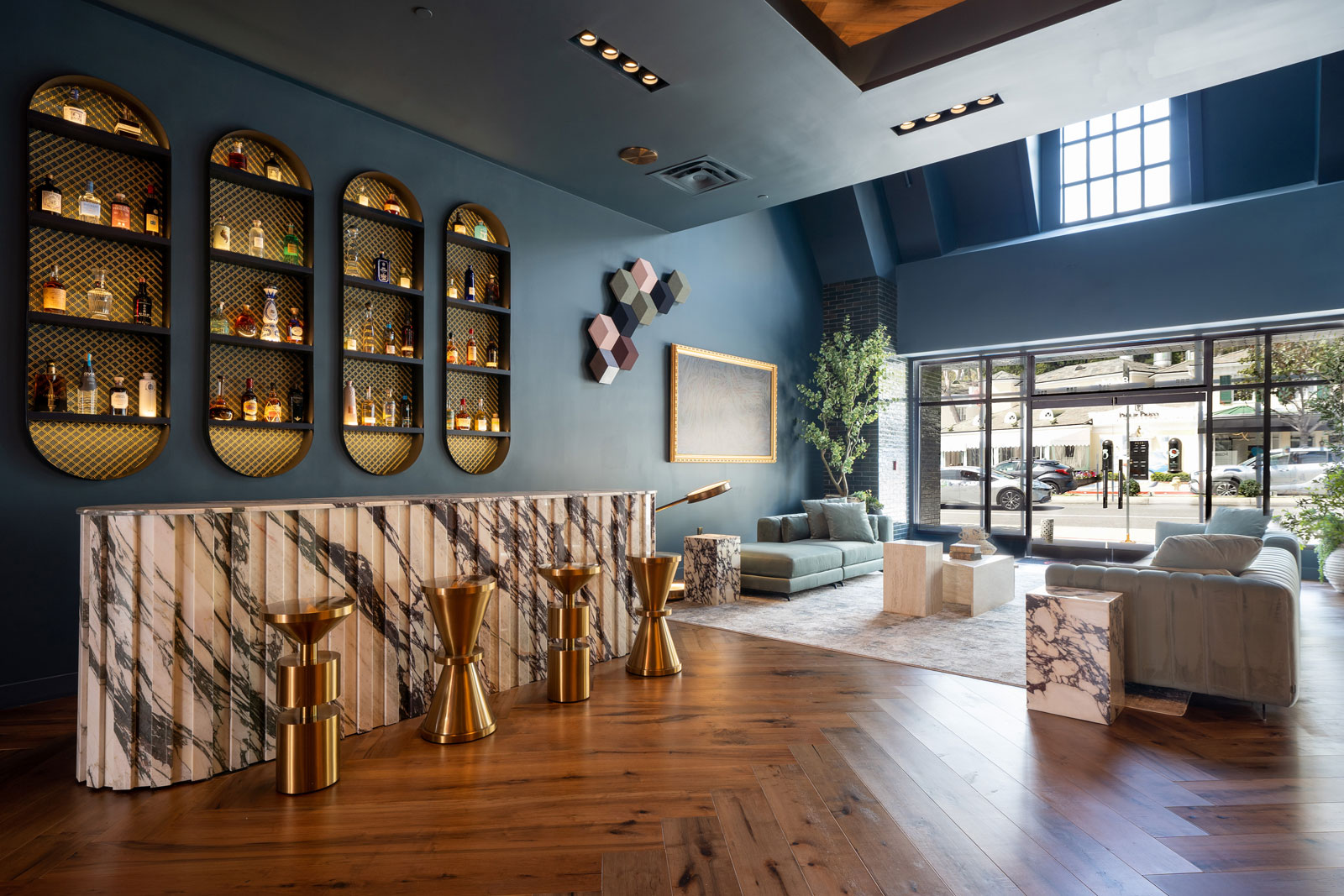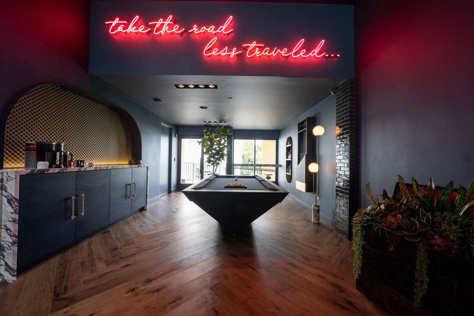 After nearly a decade, The Oppenheim Group moved out of its longtime Sunset Boulevard office into a bigger, more lavish space right next door. This open-space environment of this Flagship office takes inspiration from the rich colors and decadent details of Old Hollywood, paired with more modern touches to achieve an interesting mix of classic and contemporary styles. Herringbone flooring creates an ambiance of warmth and subtlety, and mint velvet sofas from Rove Concepts and moody Midnight Blue walls add some Old Hollywood-inspired drama to the space. A remarkable focal point is the large Calacatta Viola marble bar, exquisitely crafted to captivate attention. Additionally, a creative transformation of a six-foot-wide billboard pole into a circular sofa, crowned with luminescent white steel pipes, adds a touch of artistic innovation. To soften the ambiance, faux succulents are thoughtfully placed throughout the office, while a captivating gallery wall showcases Samsung Frame TVs, encased in vintage-style frames. Mushroom-shaped brass lamps from Buster + Punch grace each Augustus Desk by Rove Concepts. An angular 11 Ravens pool table rests in one corner of the office, along with a cozy Whiskey bar and some mood lighting. Adjacent to the workspace, a library wall features antique vellum-bound books and vintage radios sourced by Jason Oppenheim, plus a humidifying LED-lit fireplace that exudes a soft orange glow. An audio system from Bang and Olufsen produces sound that rivals any renowned club in Los Angeles. With double the space and a fresh new design, the LA office is a true testament of The Oppenheim Group’s success and a glimpse into its future.