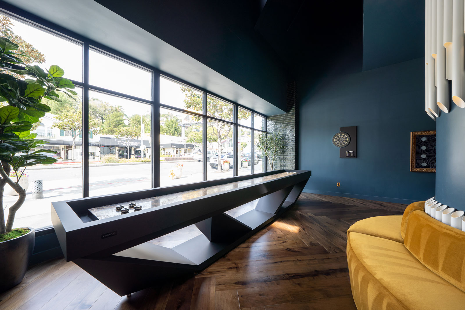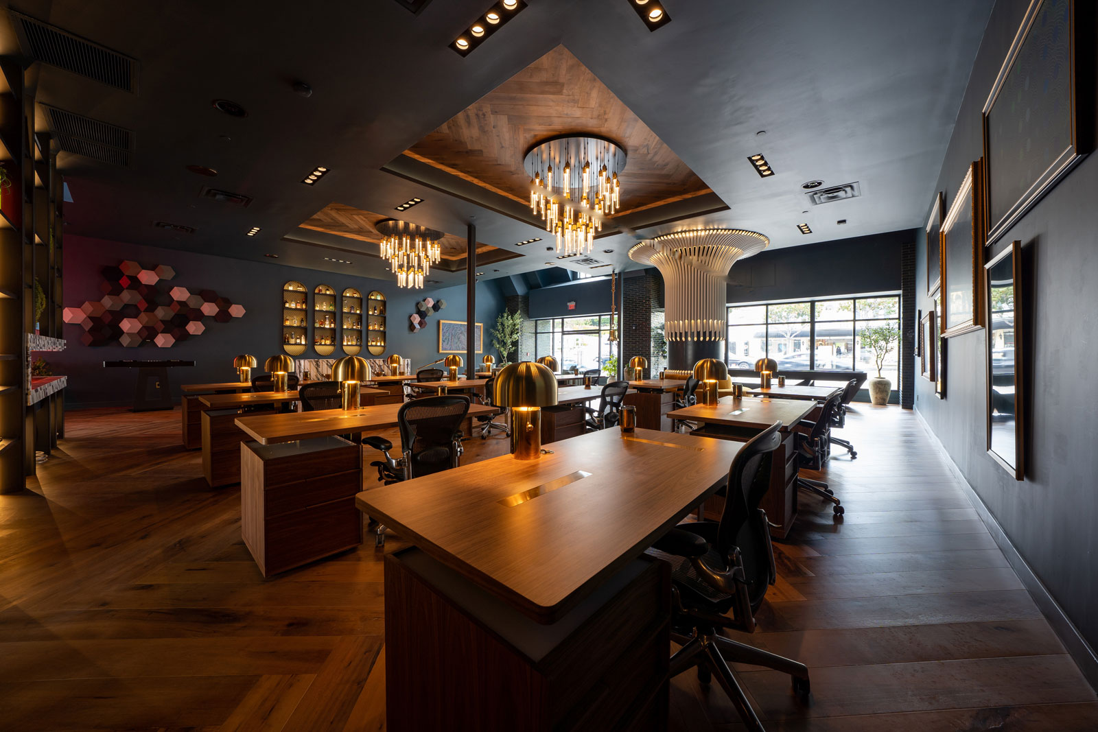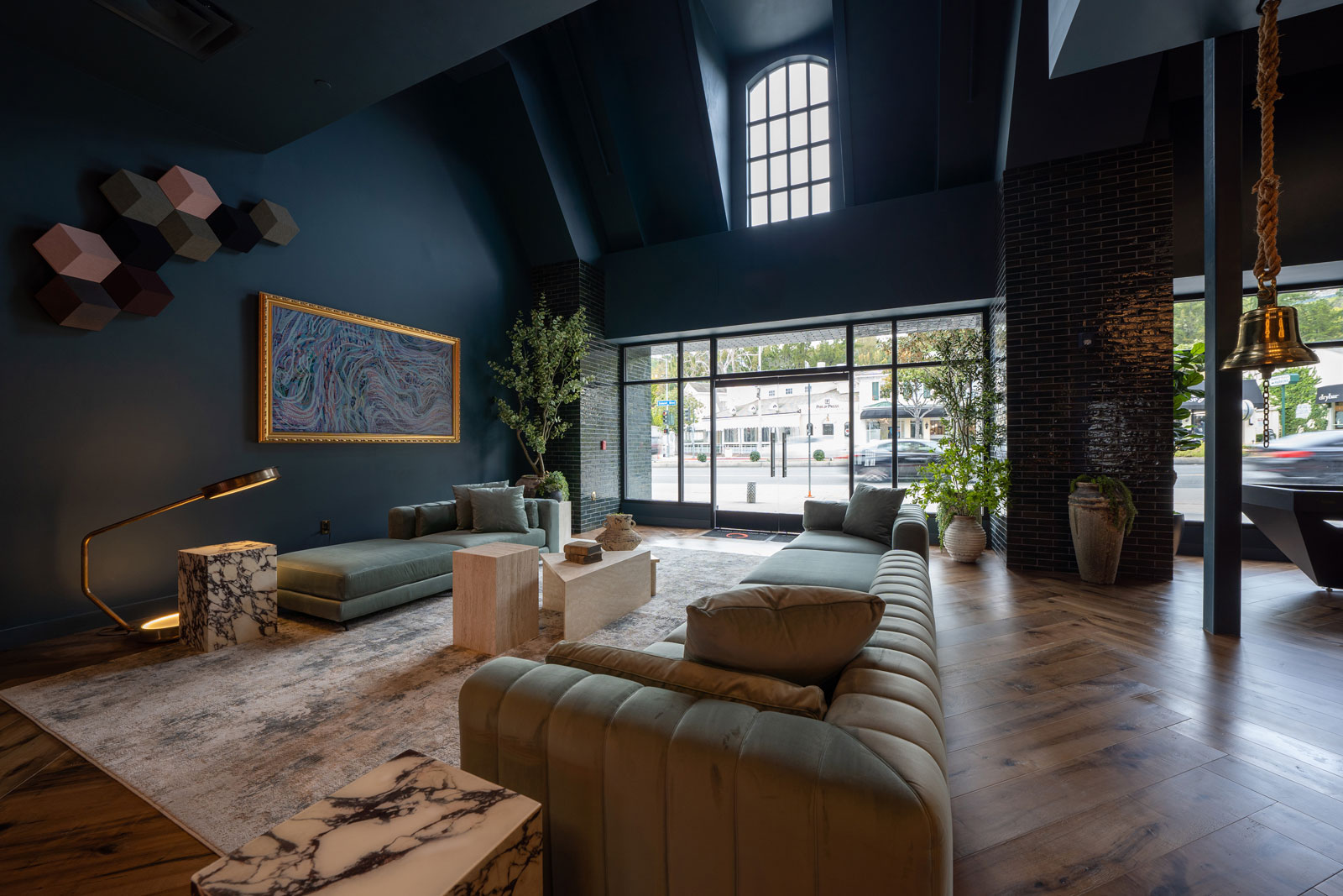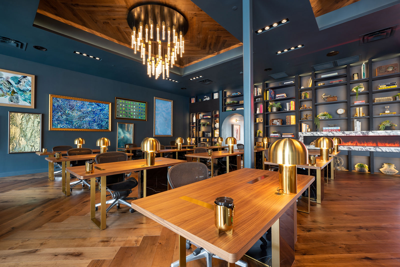 After nearly a decade, The Oppenheim Group moved out of its longtime Sunset Boulevard office into a bigger, more lavish space right next door. This open-space environment of this Flagship office takes inspiration from the rich colors and decadent details of Old Hollywood, paired with more modern touches to achieve an interesting mix of classic and contemporary styles. Herringbone flooring creates an ambiance of warmth and subtlety, and mint velvet sofas from Rove Concepts and moody Midnight Blue walls add some Old Hollywood-inspired drama to the space. A remarkable focal point is the large Calacatta Viola marble bar, exquisitely crafted to captivate attention. Additionally, a creative transformation of a six-foot-wide billboard pole into a circular sofa, crowned with luminescent white steel pipes, adds a touch of artistic innovation. To soften the ambiance, faux succulents are thoughtfully placed throughout the office, while a captivating gallery wall showcases Samsung Frame TVs, encased in vintage-style frames. Mushroom-shaped brass lamps from Buster + Punch grace each Augustus Desk by Rove Concepts. An angular 11 Ravens pool table rests in one corner of the office, along with a cozy Whiskey bar and some mood lighting. Adjacent to the workspace, a library wall features antique vellum-bound books and vintage radios sourced by Jason Oppenheim, plus a humidifying LED-lit fireplace that exudes a soft orange glow. An audio system from Bang and Olufsen produces sound that rivals any renowned club in Los Angeles. With double the space and a fresh new design, the LA office is a true testament of The Oppenheim Group’s success and a glimpse into its future.