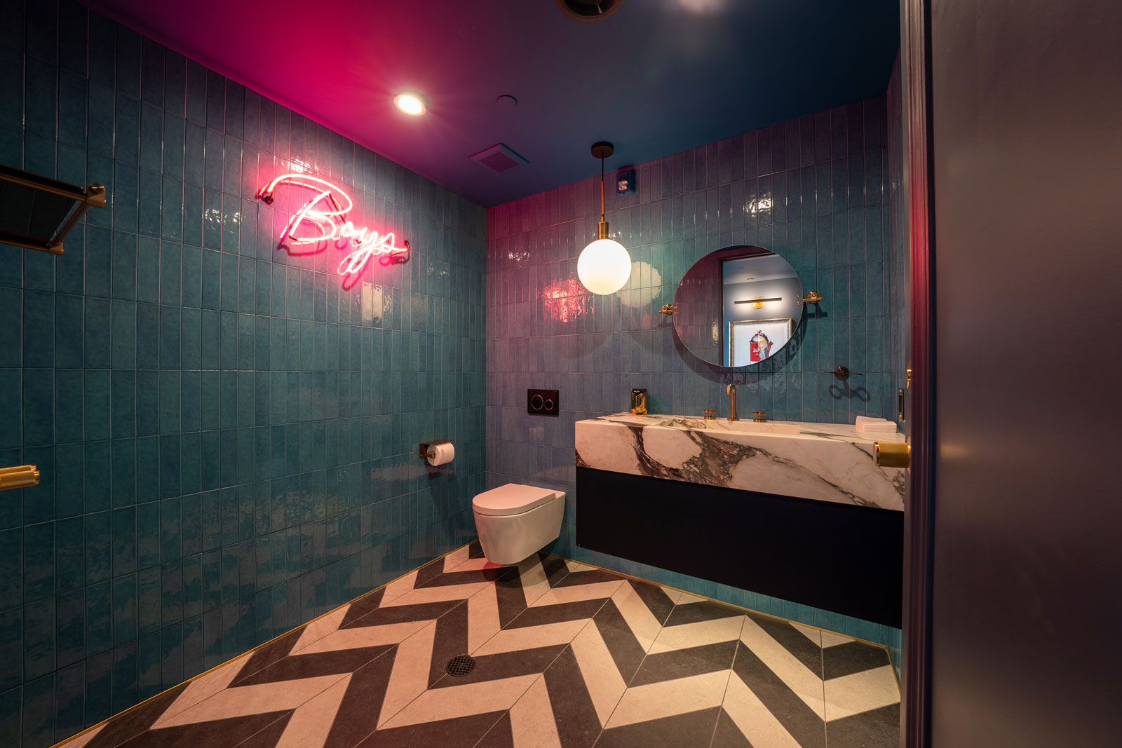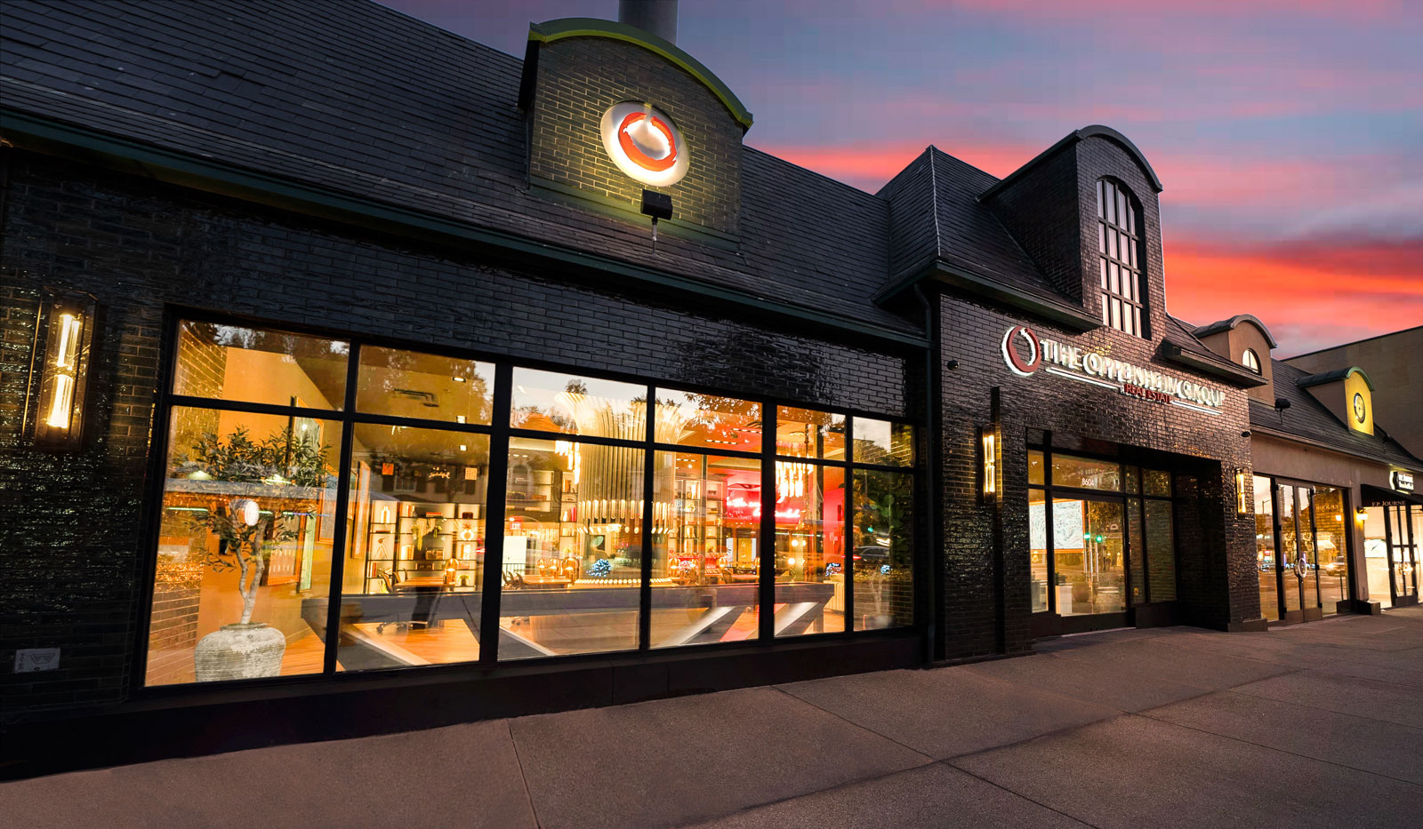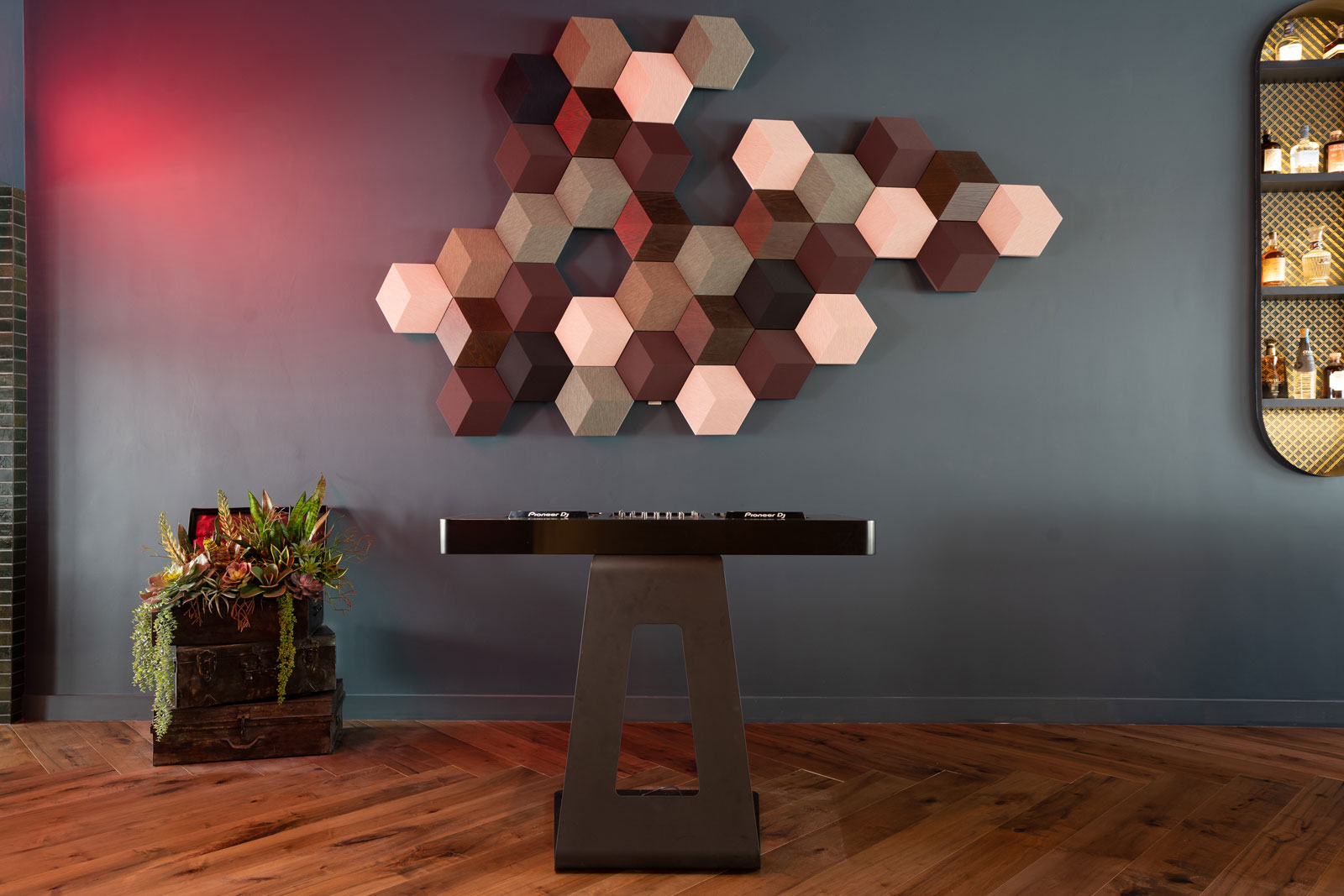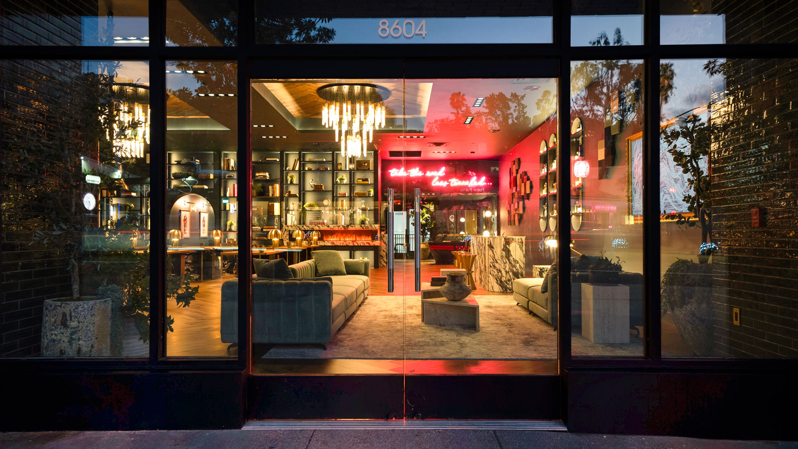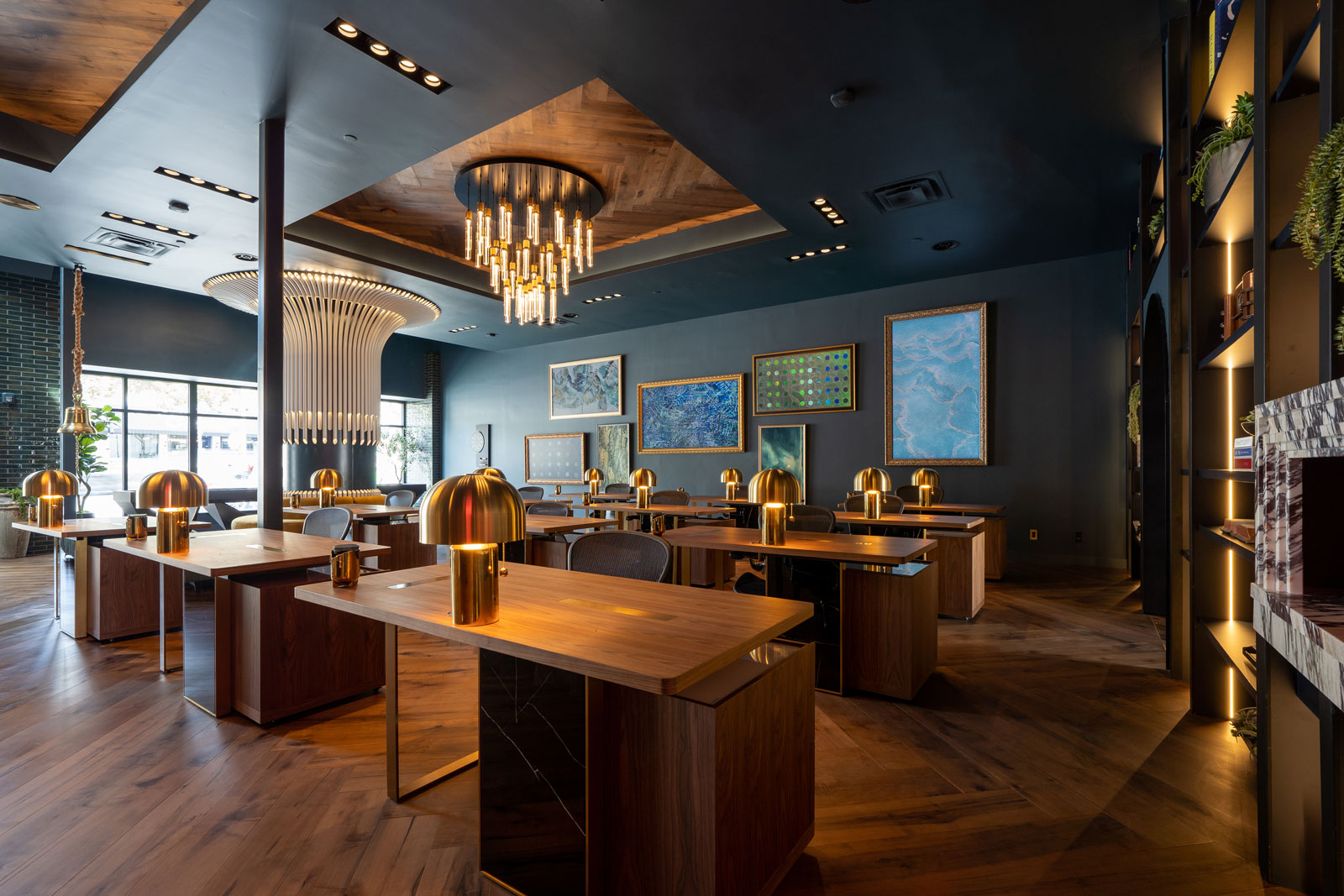 After nearly a decade, The Oppenheim Group moved out of its longtime Sunset Boulevard office into a bigger, more lavish space right next door. This open-space environment of this Flagship office takes inspiration from the rich colors and decadent details of Old Hollywood, paired with more modern touches to achieve an interesting mix of classic and contemporary styles. Herringbone flooring creates an ambiance of warmth and subtlety, and mint velvet sofas from Rove Concepts and moody Midnight Blue walls add some Old Hollywood-inspired drama to the space. A remarkable focal point is the large Calacatta Viola marble bar, exquisitely crafted to captivate attention. Additionally, a creative transformation of a six-foot-wide billboard pole into a circular sofa, crowned with luminescent white steel pipes, adds a touch of artistic innovation. To soften the ambiance, faux succulents are thoughtfully placed throughout the office, while a captivating gallery wall showcases Samsung Frame TVs, encased in vintage-style frames. Mushroom-shaped brass lamps from Buster + Punch grace each Augustus Desk by Rove Concepts. An angular 11 Ravens pool table rests in one corner of the office, along with a cozy Whiskey bar and some mood lighting. Adjacent to the workspace, a library wall features antique vellum-bound books and vintage radios sourced by Jason Oppenheim, plus a humidifying LED-lit fireplace that exudes a soft orange glow. An audio system from Bang and Olufsen produces sound that rivals any renowned club in Los Angeles. With double the space and a fresh new design, the LA office is a true testament of The Oppenheim Group’s success and a glimpse into its future.
